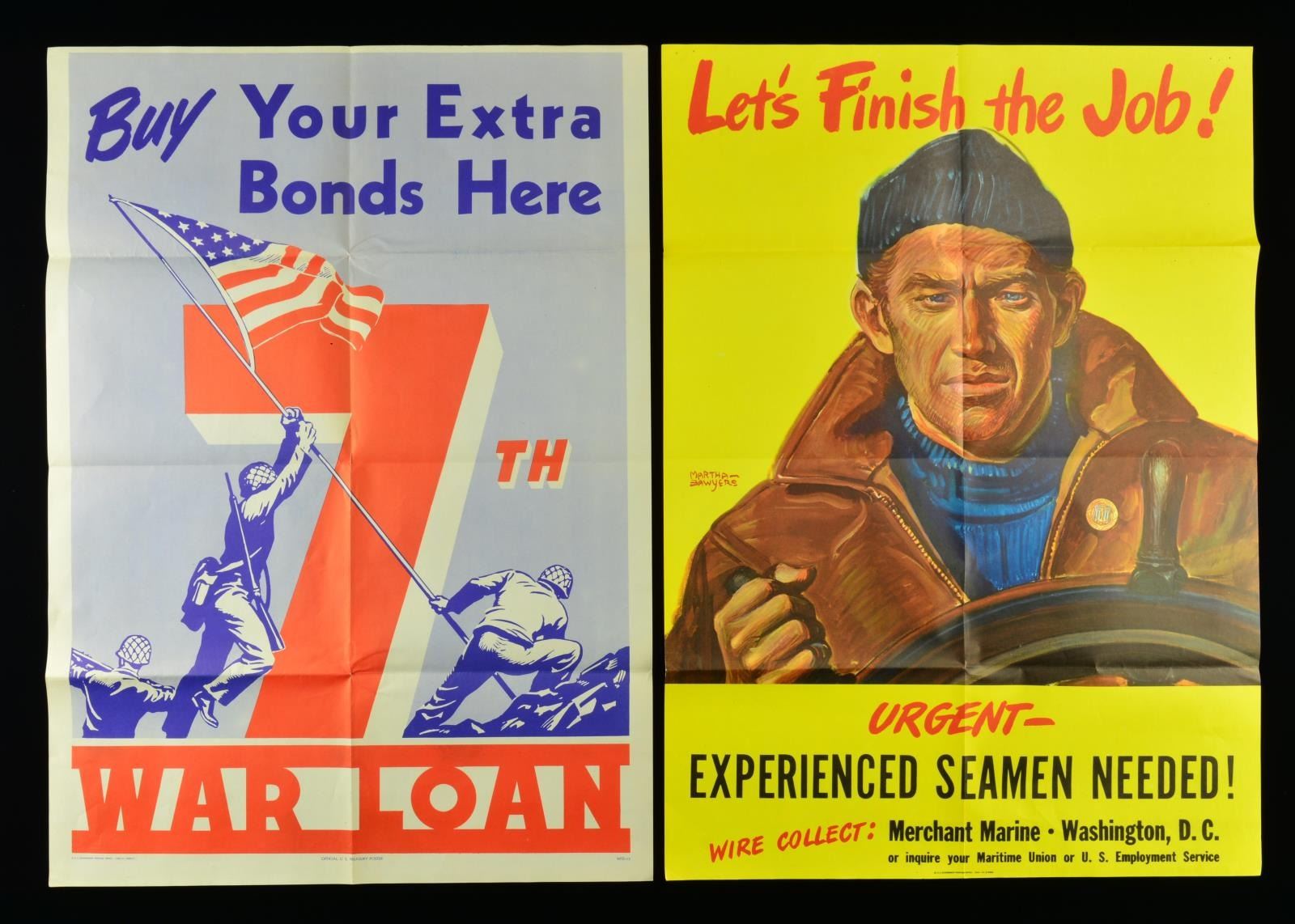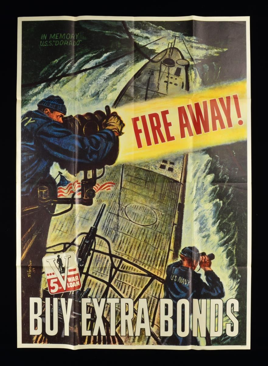 2) This poster measures approx. 40" x 28". The poster depicts a surfaced submarine w/ US Navy sailors signaling & watching w/ binoculars. The poster reads in part, "FIRE AWAY! 5TH WAR LOAN BUY EXTRA BONDS”. Poster is marked at the base, “U.S. GOVERNMENT PRINTING OFFICE : 1944”.