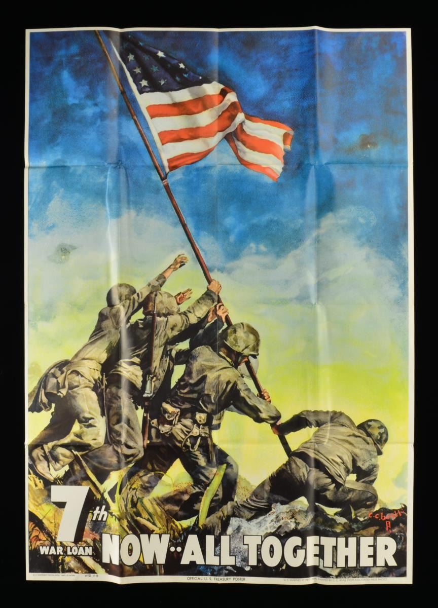 1) This poster measures approx. 37" x 26". The poster depicts the Marines raising the United States flag on Mt. Suribachi. The poster reads in part, "7TH WAR LOAN NOW ALL TOGETHER”. Poster is marked at the base, “U.S. GOVERNMENT PRINTING OFFICE : 1945”.