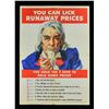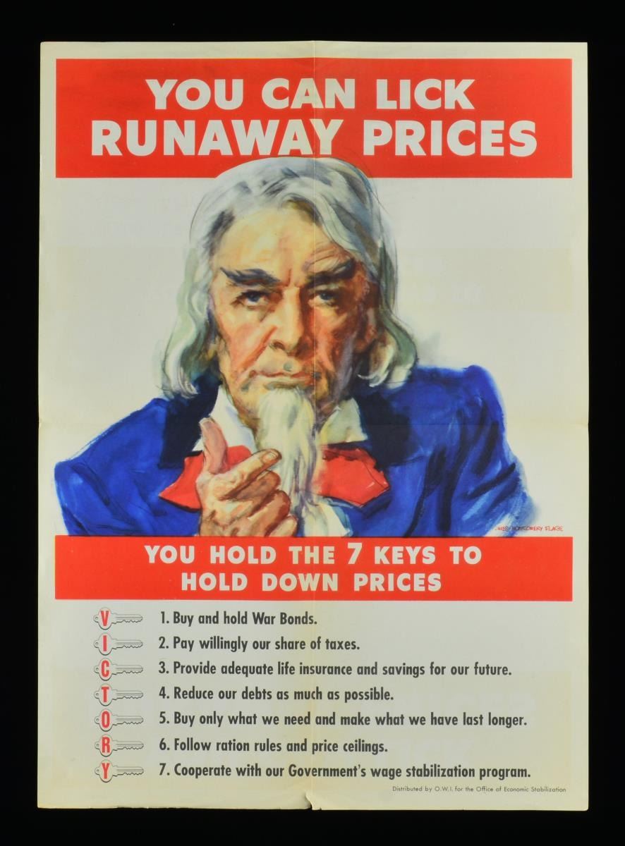 5) This poster measures approx. 23" x 16". The poster depicts Uncle Sam. The poster reads in part, "YOU CAN LICK RUNAWAY PRICES YOU HOLD THE 7 KEYS TO HOLD DOWN PRICES”. Poster is marked at the base, “DISTRIBUTED BY O.W.I. FOR THE OFFICE OF ECONOMIC STABILIZATION”. Poster has a sm. tear at the lower edge. CONDITION: all posters show very light wear. Posters have been folded & show creases but no damage unless noted above. All measurements are to the nearest inch. (02-15804-4/BF). $500-800.