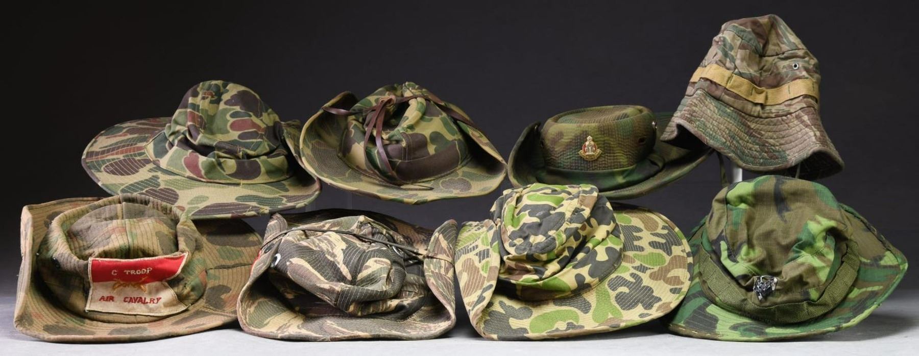 Group of 6 bush hats and 2 boonie hats of varying camouflage patterns. One hat with a "READY RELIABLE EXACT", one with an embroidered flag that reads "C TROOP/ (CROSSED SWORDS)/ AIR CAVALRY", and 1 with an embroidered patch that reads "VIET-NAM/ TUY-HOA". CONDITION: hats exhibit various degrees of wear and fading, but remain sturdy and serviceable. (02-20925/MLW). $500-800.