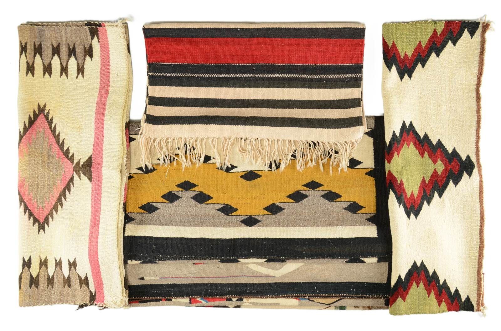 Ranging in size from 36" x 70", 45" x 56", 36" x 58", 34" x 46", 27" x 56", & 37" x 60". Nice assortment of different patterns. CONDITION: 4 of 6 are good overall, 2 have holes and insect damage. PROVENANCE: Martin Lane Historic & Western Americana Lifetime Collection. (02-21401, 02-21402, 02-21403, 02-21404, 02-21405, 02-21406/JS). $800-1,200.