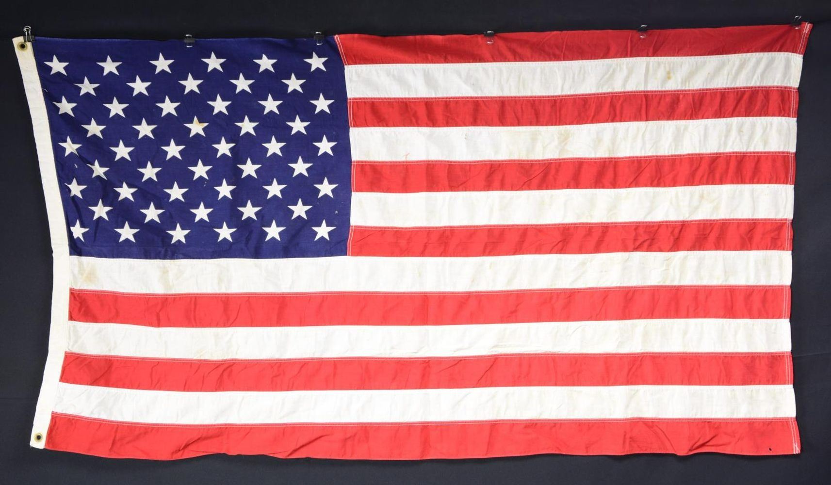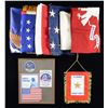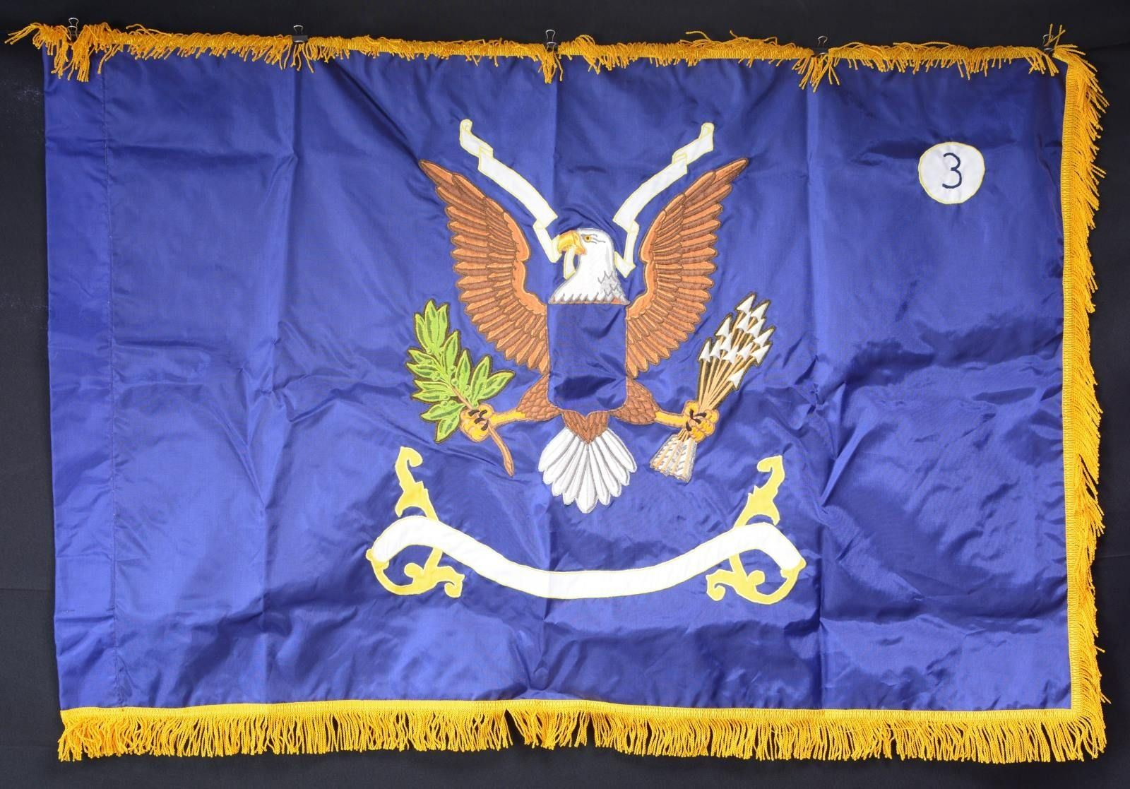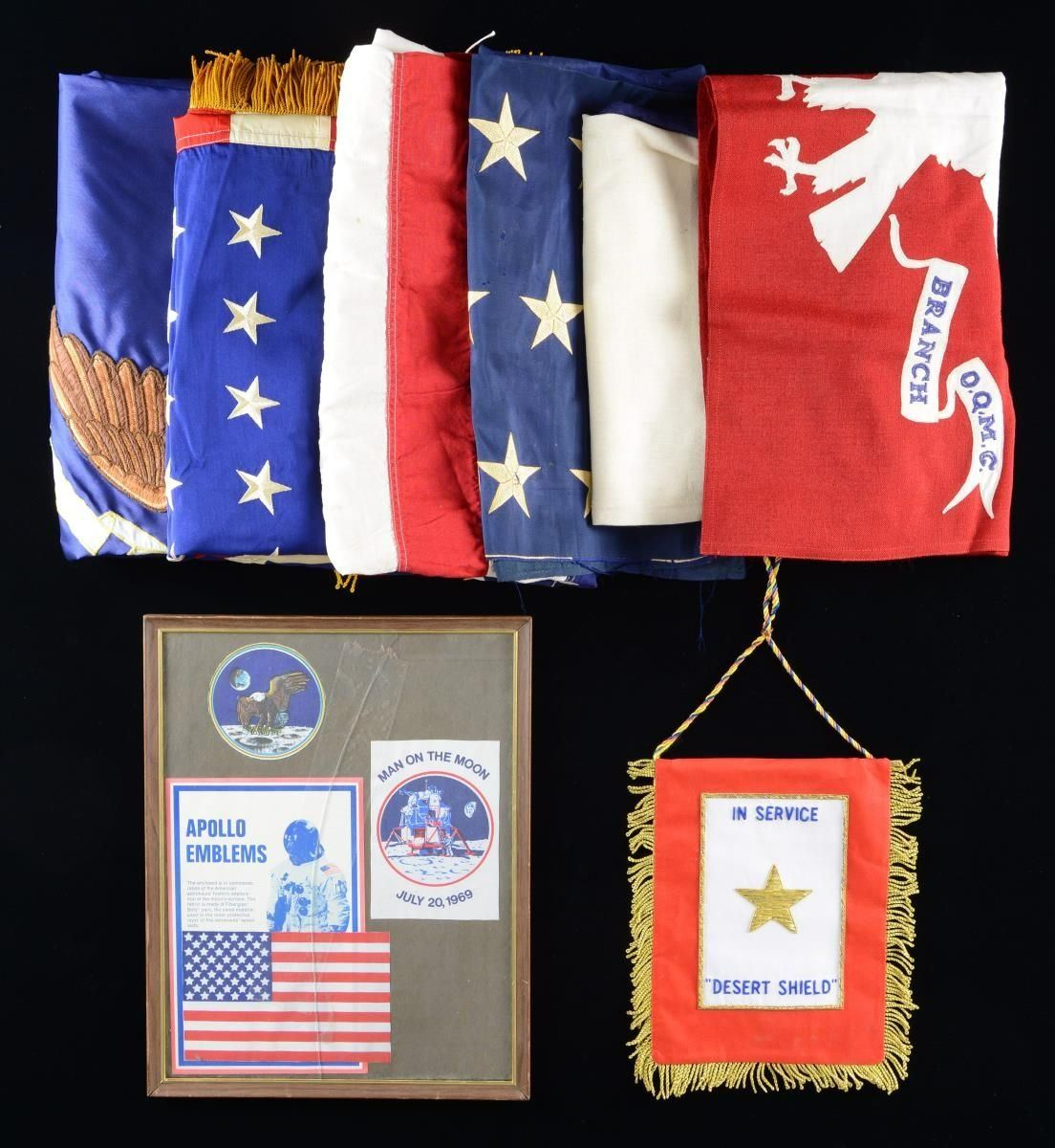 1. 3' x 4' unfinished infantry organizational flag, no unit on ribbon, no crest on shield 2. 31” x 28” 46 star canton from larger American flag, 46 star represents Oklahoma which became a state July 4th 1908 and it was official until 2012, when Arizona and New Mexico became states. 3. 3' x 4' regulation War Department issue 48 star flag, this one has tag from Fort Dix. 48 star flags became obsolete with the 49th state in 1959. 4. 18” x 28” red wool bunting guidon, white cotton double applique “REQUIREMENTS BRANCH, Office of Quartermaster General”, Philadelphia depot label inside sleeve. 5. Small Gold Star service flag “DESERT SHIELD”, high quality with gold fringe. 6. 4x6” 50 star flag and two Apollo patches framed, all made with “fiberglass-beta”, the same material used as outer protective wear on Apollo space suits. 7. 32” x 56” 50 star US flag, all cotton, 8. 47” x 57” unknown, blue over white, “VI” double applique Insignia, all cotton, sleeve hoist. CONDITION: good to very good overall, 50 star flag is soiled and stained. (02-19982-8/JS). $200-400.