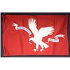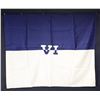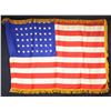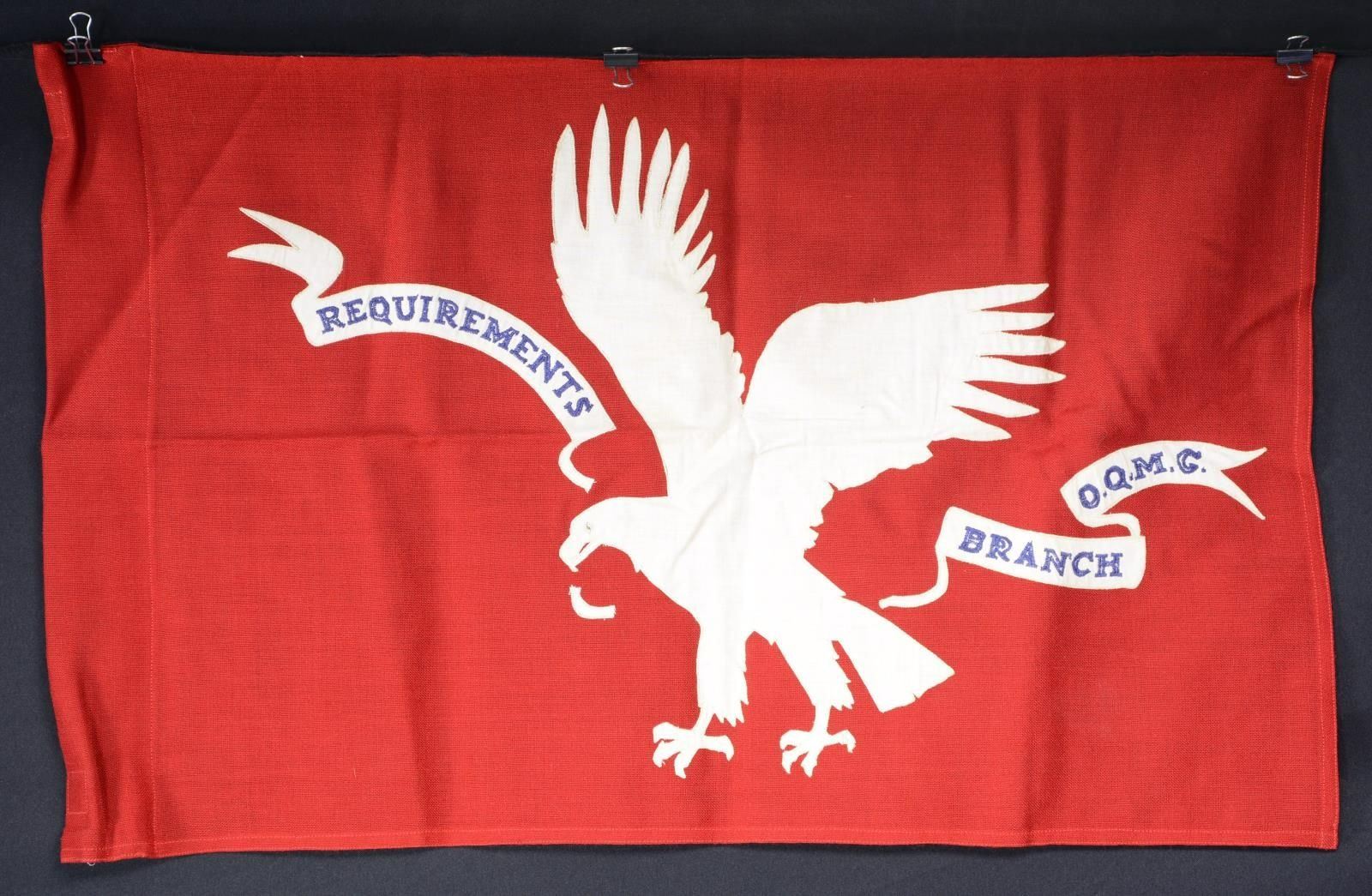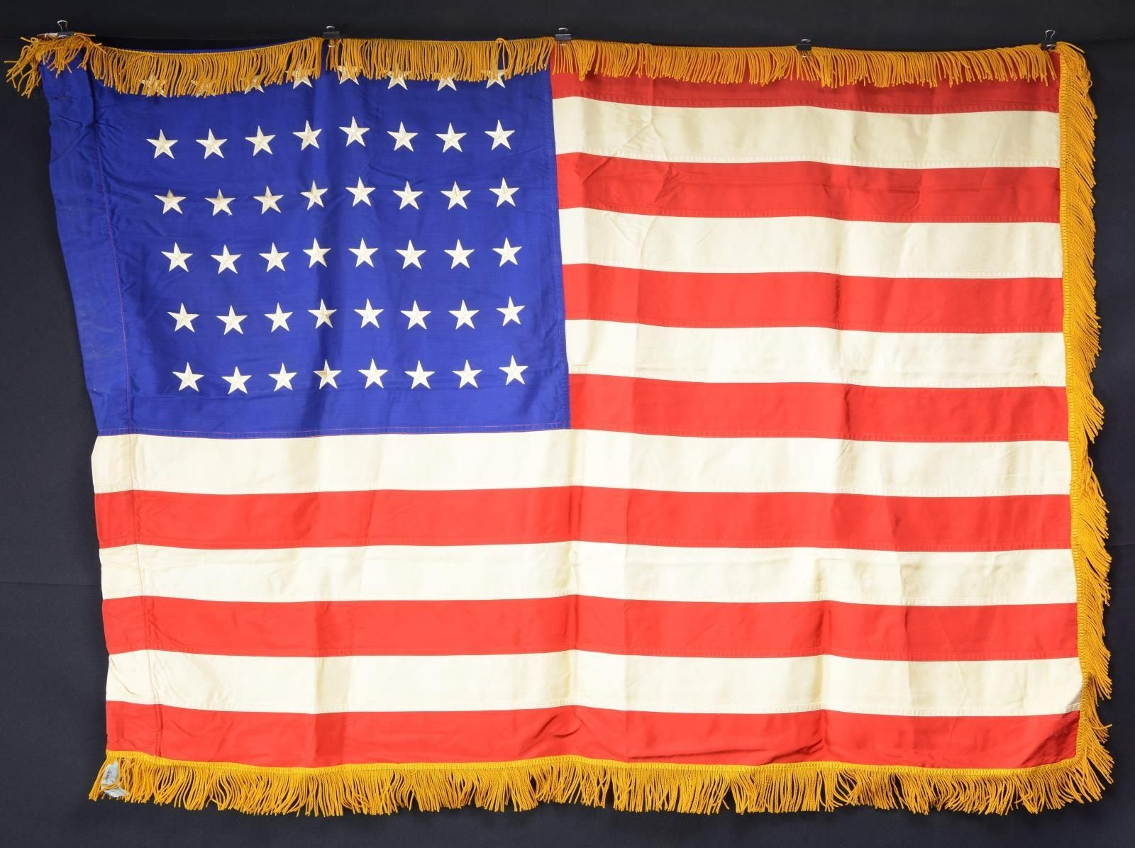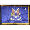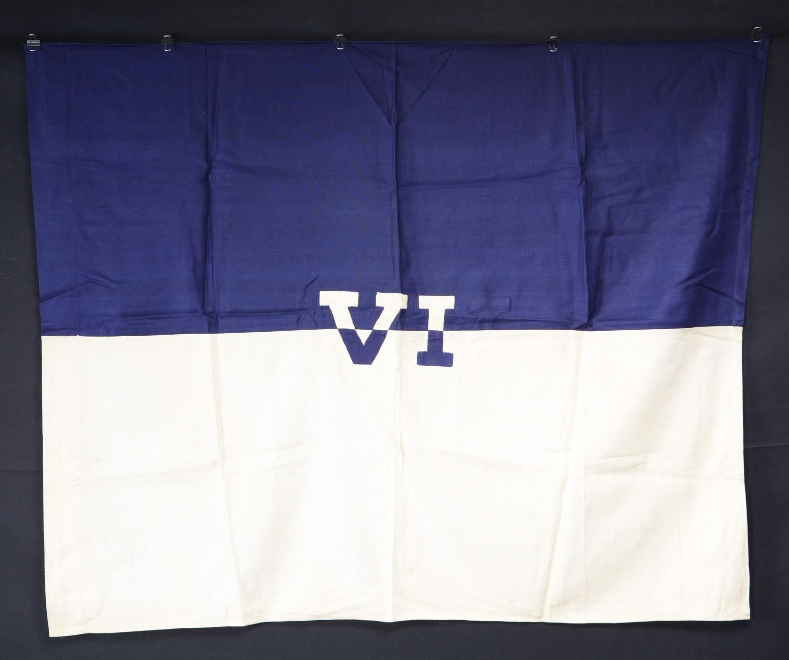 1. 3' x 4' unfinished infantry organizational flag, no unit on ribbon, no crest on shield 2. 31” x 28” 46 star canton from larger American flag, 46 star represents Oklahoma which became a state July 4th 1908 and it was official until 2012, when Arizona and New Mexico became states. 3. 3' x 4' regulation War Department issue 48 star flag, this one has tag from Fort Dix. 48 star flags became obsolete with the 49th state in 1959. 4. 18” x 28” red wool bunting guidon, white cotton double applique “REQUIREMENTS BRANCH, Office of Quartermaster General”, Philadelphia depot label inside sleeve. 5. Small Gold Star service flag “DESERT SHIELD”, high quality with gold fringe. 6. 4x6” 50 star flag and two Apollo patches framed, all made with “fiberglass-beta”, the same material used as outer protective wear on Apollo space suits. 7. 32” x 56” 50 star US flag, all cotton, 8. 47” x 57” unknown, blue over white, “VI” double applique Insignia, all cotton, sleeve hoist. CONDITION: good to very good overall, 50 star flag is soiled and stained. (02-19982-8/JS). $200-400.