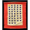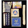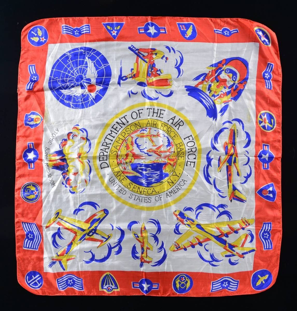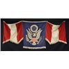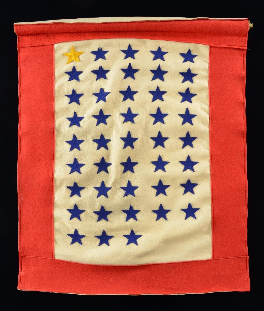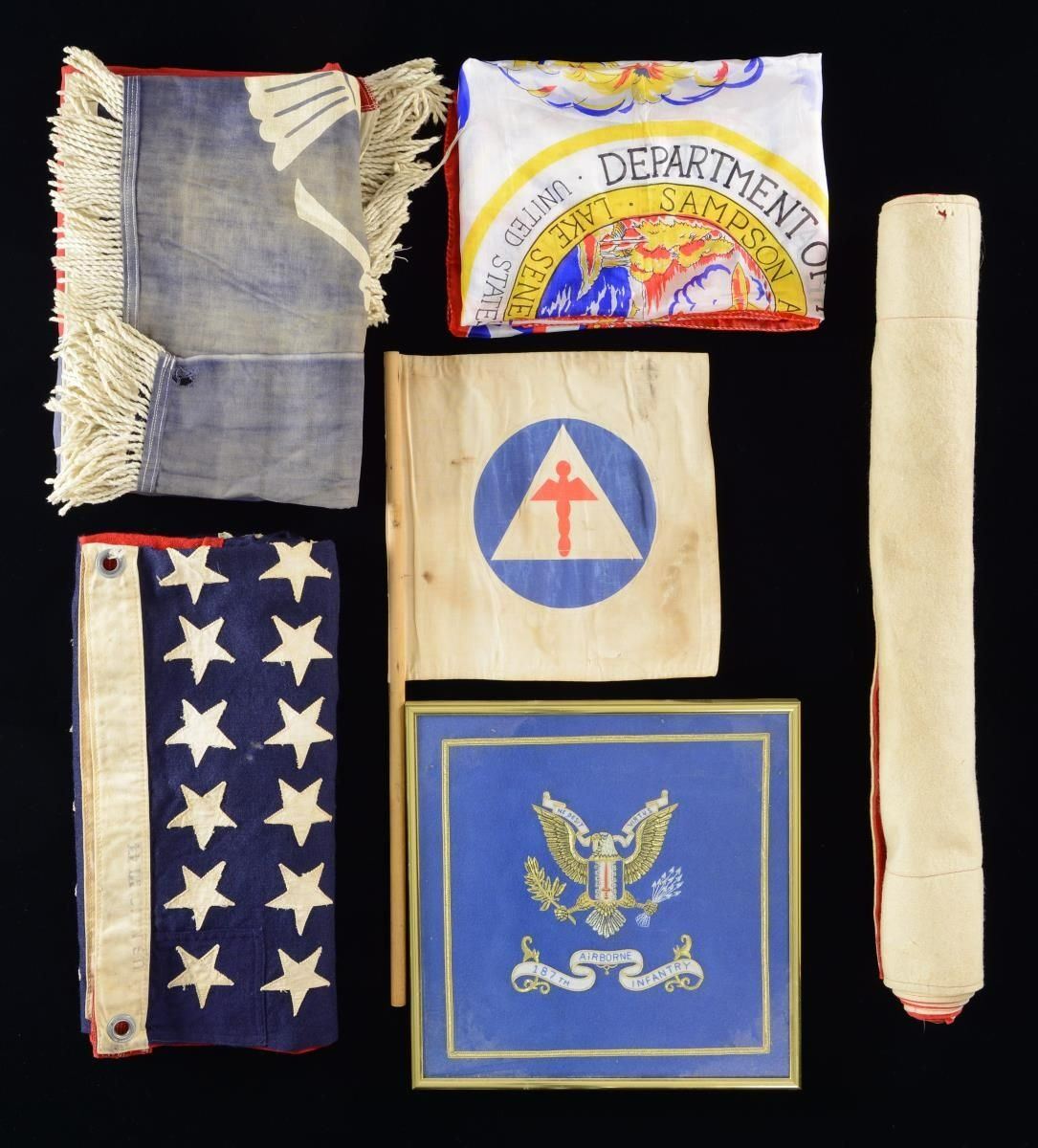 1. 10” x 10” double applique “Office of Civilian Protection” flag tacked to stick. 2. 26” x 23” service flag with 42 blue stars for men in action, one Gold Star for casualty, San Francisco makers label on reverse, top sleeve with rod for hanging. 3. 31” x 60” 48 star naval flag, all sewn wool bunting stripes, double applique cotton stars, “U.S. No. 10 MI 44” stenciled on hoist, 3 pewter grommets. 4. Podium banner, white fringe, 100” leading edge with small steel grommets, 34” height. 5. 32” x 32” sheer handkerchief with Army Air Corps insignia, souvenir from Sampson Air Force Base (1950s) 6. 11” x 11” “187th Airborne Infantry” embroidered framed plaque. 187th had its roots in World War 2, but obtained this designation in 1949. CONDITION: good overall. (02-19982-25/JS). $200-300.