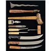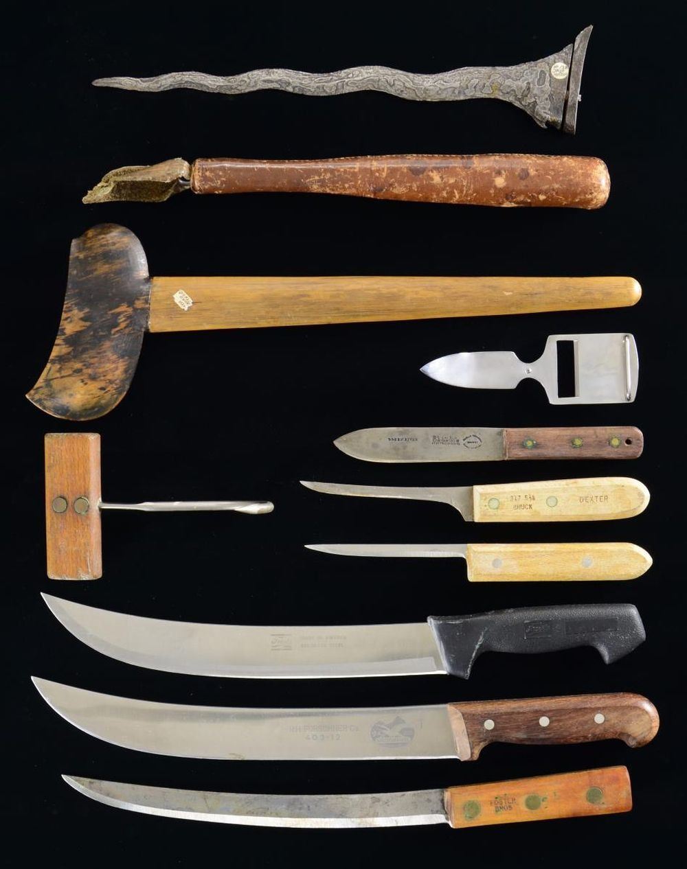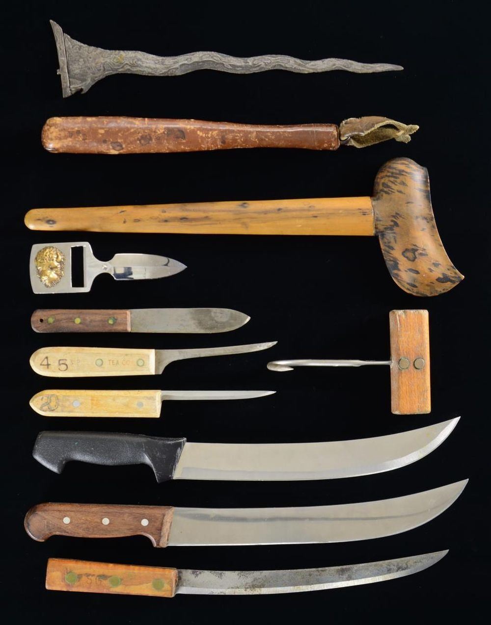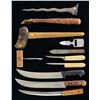 1) Custom belt buckle dagger, 6" overall, 3" double edged curved tapered blade, same form as early push daggers, applied brass bison head decoration. No makers mark. 2) Leather covered weighted police or navy Billy stick or baton, 12" overall. 3) Crooked blade dagger, with small tag "JAVA METEOR", wood sheath, handle is missing. 4) Green River, utility knife, 8.5" overall, 4.75" blade, pinned wood slab grips, very good overall. 5) Large 18" Victorinox knife, 12" blade, 1.6" wide, very good overall. 6) Four additional utility knives & wood handled meat hook. CONDITION: very good overall. (02-22847, 02-22848/JS). $400-600.