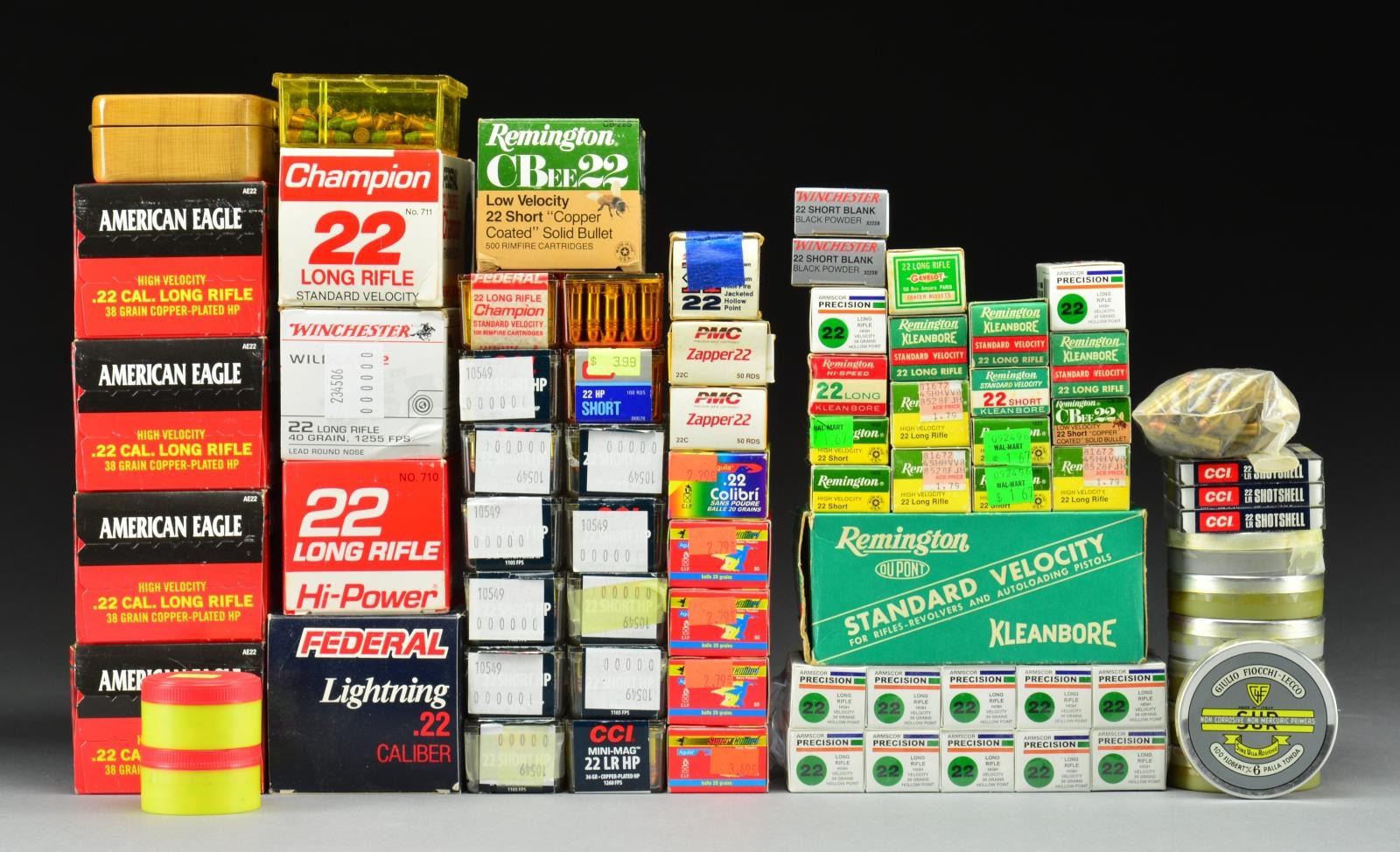 22 LONG RIFLE: 4-400 rd. bricks of Federal American Eagle 38 gr. HP. / 500 Rd. brick of Federal high power. / 500 Rd. brick of Federal Lightning HV 40 gr. lead. / 500 Rd. brick Win. Wildcat 40 gr. lead round nose. / 500 Rd. packet of ArmsCor Precision 36 gr. HP. / 500 Rd. brick containing 7 boxes Federal Champion Target. / 100 Rd. box Federal Champion Target. / 2-100 Packs CCI minimag. / 2-50 Rd. boxes ArmsCor Precision 36 gr. hollow point. / 2-50 Rd. boxes Rem. standard velocity. / 3-50 Rd. boxes Rem. high velocity 40 gr. solid. / 3-20 Rd. packets CCI shotshells #12. / Hardwood Parker Hale loading block containing 20 plus rds. / 50 Rd. box Gevelot Tracer. / 50 Rd. box PMC Zapper HV.