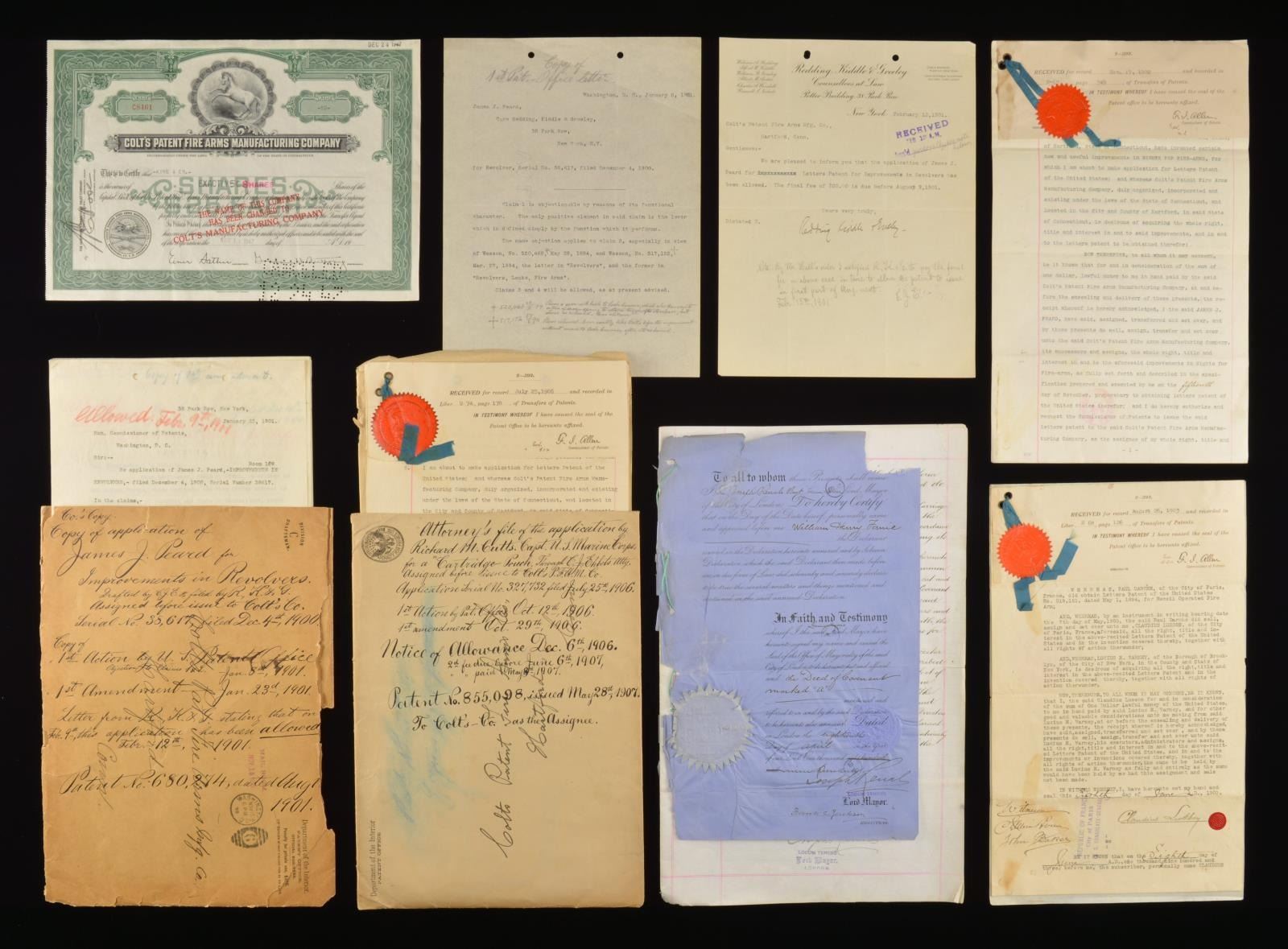 4) Assignment to Colt, all firearms patents by James Peard, 1900 & copies of patents.