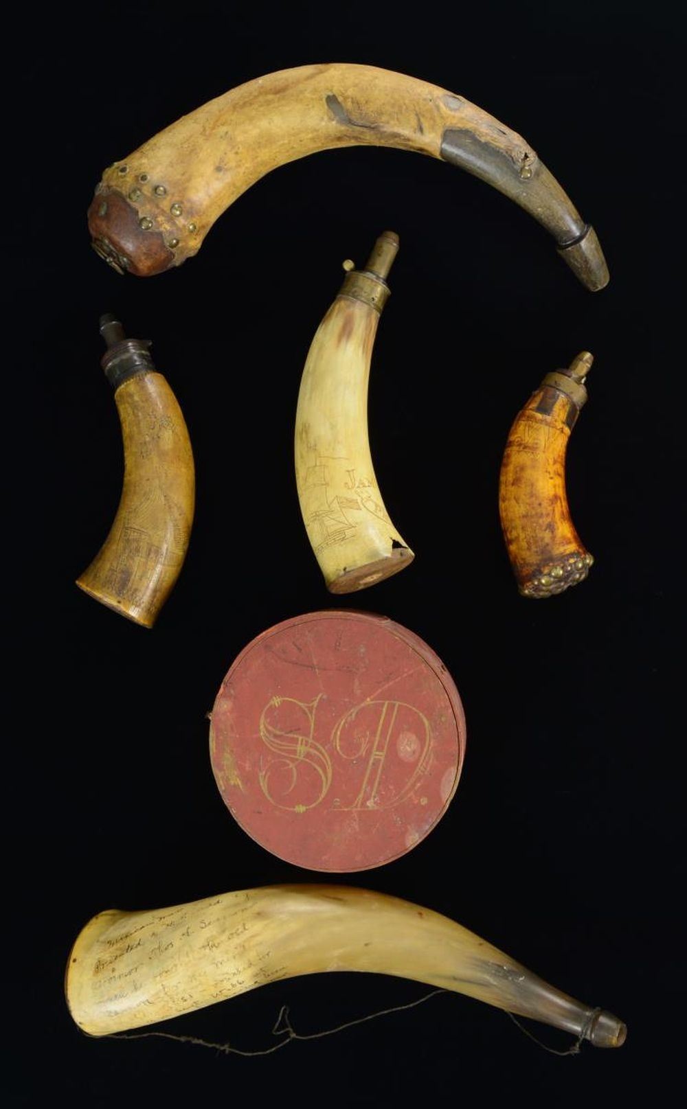 GROUP OF EARLY AMERICAN POWDER HORNS & MILITIA