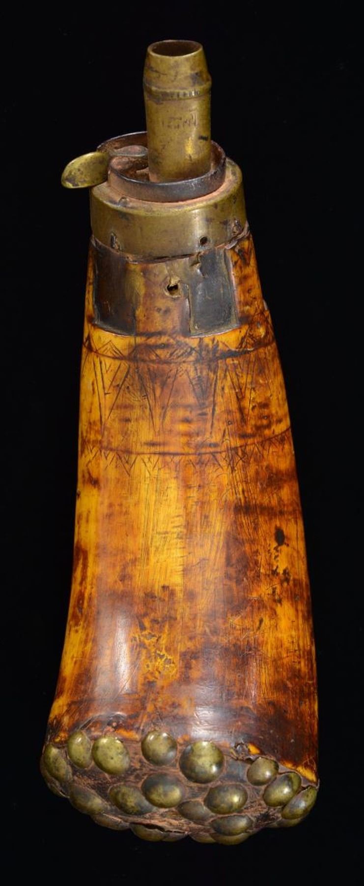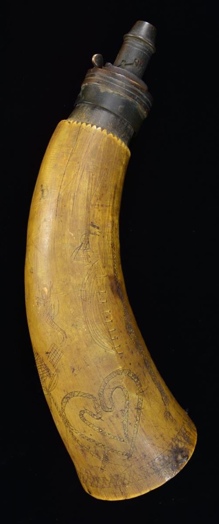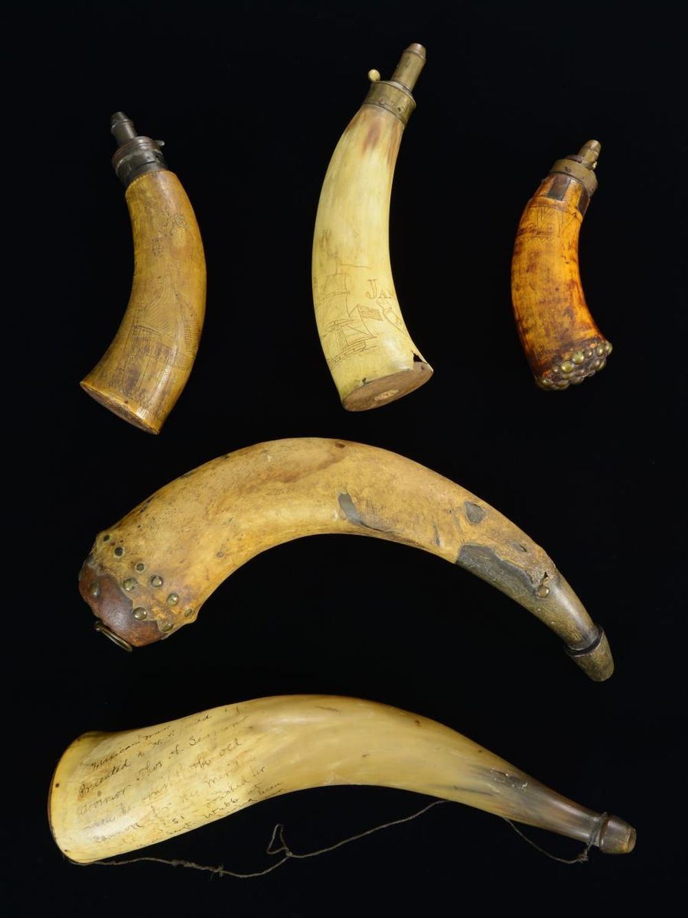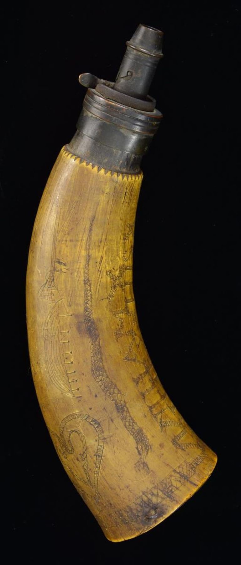 CANTEEN. 1) Good French & Indian War horn "WILLIAM PHINEY * HIS HORN 1760" is nicely carved with snake and ship and other decoration. 10" long overall with later added brass spout for continued use. Appears as found with good honey color & patina. 2) 20" unusual rawhide and tacked cover 7 large wood plug, fair to good overall with 2"crack and hole. 3) Carved: "JAMES CLIFF'S / 1814 / PROPERTY" and sailing ship with American flag. 11" overall included later added adjustable brass spout, fair to good overall, about 1" hole at base caused by insects. 4) 16" green horn with 9-line ink inscription: "Mexican war powder horn presented to HP Judd by Governor Thos H Seymour when he bought the old cannon for the Meriden people 1851. Vouched for by QM Sergeant Webb at arsenal as having been through the Mexican war". Good overall. 5) 8" well patinated, lightly carved horn with brass top, good overall. 6) 7" red painted cheese box canteen with painted initials and unit number, missing leather strap loops, good overall. PROVENANCE: Martin Lane Historic & Western Americana Lifetime Collection. (02-21698/JS). $1,200-1,500.