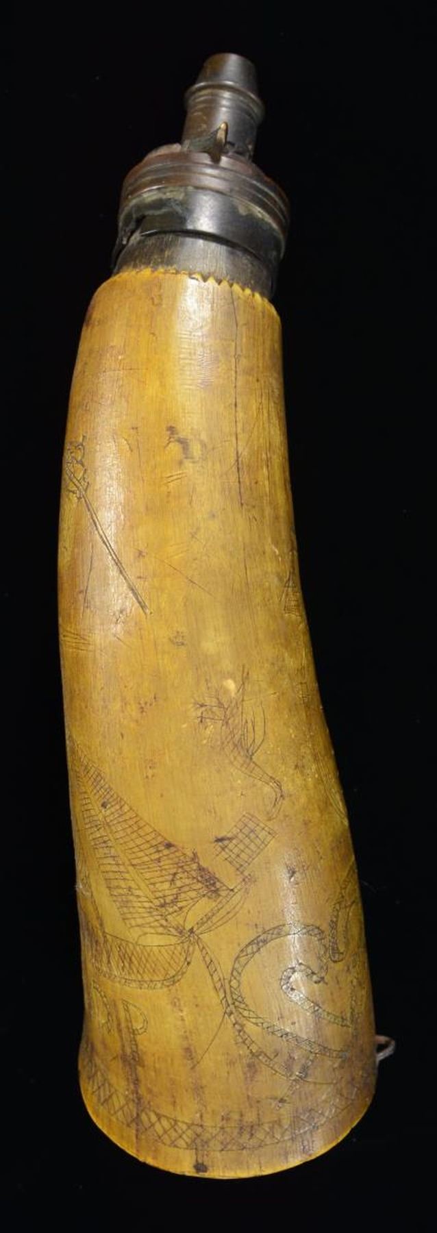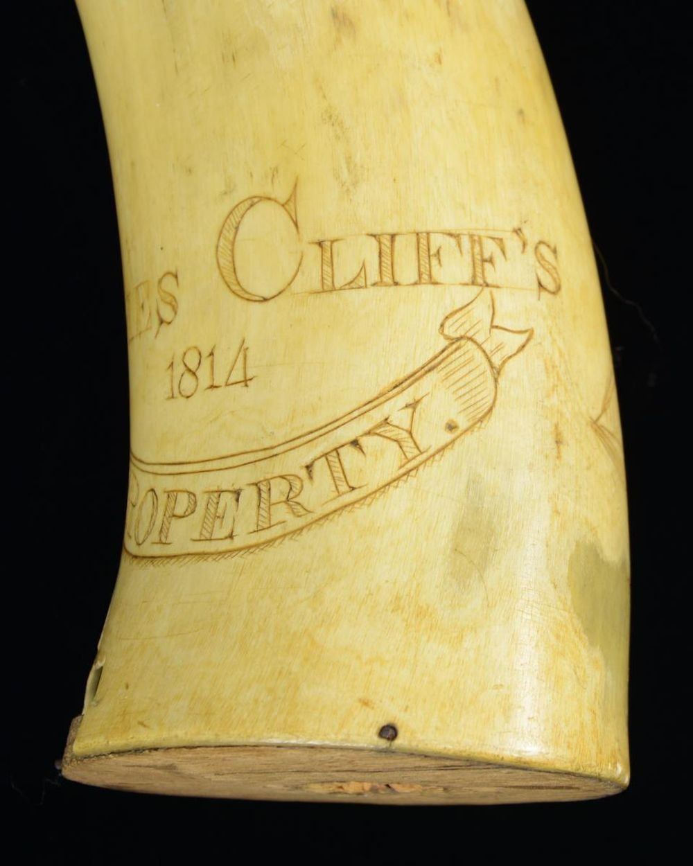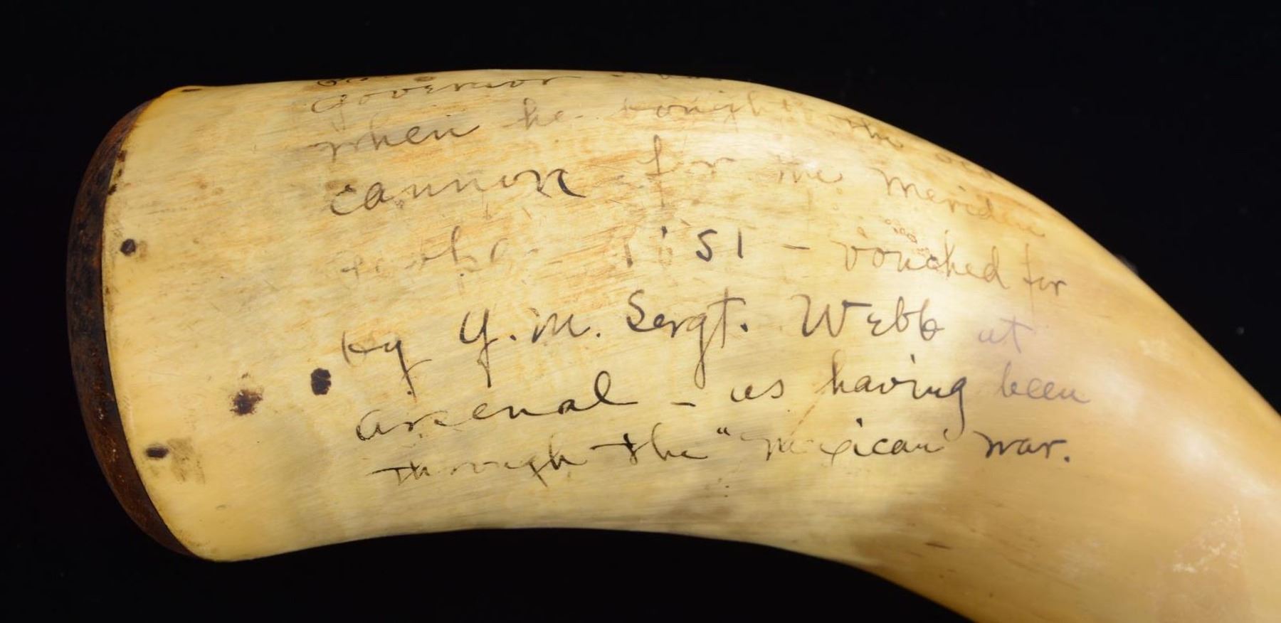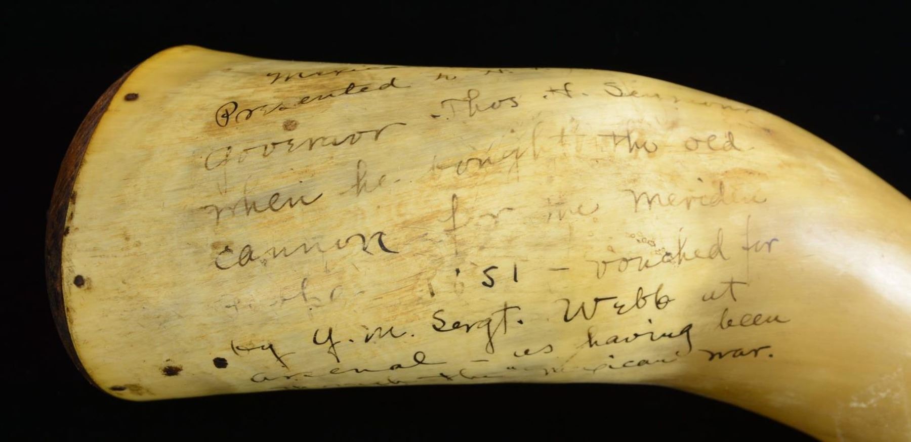 CANTEEN. 1) Good French & Indian War horn "WILLIAM PHINEY * HIS HORN 1760" is nicely carved with snake and ship and other decoration. 10" long overall with later added brass spout for continued use. Appears as found with good honey color & patina. 2) 20" unusual rawhide and tacked cover 7 large wood plug, fair to good overall with 2"crack and hole. 3) Carved: "JAMES CLIFF'S / 1814 / PROPERTY" and sailing ship with American flag. 11" overall included later added adjustable brass spout, fair to good overall, about 1" hole at base caused by insects. 4) 16" green horn with 9-line ink inscription: "Mexican war powder horn presented to HP Judd by Governor Thos H Seymour when he bought the old cannon for the Meriden people 1851. Vouched for by QM Sergeant Webb at arsenal as having been through the Mexican war". Good overall. 5) 8" well patinated, lightly carved horn with brass top, good overall. 6) 7" red painted cheese box canteen with painted initials and unit number, missing leather strap loops, good overall. PROVENANCE: Martin Lane Historic & Western Americana Lifetime Collection. (02-21698/JS). $1,200-1,500.