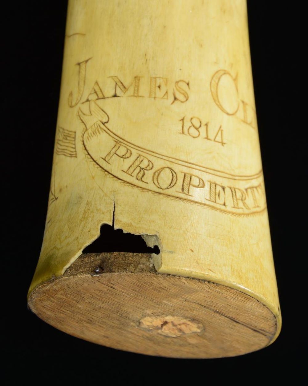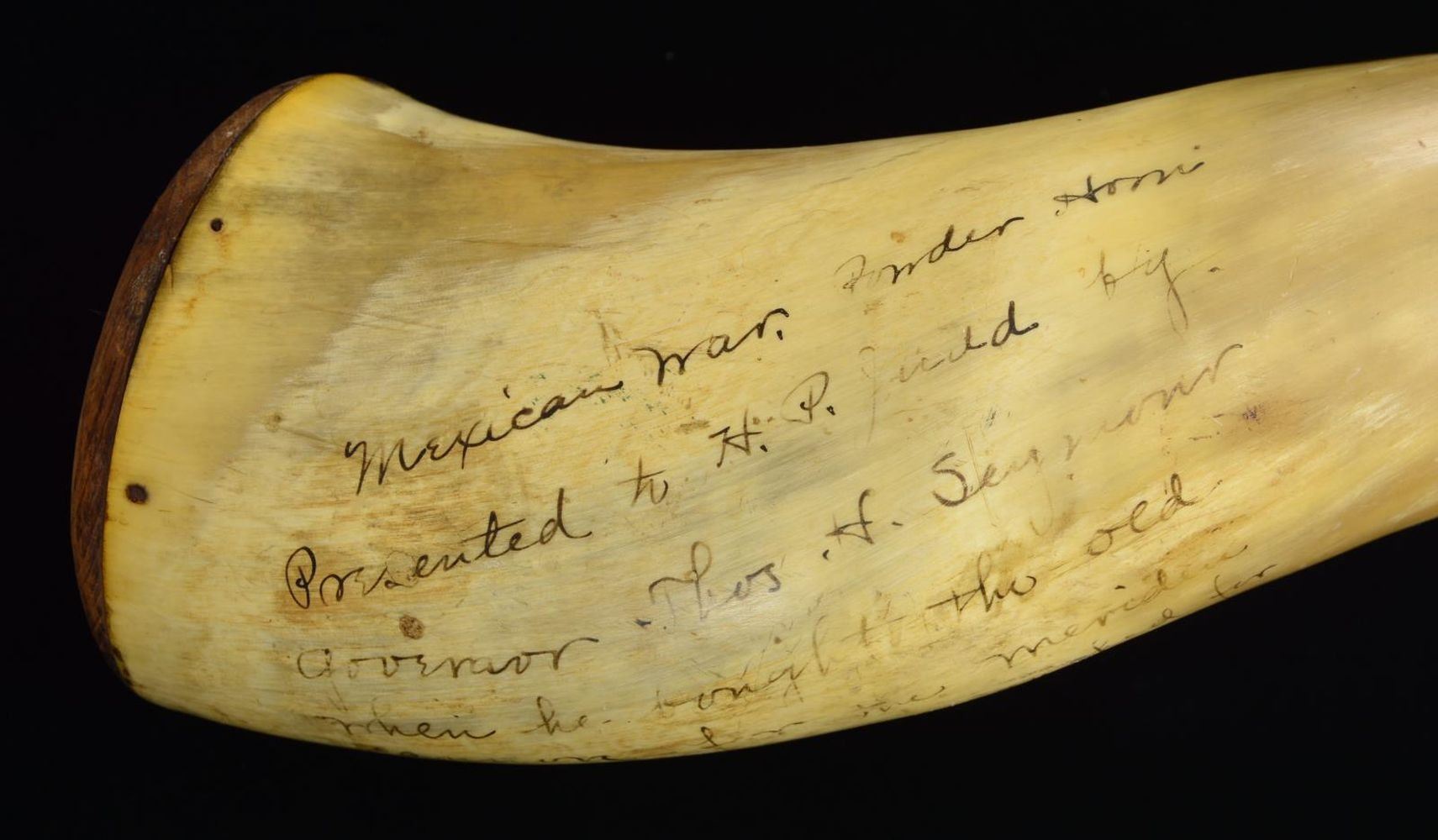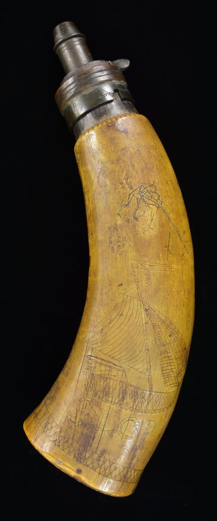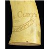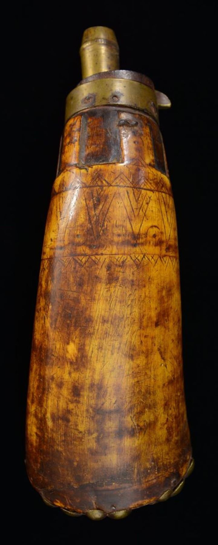 CANTEEN. 1) Good French & Indian War horn "WILLIAM PHINEY * HIS HORN 1760" is nicely carved with snake and ship and other decoration. 10" long overall with later added brass spout for continued use. Appears as found with good honey color & patina. 2) 20" unusual rawhide and tacked cover 7 large wood plug, fair to good overall with 2"crack and hole. 3) Carved: "JAMES CLIFF'S / 1814 / PROPERTY" and sailing ship with American flag. 11" overall included later added adjustable brass spout, fair to good overall, about 1" hole at base caused by insects. 4) 16" green horn with 9-line ink inscription: "Mexican war powder horn presented to HP Judd by Governor Thos H Seymour when he bought the old cannon for the Meriden people 1851. Vouched for by QM Sergeant Webb at arsenal as having been through the Mexican war". Good overall. 5) 8" well patinated, lightly carved horn with brass top, good overall. 6) 7" red painted cheese box canteen with painted initials and unit number, missing leather strap loops, good overall. PROVENANCE: Martin Lane Historic & Western Americana Lifetime Collection. (02-21698/JS). $1,200-1,500.