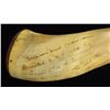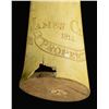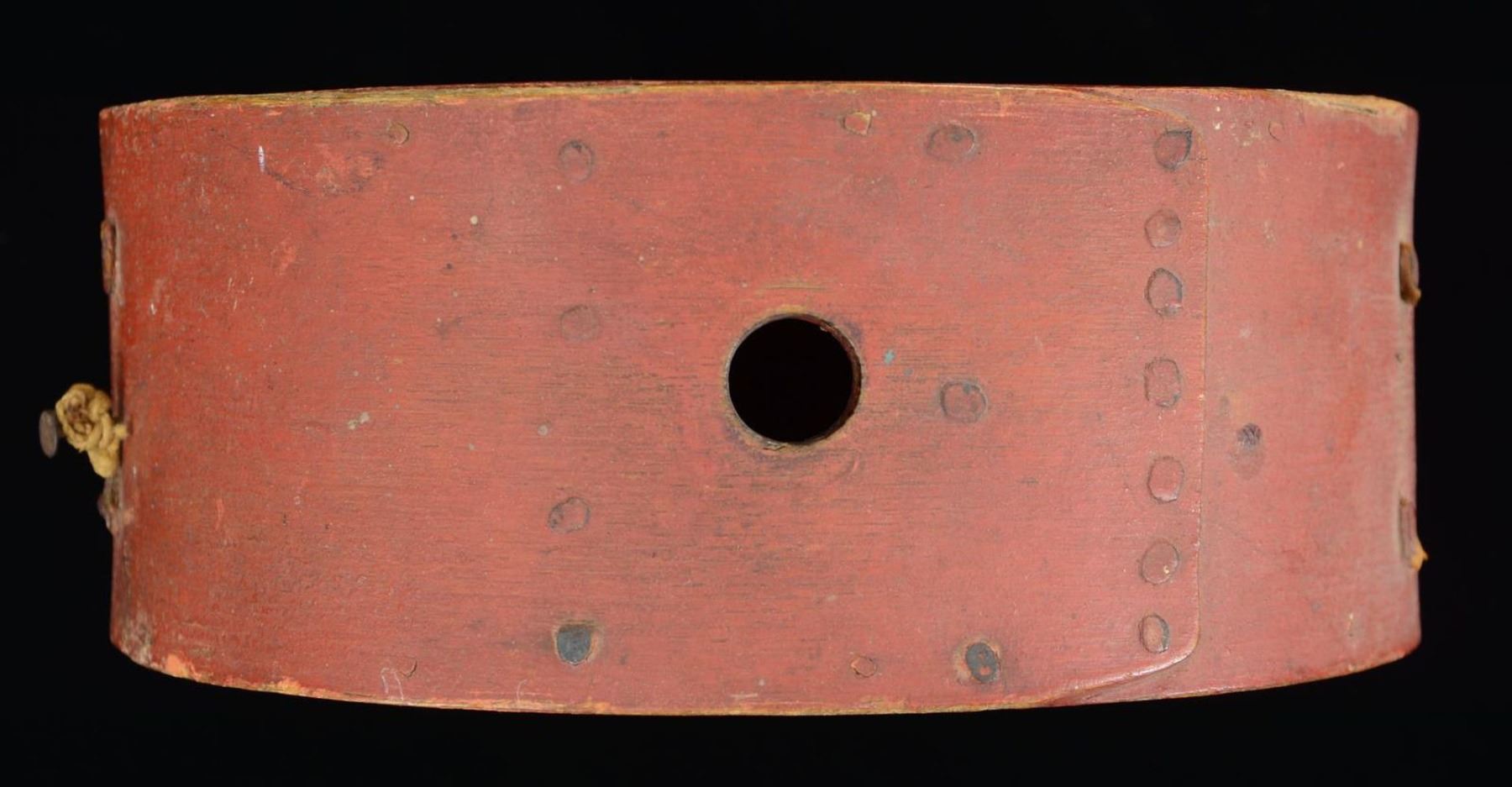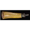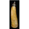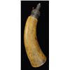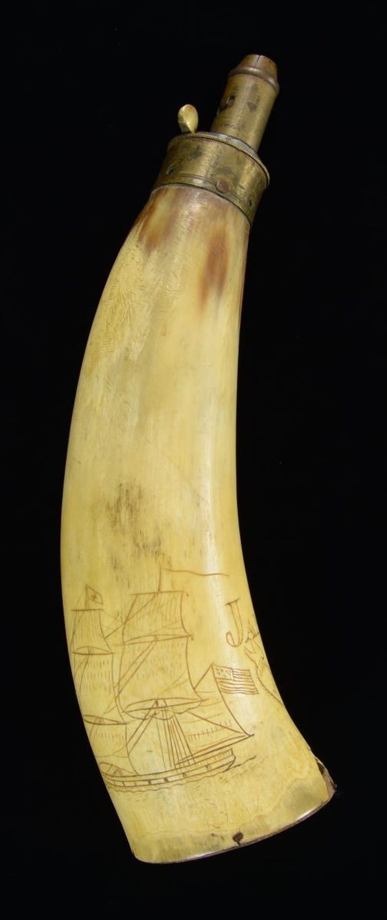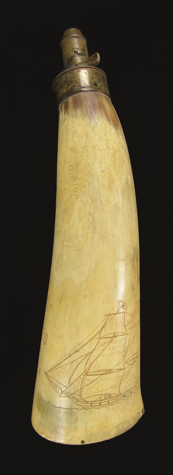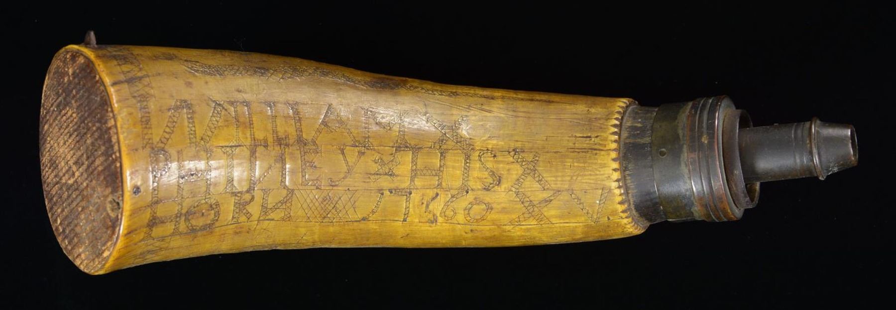 CANTEEN. 1) Good French & Indian War horn "WILLIAM PHINEY * HIS HORN 1760" is nicely carved with snake and ship and other decoration. 10" long overall with later added brass spout for continued use. Appears as found with good honey color & patina. 2) 20" unusual rawhide and tacked cover 7 large wood plug, fair to good overall with 2"crack and hole. 3) Carved: "JAMES CLIFF'S / 1814 / PROPERTY" and sailing ship with American flag. 11" overall included later added adjustable brass spout, fair to good overall, about 1" hole at base caused by insects. 4) 16" green horn with 9-line ink inscription: "Mexican war powder horn presented to HP Judd by Governor Thos H Seymour when he bought the old cannon for the Meriden people 1851. Vouched for by QM Sergeant Webb at arsenal as having been through the Mexican war". Good overall. 5) 8" well patinated, lightly carved horn with brass top, good overall. 6) 7" red painted cheese box canteen with painted initials and unit number, missing leather strap loops, good overall. PROVENANCE: Martin Lane Historic & Western Americana Lifetime Collection. (02-21698/JS). $1,200-1,500.