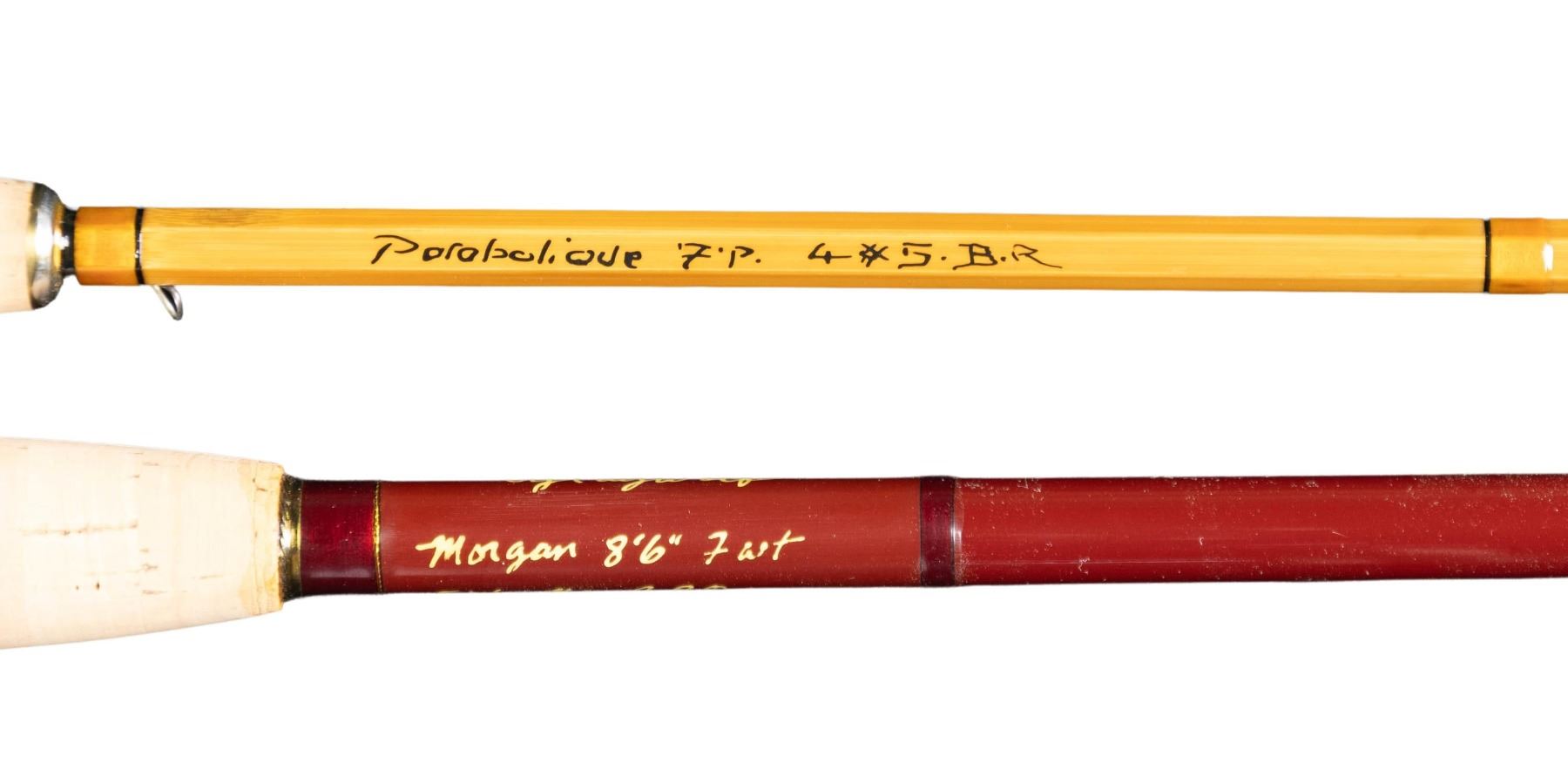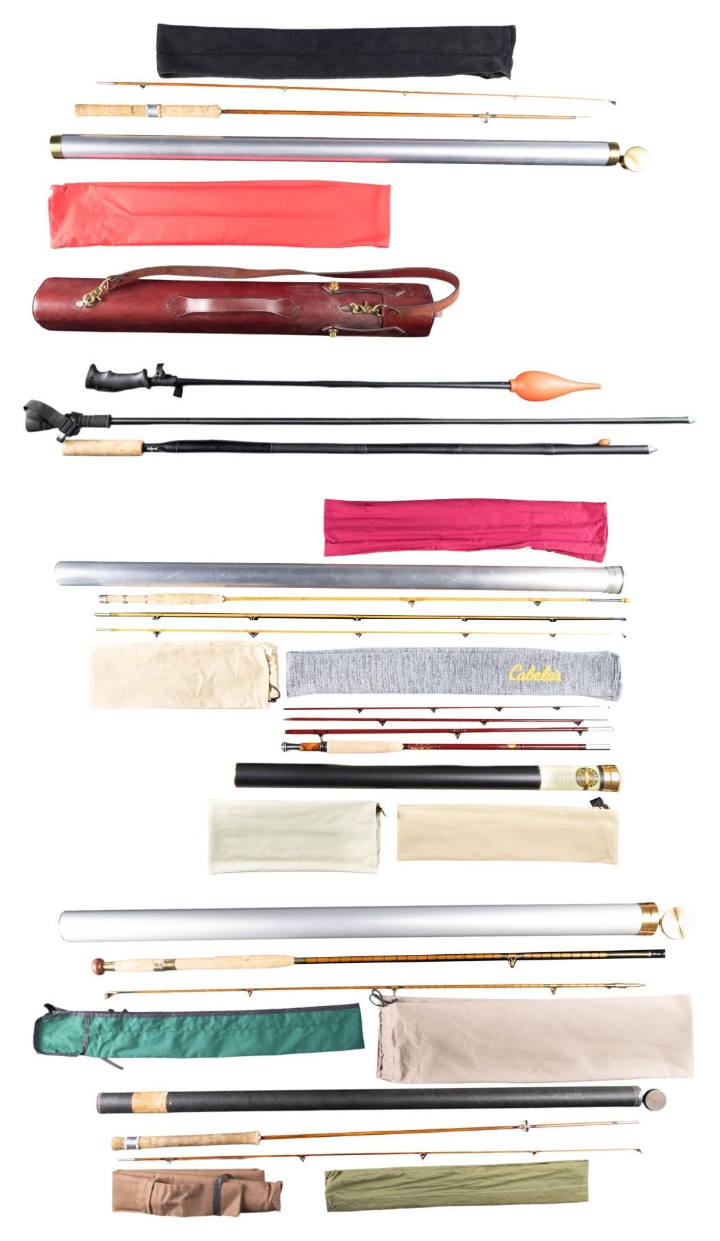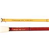 1) Lyon & Coulson bamboo spinning rod. 7', 2 piece, 1 tip, marked "Lyon & Coulson Crown 0341", with original bag and tube. CONDITION: good to fine. 2) Army Navy CSL bamboo bait casting rod. 7', 2 piece, agate guides, with bag and tube. CONDITION: very fine. Nearly all original finish. Rear ferrule of tip, along with wraps slips off, needs to be re-glued. 3) French bamboo fly rod. 7', 2 piece, 2 tips, 4-5 weight, marked "Parabolique '7'F 4X5. B.R" with bag and tube. CONDITION: very fine. 4) Gray Wolf 4 piece fiberglass fly rod. 8'-6", 7 weight with original bag and tube. CONDITION: very fine. "Near new".5) Lyon & Coulson bamboo spinning rod. 7', 2 piece, marked "Lyon & Coulson Captain 0441", in non-original bag and tube. CONDITION: very fine. Shows little use. 6) Good quality 3 compartment leather rod case by Majestic Rivers with carrying strap. CONDITION: very fine. 7) 3 Wading rods: 1-by Orvis, 1- by Mojo, 1 unsigned. CONDITION: fine. PROVENANCE: From the Private Collection of Berrien Moore III. (02-25866-3/MGM). $500-1,000.