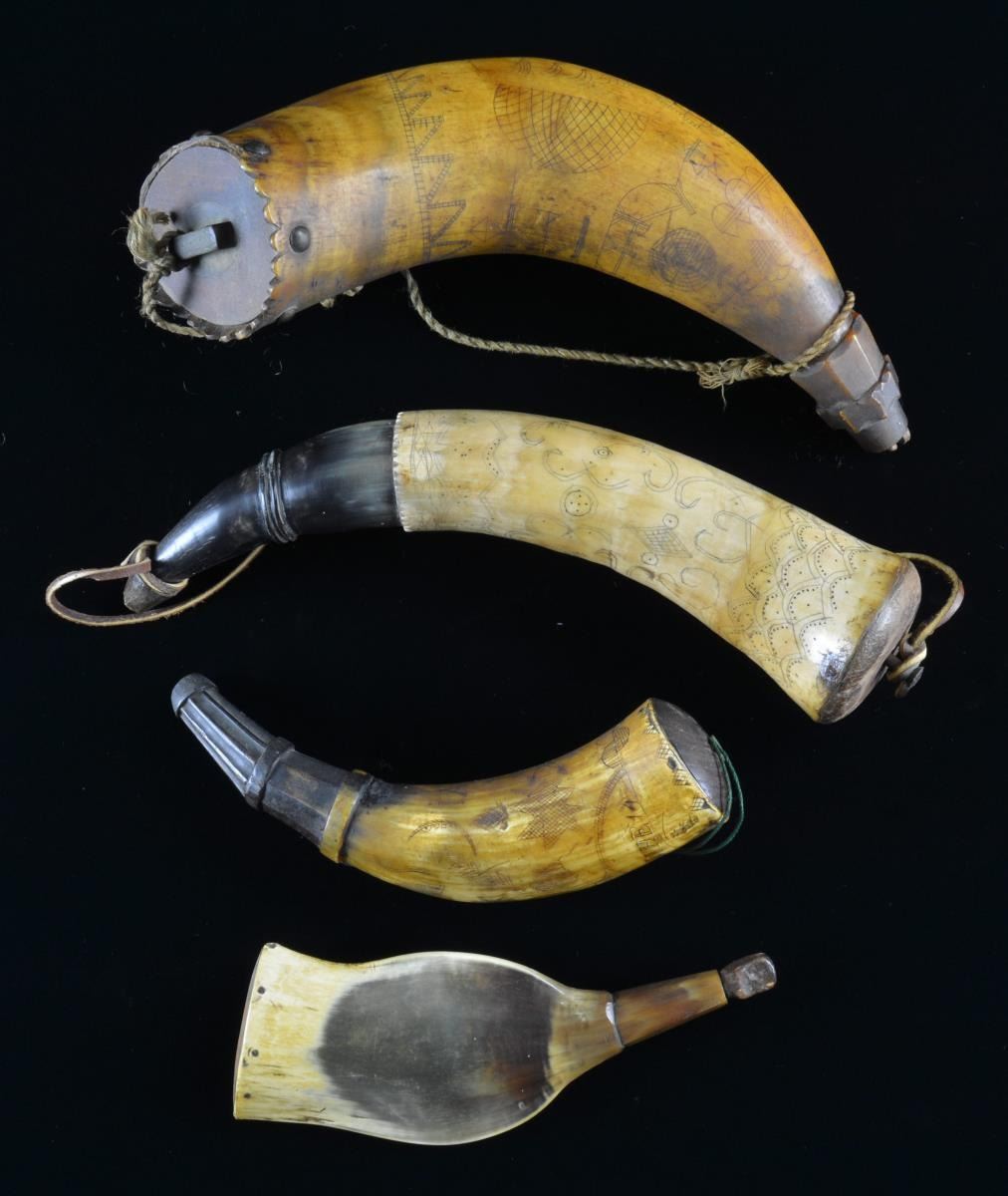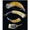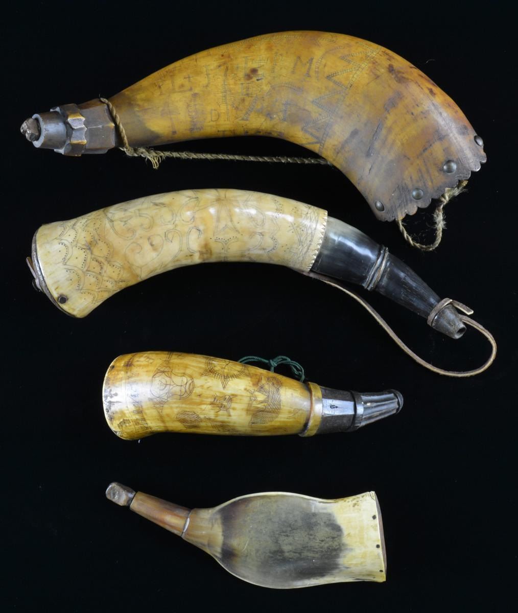 GROUP OF FOUR 18TH/19TH CENTURY POWDER HORNS.