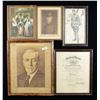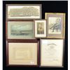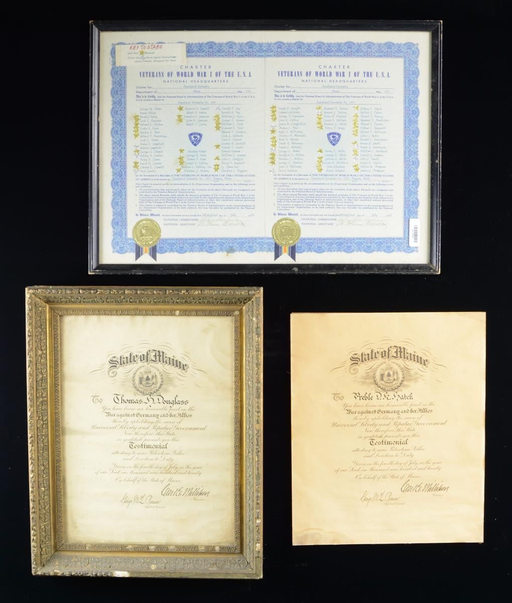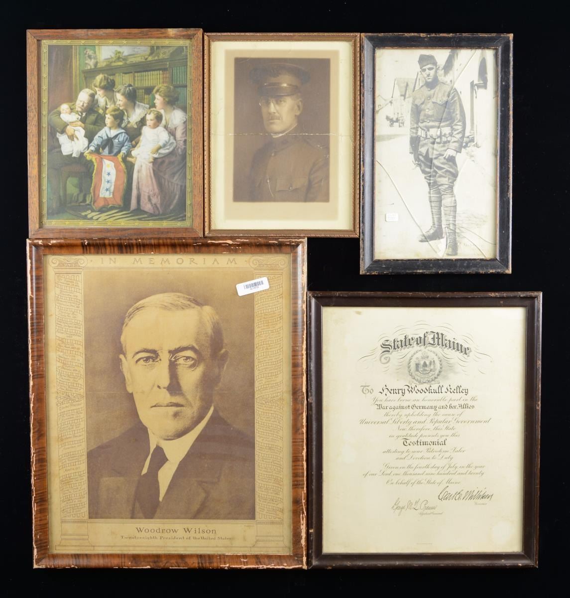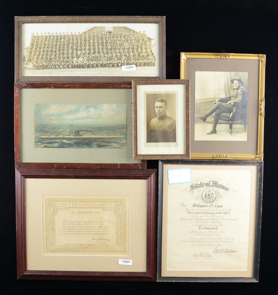 This group includes 1 small panoramic photograph in a frame measuring 21 1/2" x 9 1/2", picturing the 26th Company of the 166th Depot Brigade of Camp Lewis, Washington. / 1 WWI photograph of a seated enlisted man in a 12” x 15” frame. / 1 WWI KIA certificate in a frame measuring 21” x 17”, for a PFC in the 107th Infantry. / 1 Polychromatic watercolor of an aircraft carrier signed by Louise Larned & dated 1921. Sight size is 13” x 6 1/2". Frame size is 19” x 12”. / 1 WWI chest-up photograph of a Adjutant General's Department Field Clerk in a frame measuring 8” x 11”. / 1 WWI Testimonial from the State of Maine to Orlando Lane in a 15” x 18” frame. / 1 Photographic portrait of a WWI Officer with fold damage in the center. / 1 Polychromatic print in an 11” x 13” frame of Teddy Roosevelt & family. / 1 Full length photograph of an American Soldier in Germany, dated 1919, housed in a 9 1/2" x 15” frame. / 1 WWI Testimonial from the State of Maine to Henry Kelly in a 15” x 18” frame. / 1 Charter for the Penobscot Barracks of the “VETERANS OF WORLD WAR I OF THE U.S.A.”, dated 1962. / 1 In Memorium poster of Woodrow Wilson in a frame measuring 17 1/2" x 21”. / 1 WWI Testimonial from the State of Maine to Thomas Douglas in a 17” x 21” frame. / 1 WWI Testimonial from the State of Maine to Preble Hatch, unframed. CONDITION: all frames show moderate wear. All certificates & photos show some minor discoloration &/or staining, but details remain sharp. (02-19725/BF). $100-300.