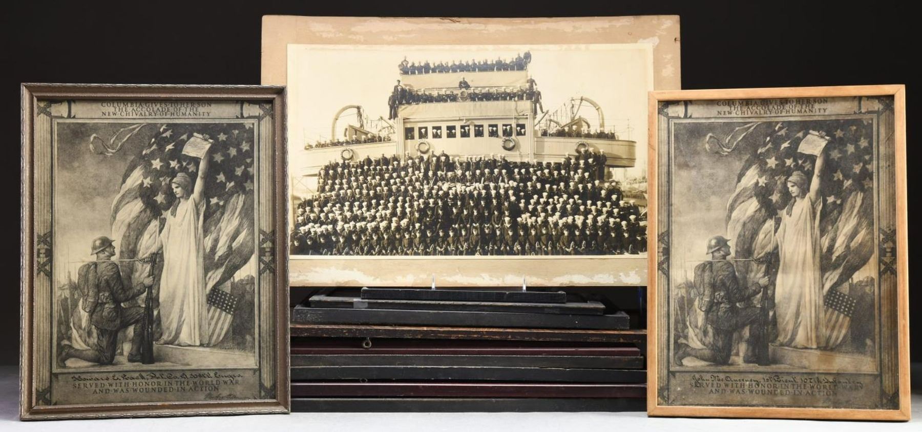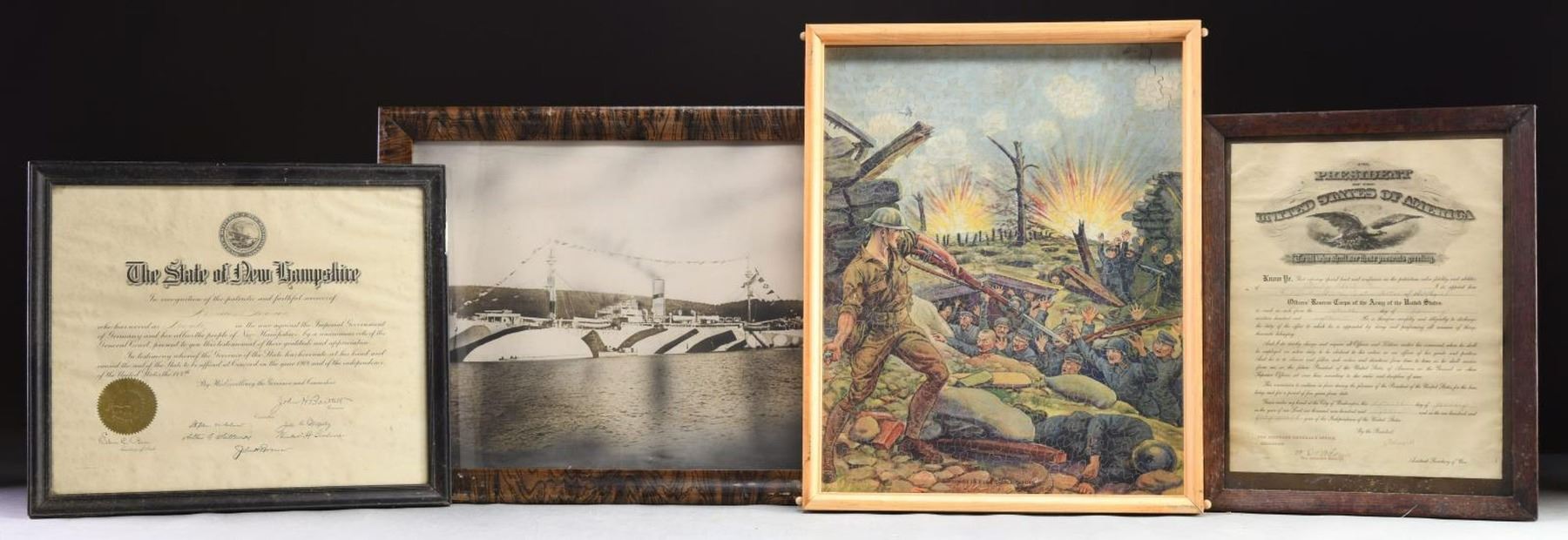 This group contains 1 WWI commission in a 13 1/2" x 17” frame. The commission is for a 1st Lieutenant in the Aviation Section of the Signal Corps. / 1 Ship photograph in a 22 1/2" x 17 1/2" frame, depicting, was is thought to be, the USS Blackhawk, in period camouflage paint. / 1 Photograph in a 15 1/2" x 11” frame, dated 1921, depicting allied officers reviewing the troops in Kansas City. / 1 WWI WIA certificate in a 13 1/2" x 17” frame, to a Private in the Engineers. / 1 WWI WIA certificate in a 15 3/4" x 19” frame, to a 2nd Lieutenant. / 1 WWI WIA certificate in a 17” x 21 1/2" frame, to a PFC. / 1 Frame measuring 13” x 25” containing 3 black & white photographs of WWI scenes in Europe. / 1 WWI WIA certificate in an 18” x 20" frame, to a Marine Corps veteran. / 1 WWI WIA certificate in a 16 1/2” x 21" frame, to a Private in the 103rd Infantry. / 1 WWI WIA certificate in a 13” x 17” frame, to a 1st Lieutenant in the Infantry. / 1 Early period puzzle in a 17” x 21” deep frame, depicting an American GI capturing German soldiers during WWI. / 1 New Hampshire Certificate of Faithful Service for a WWI Veteran in a 15” x 17 1/2" frame. / 1 Ship photograph in a 24” x 17” frame, depicting the USS Mercury. / 1 Large format photo of the crew of the USS Mercury. / 1 WWI WIA certificate in a 14” x 18” frame, for a Private in the Infantry. / 1 US Navy War Service Certificate from WWI in an 11” x 9” frame. CONDITION: all frames show moderate wear. All documents & photographs are complete but may show minor fading or discoloration. (02-19728/BF). $200-400.