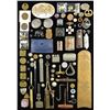 2) GROUP OF PINS, TAGS, INKWELLS, A BUSK, CORKSCREWS & MORE. This widely varied lot includes a carved wooden busk with Pennsylvania designs and central fylfot. / 1 Cased traveling inkwell. / 1 Sterling cigarette light made in Mexico. / 1 Early Islamic lock. / 1 Stylus. / 1 Silver and glass box. / 1 Traveling inkwell covered in lignum vitae. / 1 Black onyx elephant. / 1 Islamic painting on ivory. / 1 Keychain screw together knife. / 2 Corkscrews from the 18th century. / 1 Pocket caliper. / 2 Large silver buttons. / 1 Advertising watch fob. / 1 Advertising cigar cutter. / 1 Miniature cork screw. / 1 Watch key. / 1 Horse's hoof pick. / 1 Early tweezer. / 1 Silverplate stamp box. / 1 Small square inkwell. / 1 Hook. / 1 Single Colt pistol grip. / 7 Luggage tags. / 1 Budweiser advertising token. / 1 Barnum badge. / 10 Uniform and clothing buttons. / 13 Coins and tokens, mostly pierced. / 7 Other decorative articles. / 3 Gold buttons. / 1 Masonic Shriners Royal Order of Jesters (ROJ) Medal from the 1920s. / 1 Masonic or Odd Fellows medal. / 1 WWII US tank destroyer enamel pin. CONDITION: as expected, condition does very greatly. Most items show very light wear overall. (02-17594/BF). $600-800.