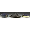HATS. 1. Slouch hat, black felt, sewn silk edging, 1.75” patent leather sweatband, size 7 label. Tied black ribbon with flat bow and Civil War/ Indian War era officer’s hat cord with acorn knots. Manufactured with small vent holes in top. Very good overall with 1” worn hole in front top fold. 2. Pillbox fatigue cap, navy blue wool, buff band, embroidered insignia with crossed Rifles and “1”. Good overall, bullion chinstrap with tin back eagle “I” buttons, quilted red cotton lining, 1.25” patent leather sweatband. 3. Pillbox fatigue cap, navy blue on 2” OD band, bullion chin strap, eagle side buttons, direct embroidered American eagle insignia, quilted red silk liner with frayed San Francisco makers label. fair to good overall, lacquered 1.5” sweatband dry and cracked but complete. PROVENANCE: From the Lifelong Collection of Glen E. Mattox. (02-18932/JS). $800-1,200.