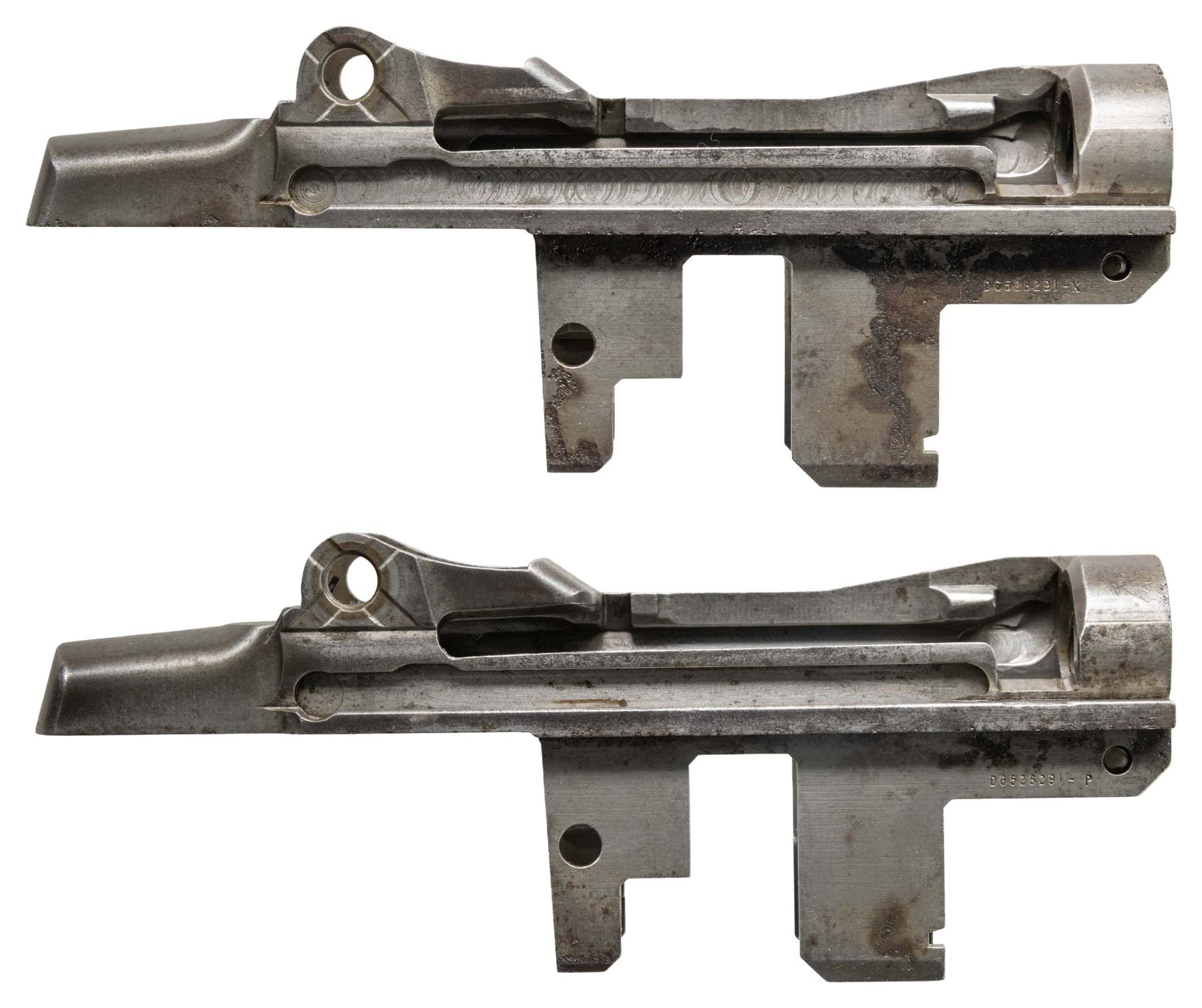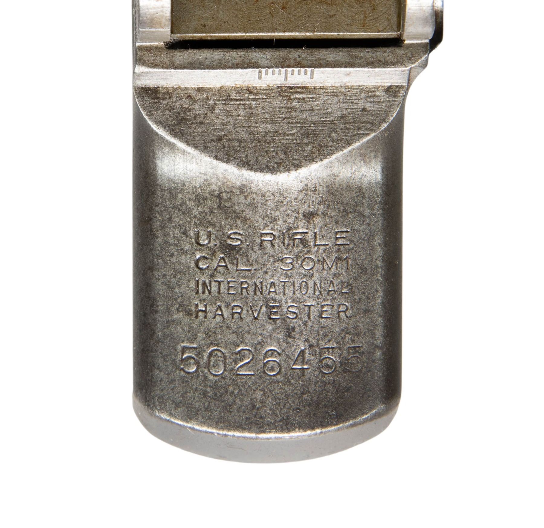 2). S# 5026455. Receiver marked at heel "U.S. RIFLE / CAL. .30M1 / INTERNATIONAL / HARVESTER / serial number". Marked on right forward end "D6528291-P". No parts are present. CONDITION: well-worn receiver has turned overall gray w/ extensive pitting under wood line & on face of receiver ring. (25-2891/RW). BOTH MODERN. $350-550.