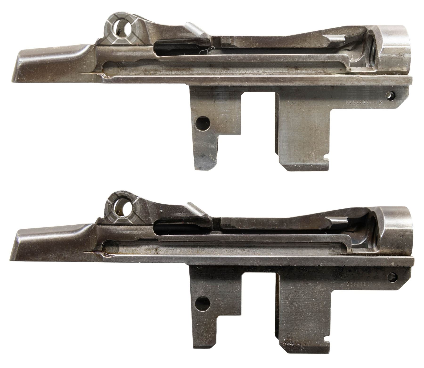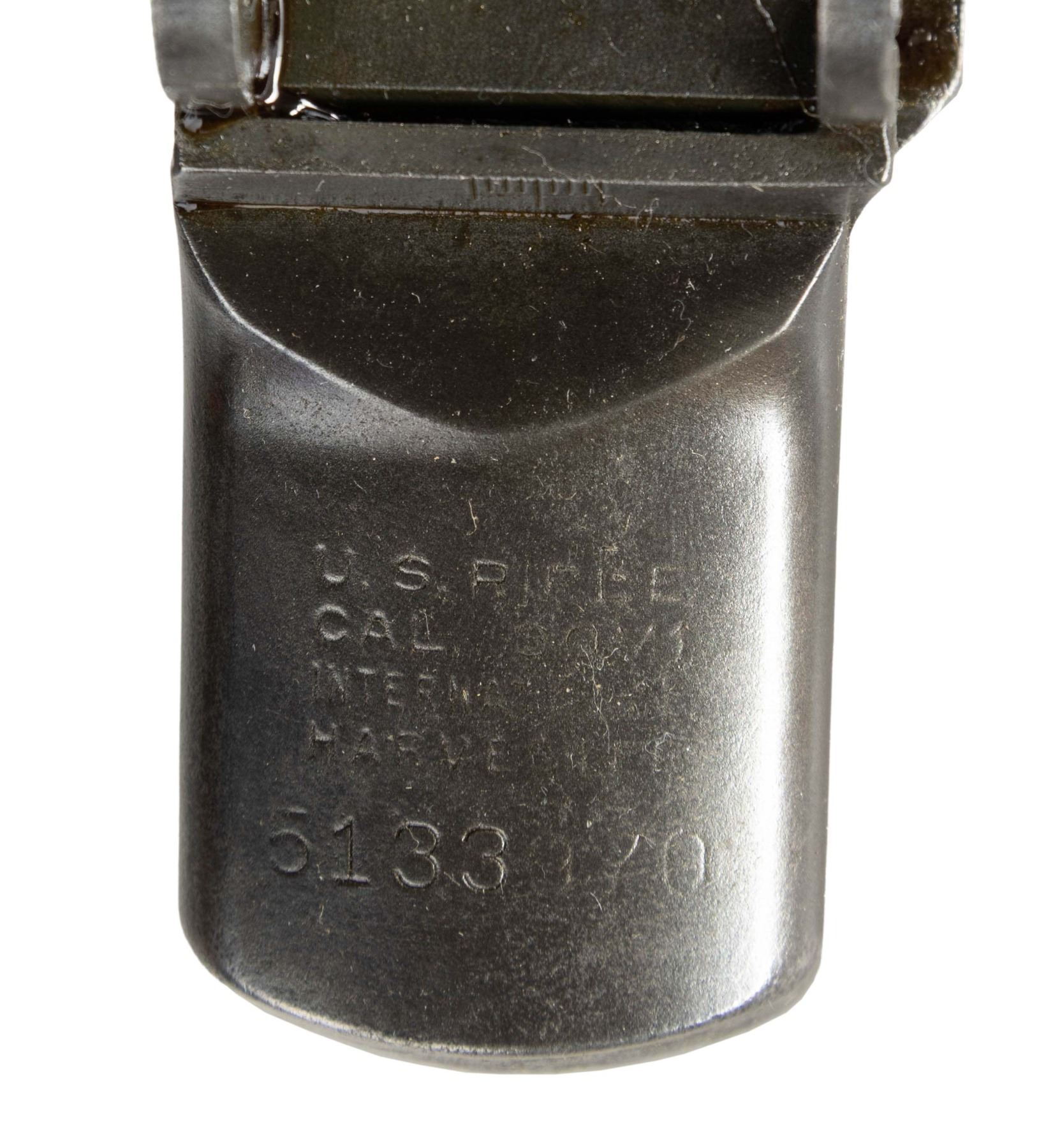 2). S# 5133970. Receiver marked at heel "U.S. RIFLE / CAL. .30M1 / INTERNATIONAL / HARVESTER / serial number". Marked on right forward end "D6528291-X". No parts are present. CONDITION: receiver has extensive wear turning overall gray. Left front of receiver below receiver ring has extensive arc-welded repair & should not be considered serviceable. (25-2897/RW). BOTH MODERN. $100-200.