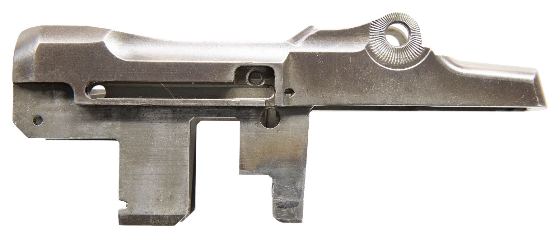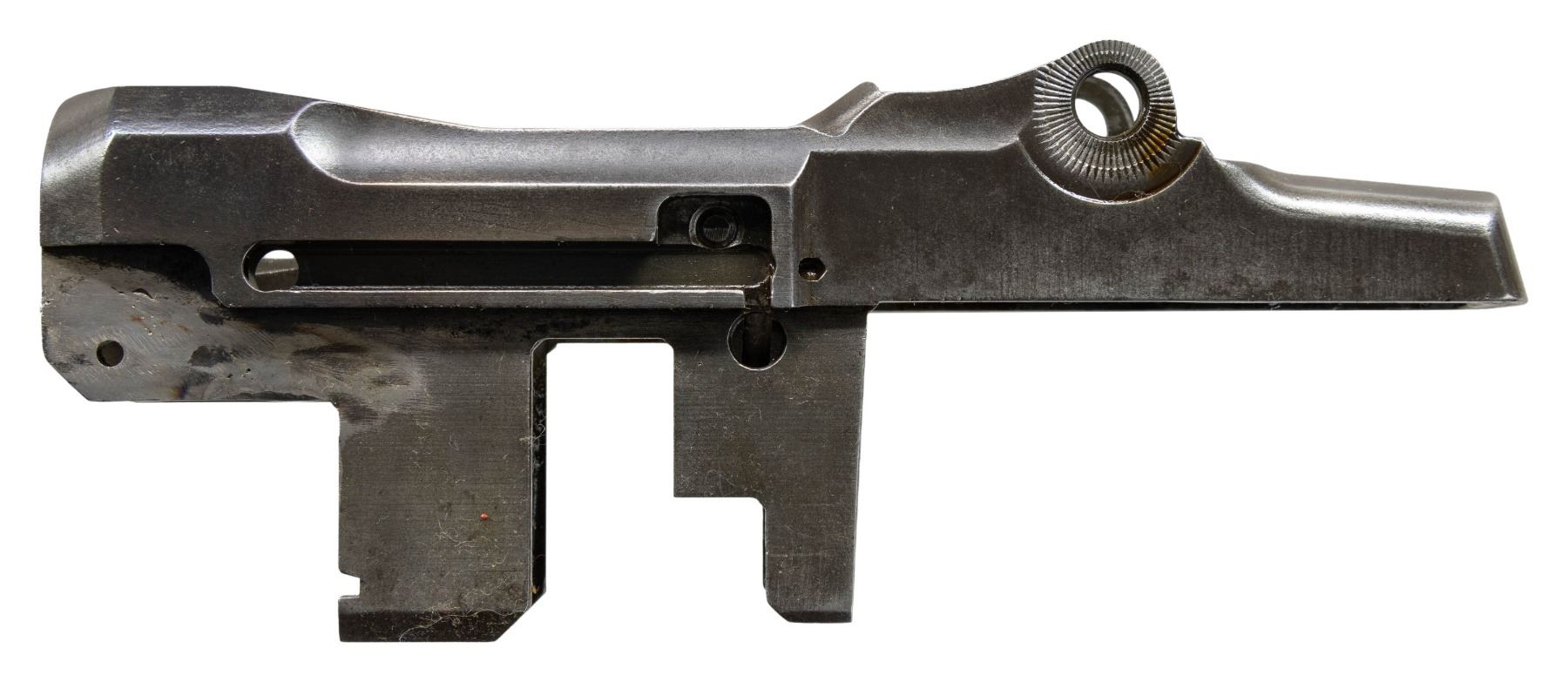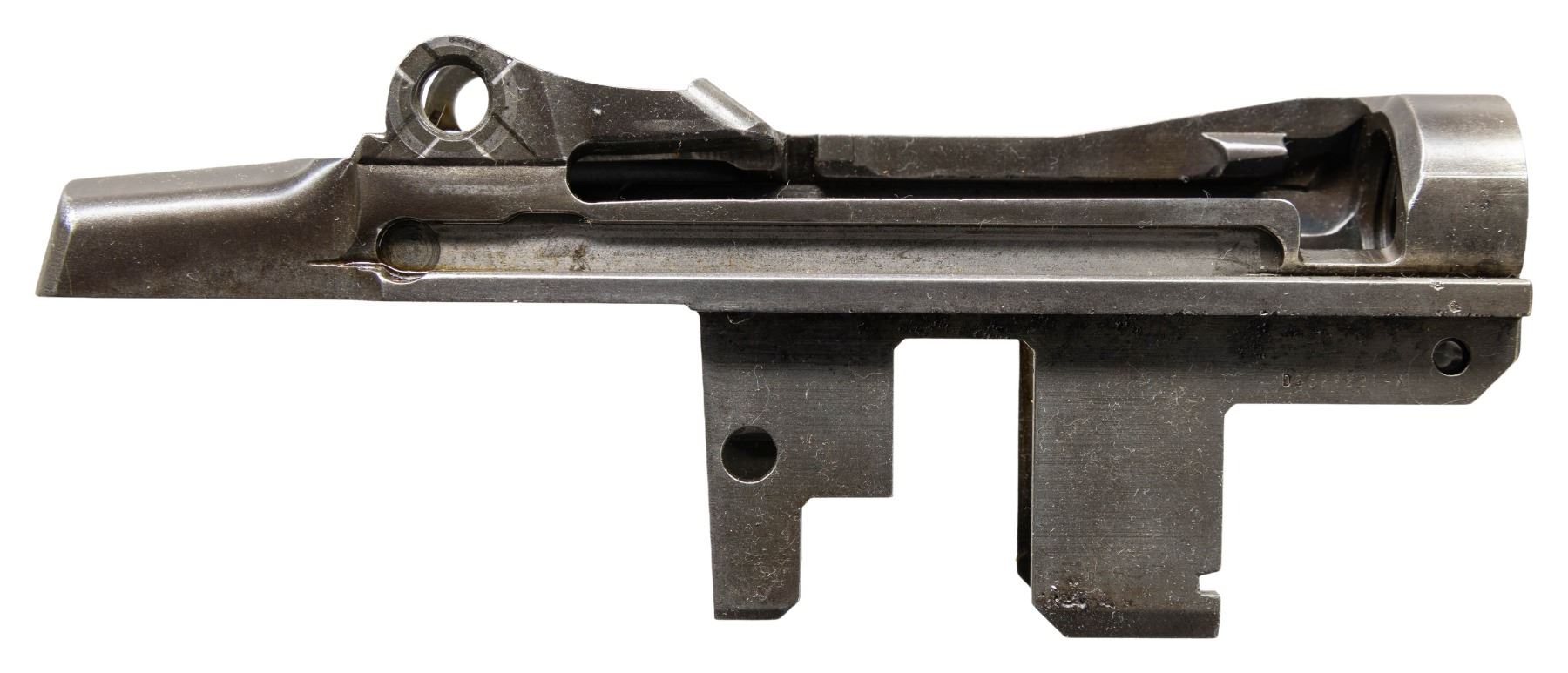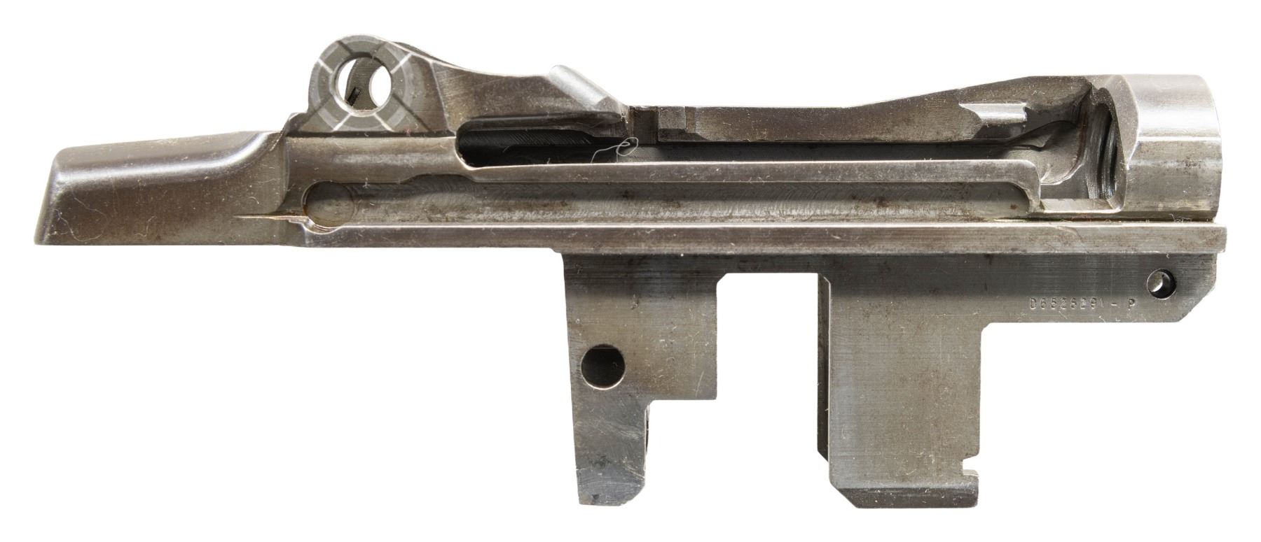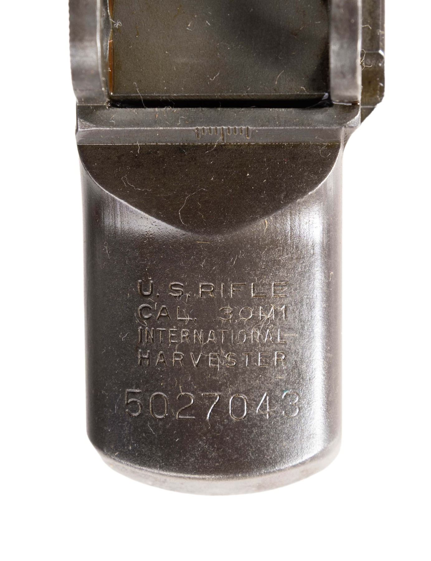 1). S# 5027043. Receiver marked at heel "U.S. RIFLE / CAL. .30M1 / INTERNATIONAL / HARVESTER / serial number". Marked on right forward end "D6528291-P". No parts are present. CONDITION: receiver is worn turning overall gray. Rear receiver legs have been repaired by welding & grinding. Welds have a hobbyist gunsmith appearance. Receiver should not be considered serviceable. (25-2893/RW).