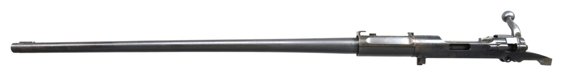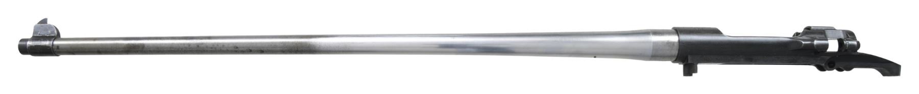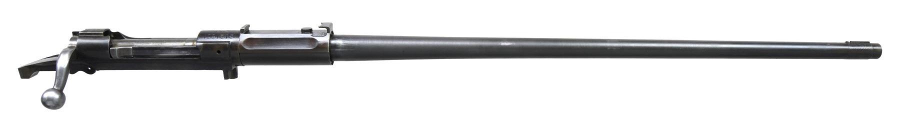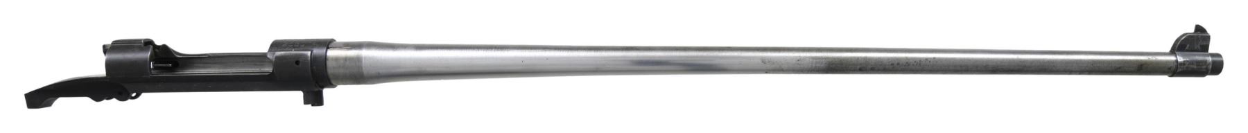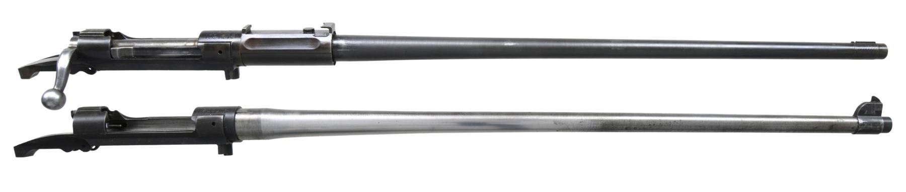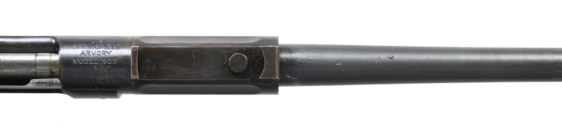 RECEIVERS. No.1: Cal. 30-06. S# 1091618. Bbl. 24". Receiver is marked on top "U.S. / SPRINGFIELD / ARMORY / MODEL 1903 / MARK 1 / serial number". Receiver manufactured in 1919 & has the slotted left rail to allow the use of the Pedersen Device. Receiver is w/o Hatcher hole & contains no additional Pedersen Device related parts. Included w/ the receiver is a late issue bolt w/ an extractor & collar. Bolt is marked underneath the safety lug "J 5". Replacement barrel included is marked "SA / flaming bomb / 9-21". Barrel is fitted w/ rear sight base & front sight key. CONDITION: receiver ^ barrel have worn dark Parkerized finishes. Good shiny bore w/ strong lands, but hint of frosting in grooves. (25-3113/RW). No.2: Cal. 30-06. S# 1258074. Bbl. 24". Blued steel receiver is marked on top "U.S. / SPRINGFIELD / ARMORY / MODEL 1903 / serial number". Blued steel receiver contains no additional parts. Included is star gauged 24" barrel. Barrel is marked behind front sight "SA / flaming bomb / 4-32". CONDITION: receiver has moderately worn thinning blue & exhibits the polished rails typical of a national match rifle. Barrel has had its finish removed, except the front sight & muzzle area, having been left bright. Barrel retains provisions for rear sight base locating pins. Very good shiny bore w/ sharp lands. (25-3126/RW). BOTH MODERN. $400-600.