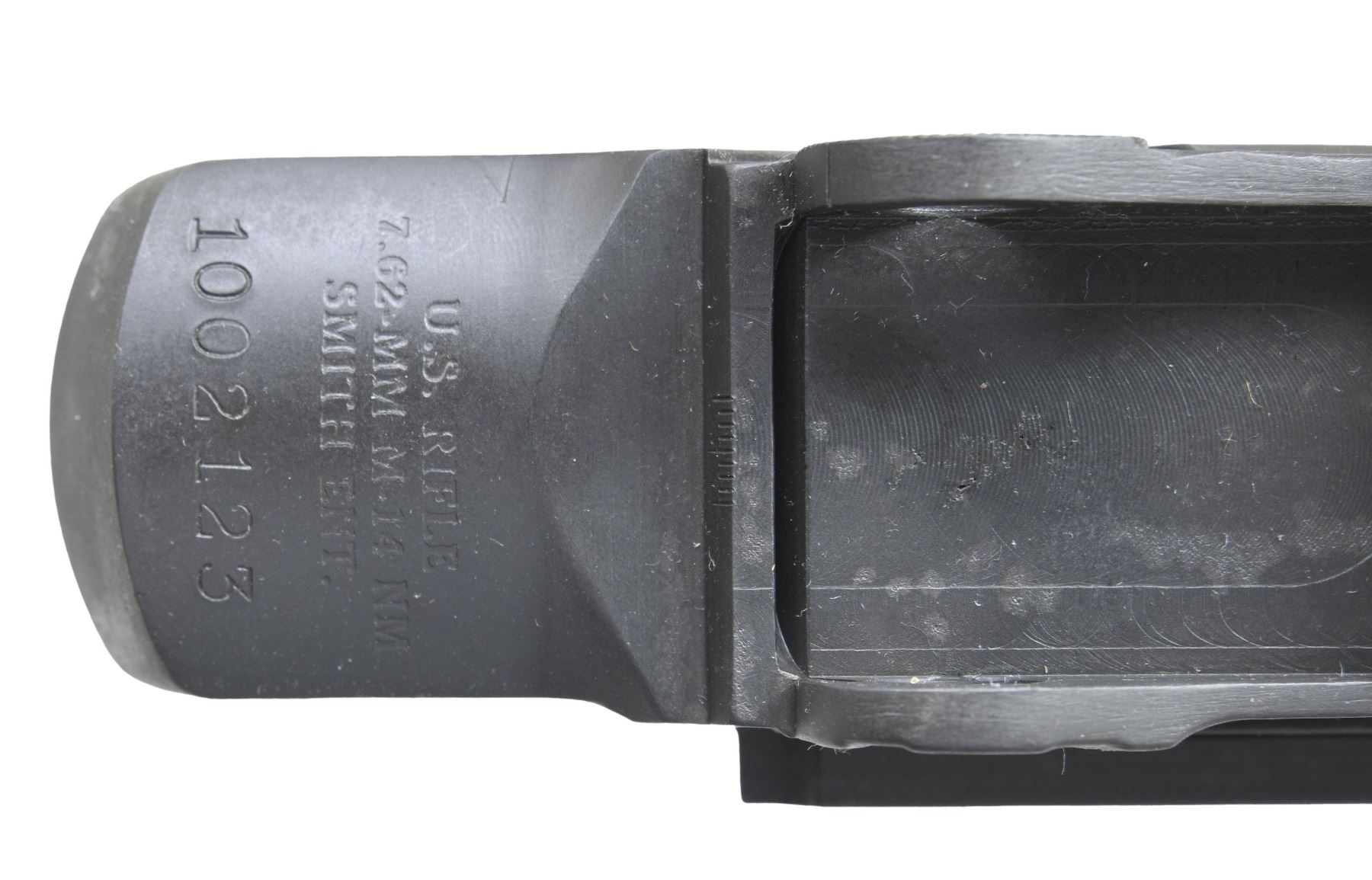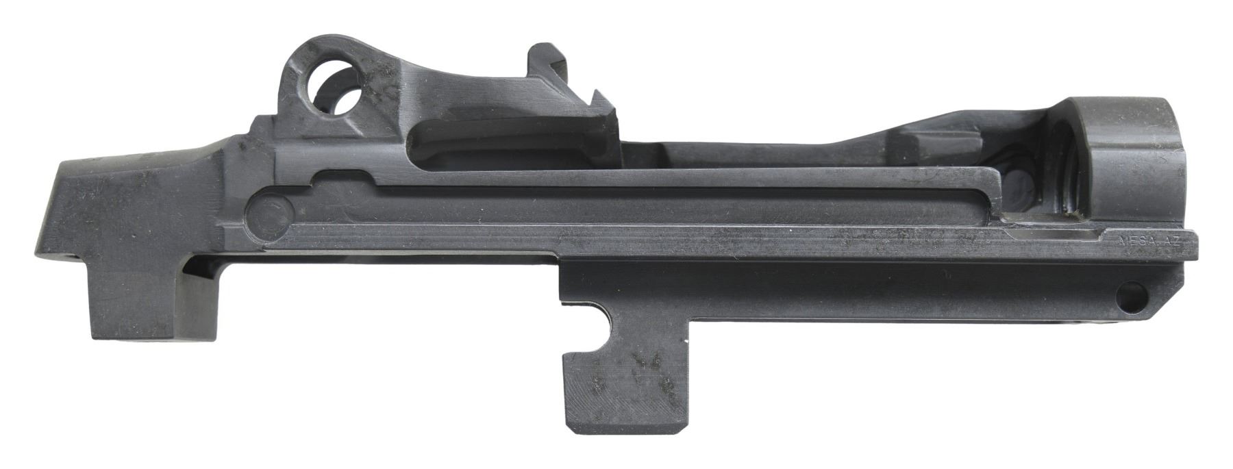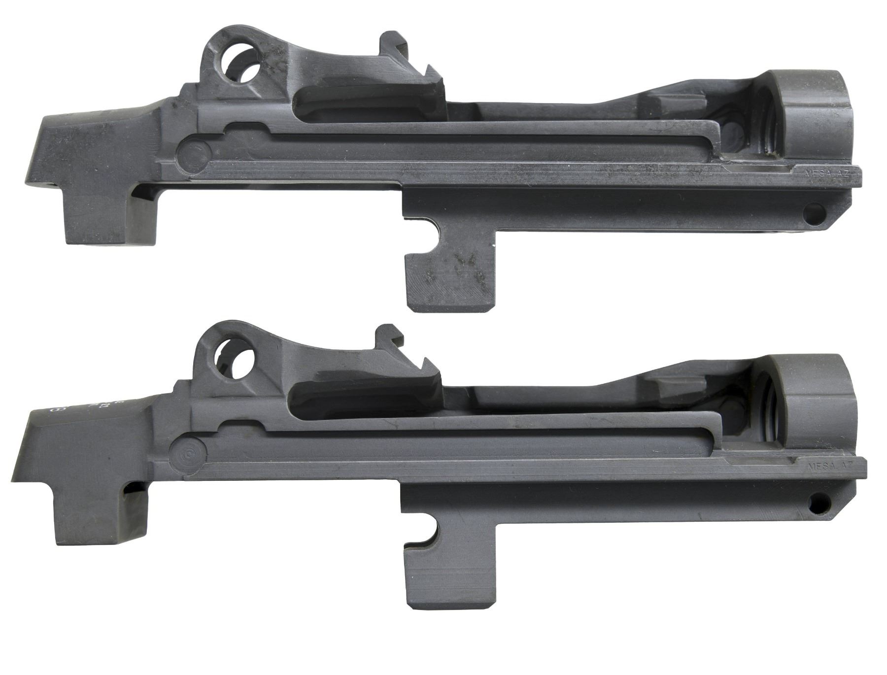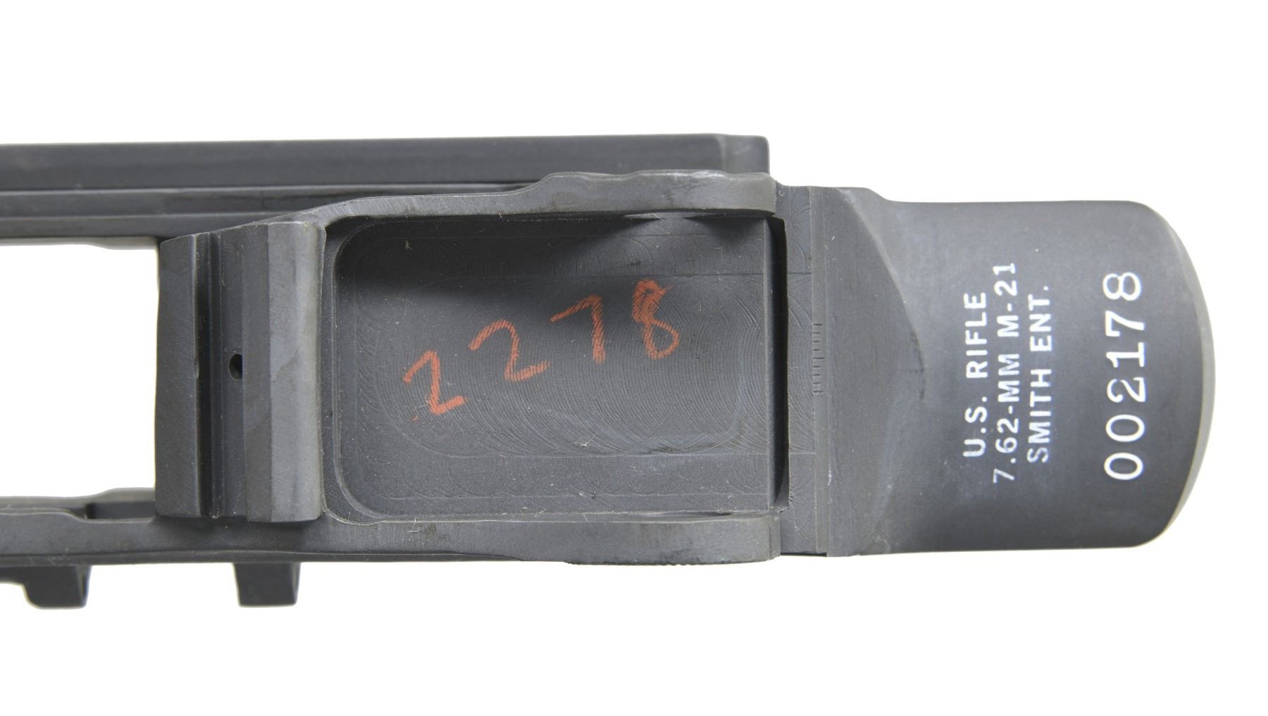 SEMI AUTO RIFLE RECEIVERS. No.1: M14 NM Receiver. S# 1002123. Rear lug receiver is marked on the heel w/ serifed letters "U.S. RIFLE / 7.62-MM M-14 NM / SMITH ENT. / serial number". Receiver is marked on forward end of right rail "MESA AZ". Receiver contains no additional parts & there is no evidence of fitting to a rifle. (25-3165/RW). No.2: M21 Receiver. S# 002178. Rear lug receiver is marked at heel "U.S. RIFLE / 7.62-MM M-21 / SMITH ENT. / serial number". Markings enhanced w/ white. Marked at forward end of right receiver rail "MESA AZ". Receiver has inventory number in red inside rear sight base. Receiver contains no additional parts & has not been fitted to a rifle. OVERALL CONDITION: receivers are in "as new" condition w/ only very tiny scattered handling marks. (25-3173/RW). BOTH MODERN. $400-600.