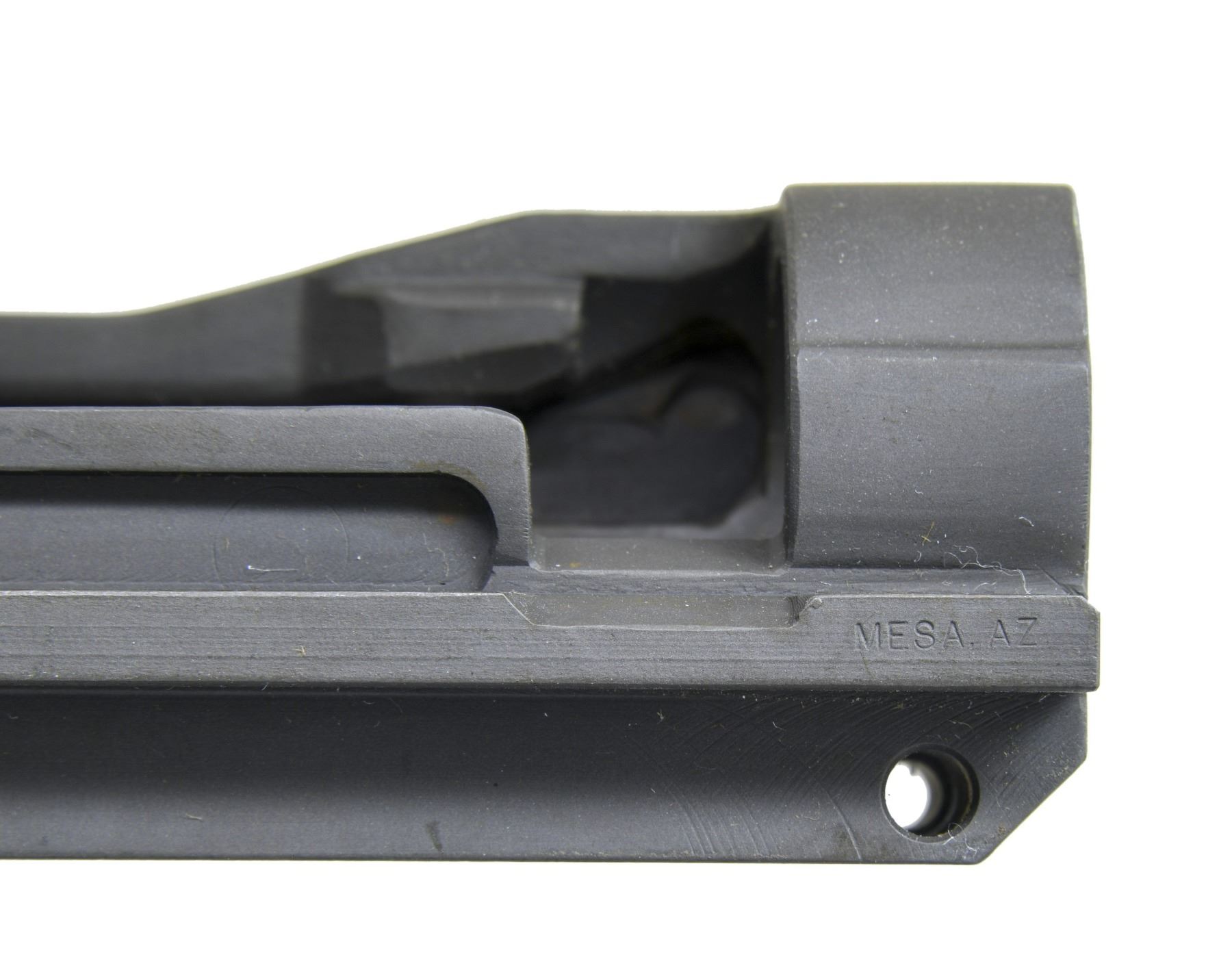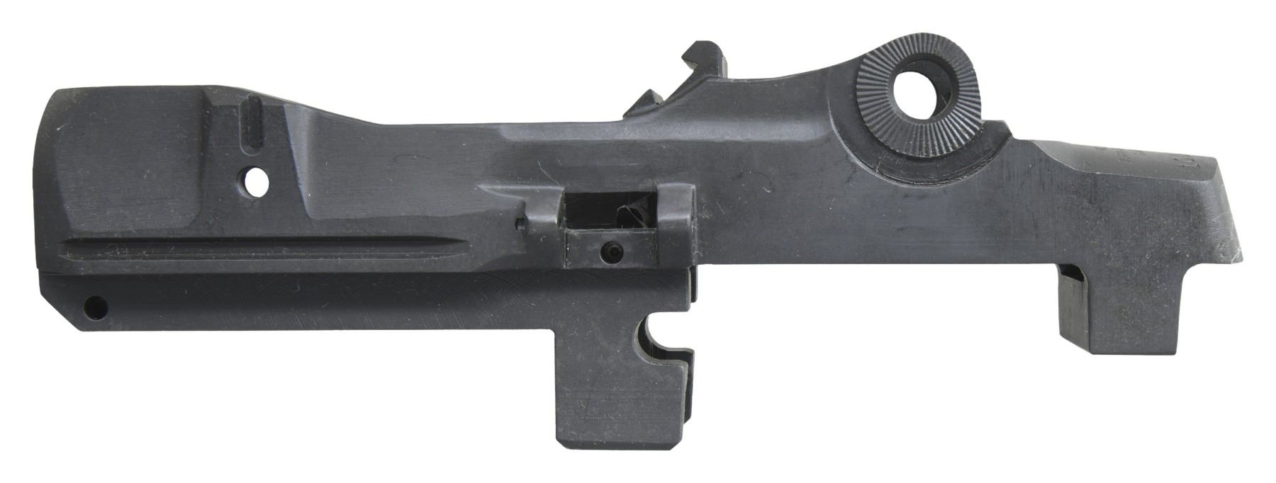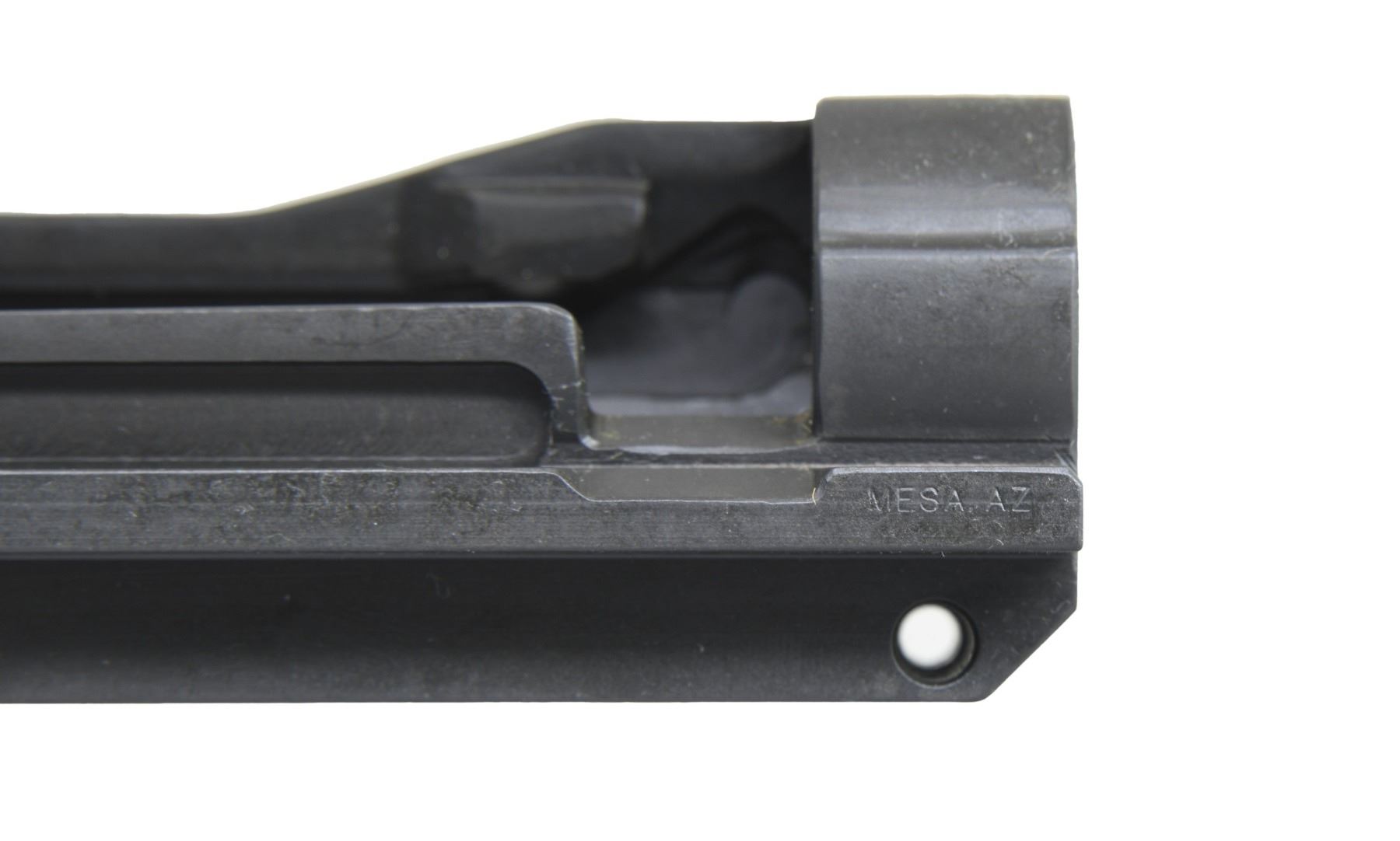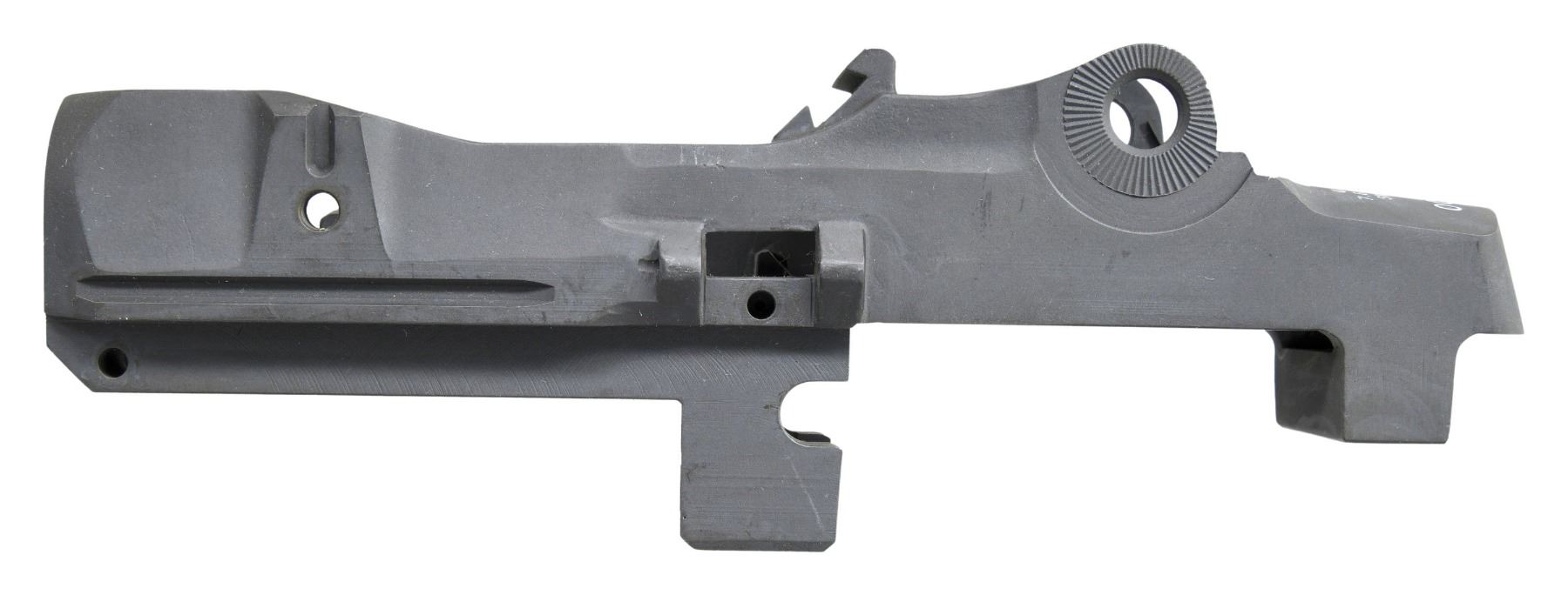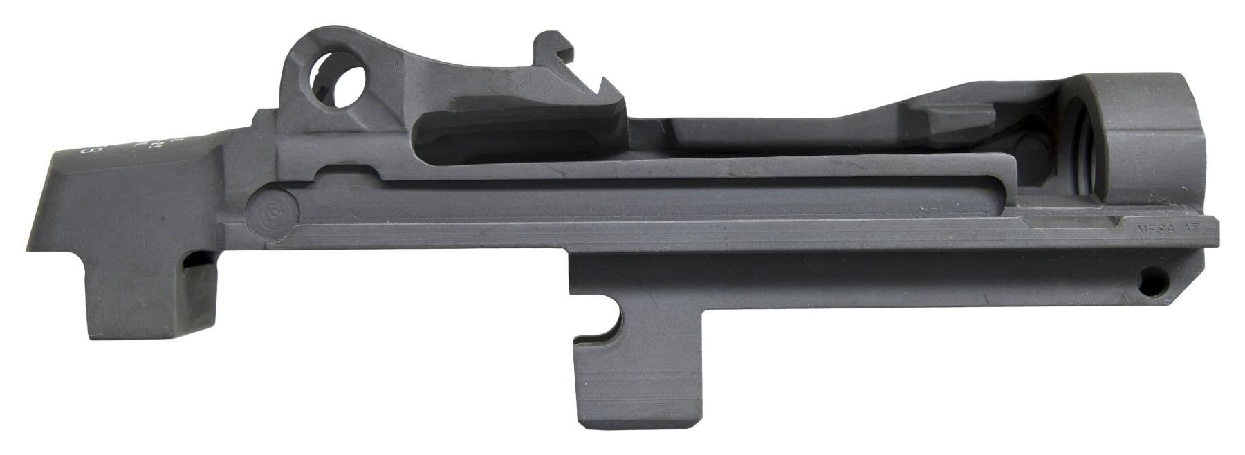 SEMI AUTO RIFLE RECEIVERS. No.1: M14 NM Receiver. S# 1002123. Rear lug receiver is marked on the heel w/ serifed letters "U.S. RIFLE / 7.62-MM M-14 NM / SMITH ENT. / serial number". Receiver is marked on forward end of right rail "MESA AZ". Receiver contains no additional parts & there is no evidence of fitting to a rifle. (25-3165/RW). No.2: M21 Receiver. S# 002178. Rear lug receiver is marked at heel "U.S. RIFLE / 7.62-MM M-21 / SMITH ENT. / serial number". Markings enhanced w/ white. Marked at forward end of right receiver rail "MESA AZ". Receiver has inventory number in red inside rear sight base. Receiver contains no additional parts & has not been fitted to a rifle. OVERALL CONDITION: receivers are in "as new" condition w/ only very tiny scattered handling marks. (25-3173/RW). BOTH MODERN. $400-600.