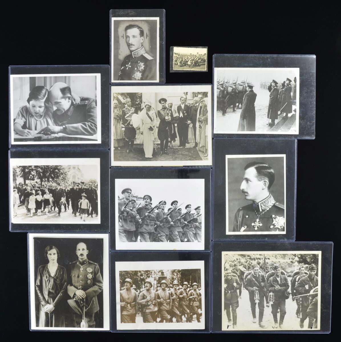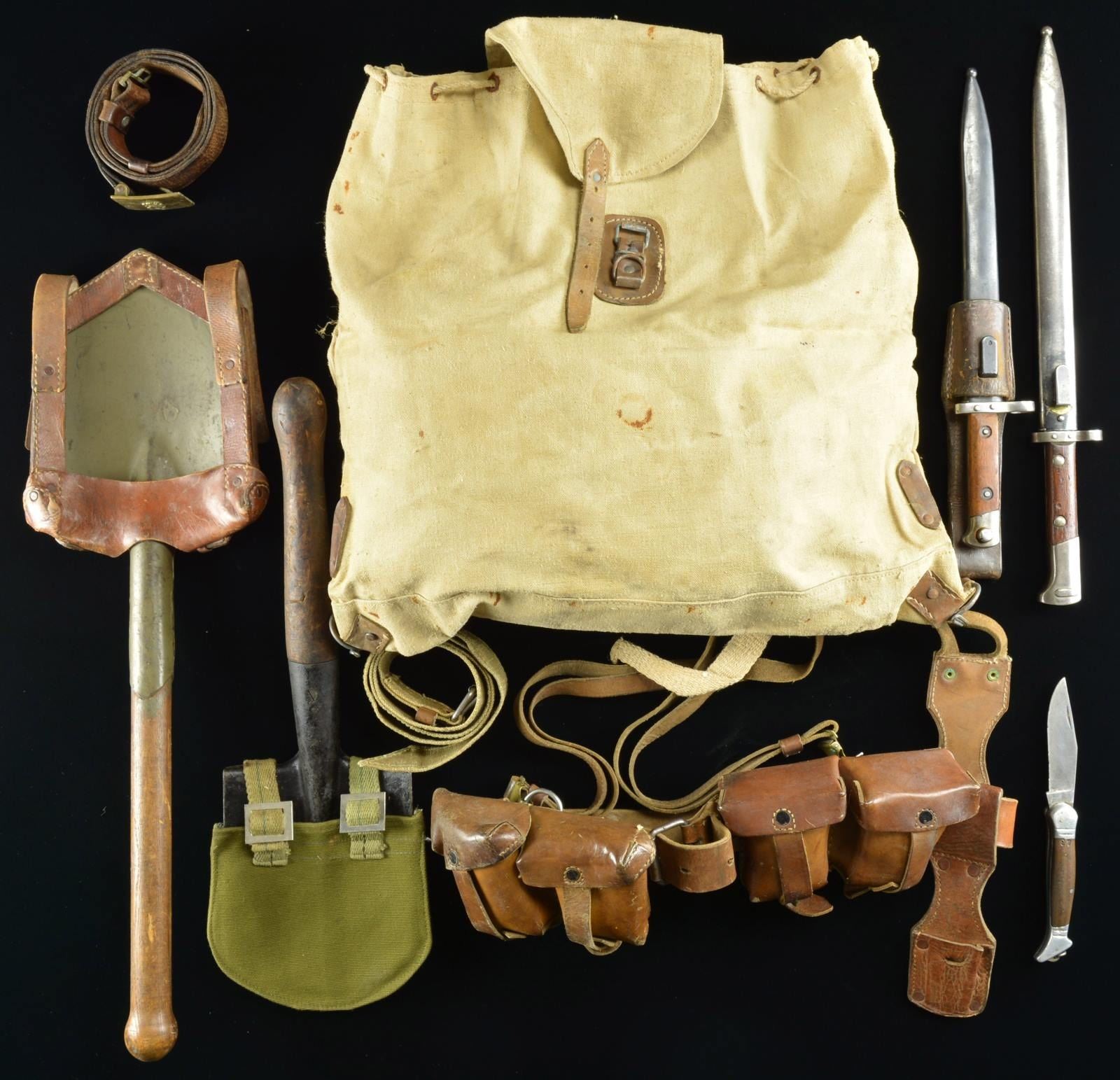 EQUIPMENT. This group contains: an Austrian M1895 Steyr bayonet with Bulgarian markings. Overall length: 14 3/4" with original leather frog. / 1 WWII era Romanian entrenching shovel with green canvas case. / 1 Bulgarian army gas mask dated 1939 in green canvas carrying pouch. / 1 Bulgarian leather combat suspender straps. / 1 Pair of Bulgarian hobnail short boots from Sofia. / 1 Bulgarian enlisted brown leather belt with a pair of 2-pocket cartridge pouches & over the shoulder suspender straps. / 1 Bulgarian army mess kit. / 2 German style canteens utilized by the Bulgarian army. 1 is felt covered aluminum, the other has a wood body. / 2 Brown leather 2-pocket cartridge pouches. / 1 Austrian entrenching shovel with leather harness utilized by the Bulgarian army. / 1 Green canvas & leather Bulgarian army officers map case. / 1 Romanian M1935 gas mask in original canister. / 1 Bulgarian brown leather NCO belt & buckle. / 1 Bulgarian first aid bandage. / 1 Bulgarian flashlight. / 1 Bulgarian mess cup. / 1 Bulgarian folding soldiers’ knife. / 1 Czechoslovakian VZ24 bayonet with Romanian contract marks. Overall length: 17 1/2". / 1 Tan cotton canvas Bulgarian bread bag. / 1 Bulgarian tan canvas knapsack containing a uniform tunic & pants, 2 canteens, tent poles, and dog tag. / 1 Green canvas Bulgarian tropical belt as used in Macedonia. / 13 Period photographs of mostly Bulgarian army officers in uniform. CONDITION: all items show light to moderate wear and appear fully functional. Photographs remain generally sharp and clear. (02-16423/BF). $500-800.