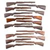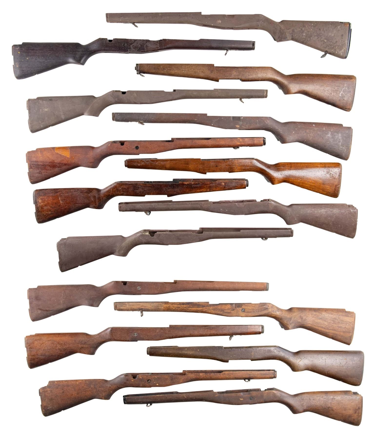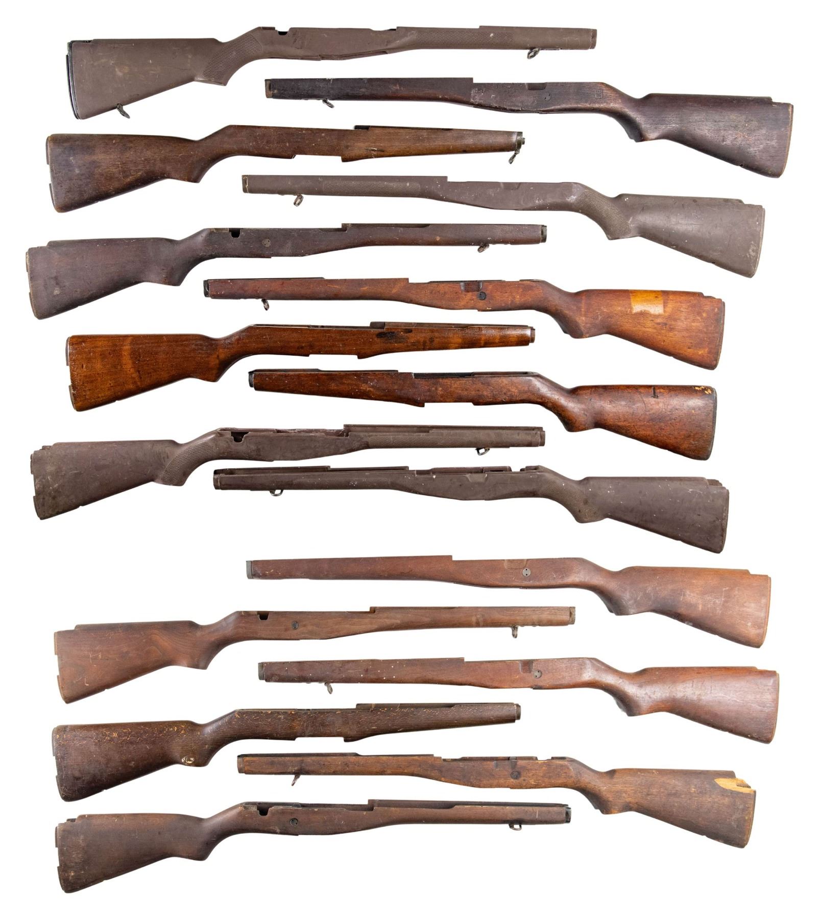 1) Four brown synthetic GI issue M14 stocks. Stocks have the later production "checkering". Stocks may be equipped with sling swivels, one has the original buttplate assembly. CONDITION: stocks have light wear and scuffing, but appears serviceable. 2) Four GI issue M14 stocks with metal liners. Several of them have front sling swivels. CONDITION: one stock has crack in selector switch area and two large missing chips at heel. Three of the stocks appear to have moderate wear, but are in serviceable condition. 3) Three walnut M14 stocks GI issue with metal liners and front swivels. CONDITION: stocks have moderately worn original finishes, but appear in good serviceable condition. 4) One walnut M1A stock without selector switch cut. Stock is equipped with metal lines and front sling swivel. CONDITION: stock has moderately worn factory finish with scattered paint spots. 5) Four M1 Garand buttstocks. Three appear to be walnut US GI, one has encircled "P" proof. The fourth stock appears to be Italian hardwood that has the serial number stamped at belly. CONDITION: stocks have moderate wear, staining and handling marks throughout, but appear serviceable. (01-25371-1/RW). NON-GUN. $600-900.