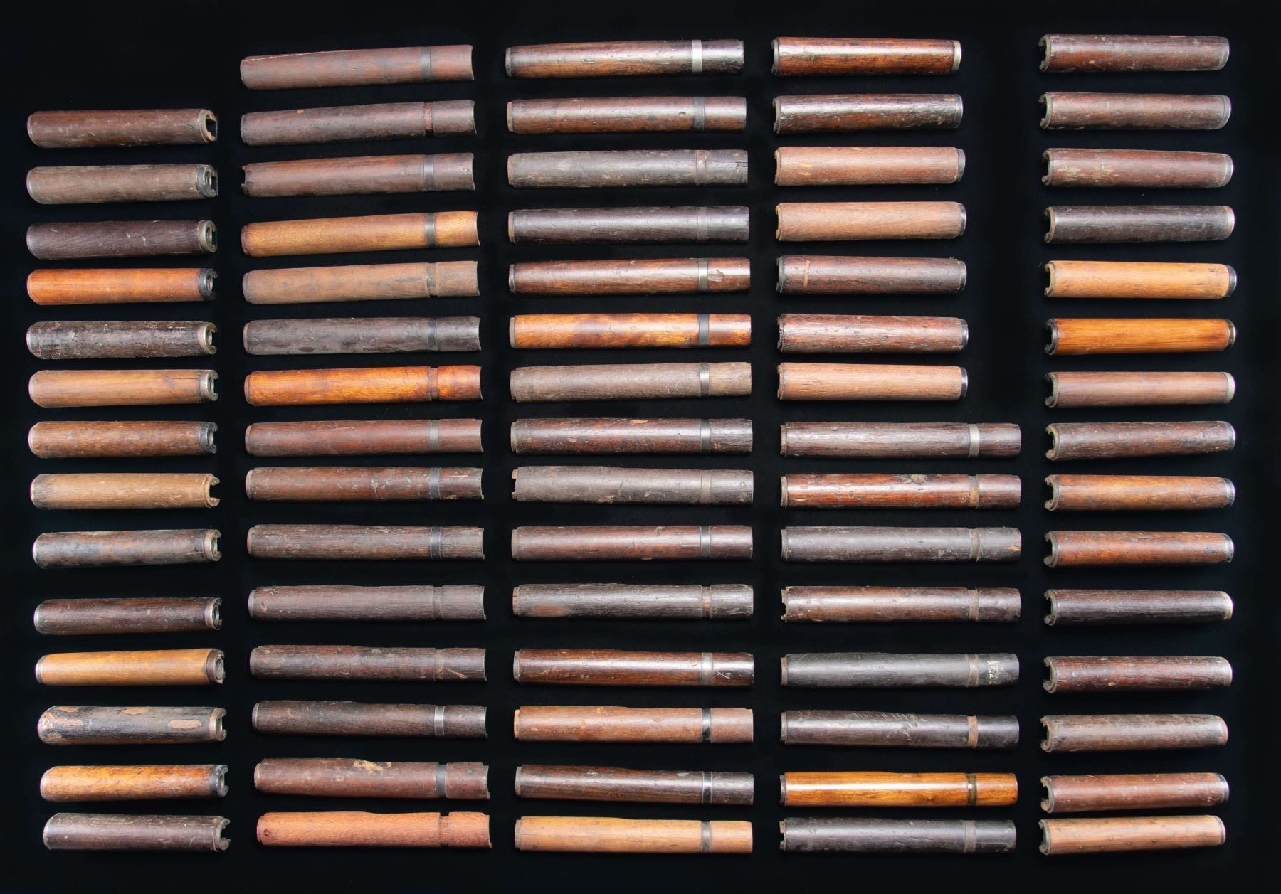 MILITARY RIFLE HANDGUARDS. The handguards are a mix of US & foreign manufacture. Many are walnut. These handguards appear to be removed from rifles which had seen long hard service in harsh environments. Many have ferrules & retaining clips. CONDITION: handguards have wear, small cracks & handling marks, but most still appear to be serviceable. (02-24590-42/RW). NON-GUN. $400-600.