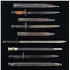 1) PATTERN 1907. 17" Fullered blade bayonet. Marked on left ricasso "crown GR" "1907 4-18 SANDERSON." Right ricasso marked w/ "broad arrow" & "view marks". Smooth walnut grips. Straight cross guard. Oil hole in pommel. Blade has dull gray finish. Balance of metal is blue. Steel tip leather scabbard. CONDITION: blade has been sharpened. Metal retains 75% original finish w/ light wear & scattered sm. spots of oxidation.