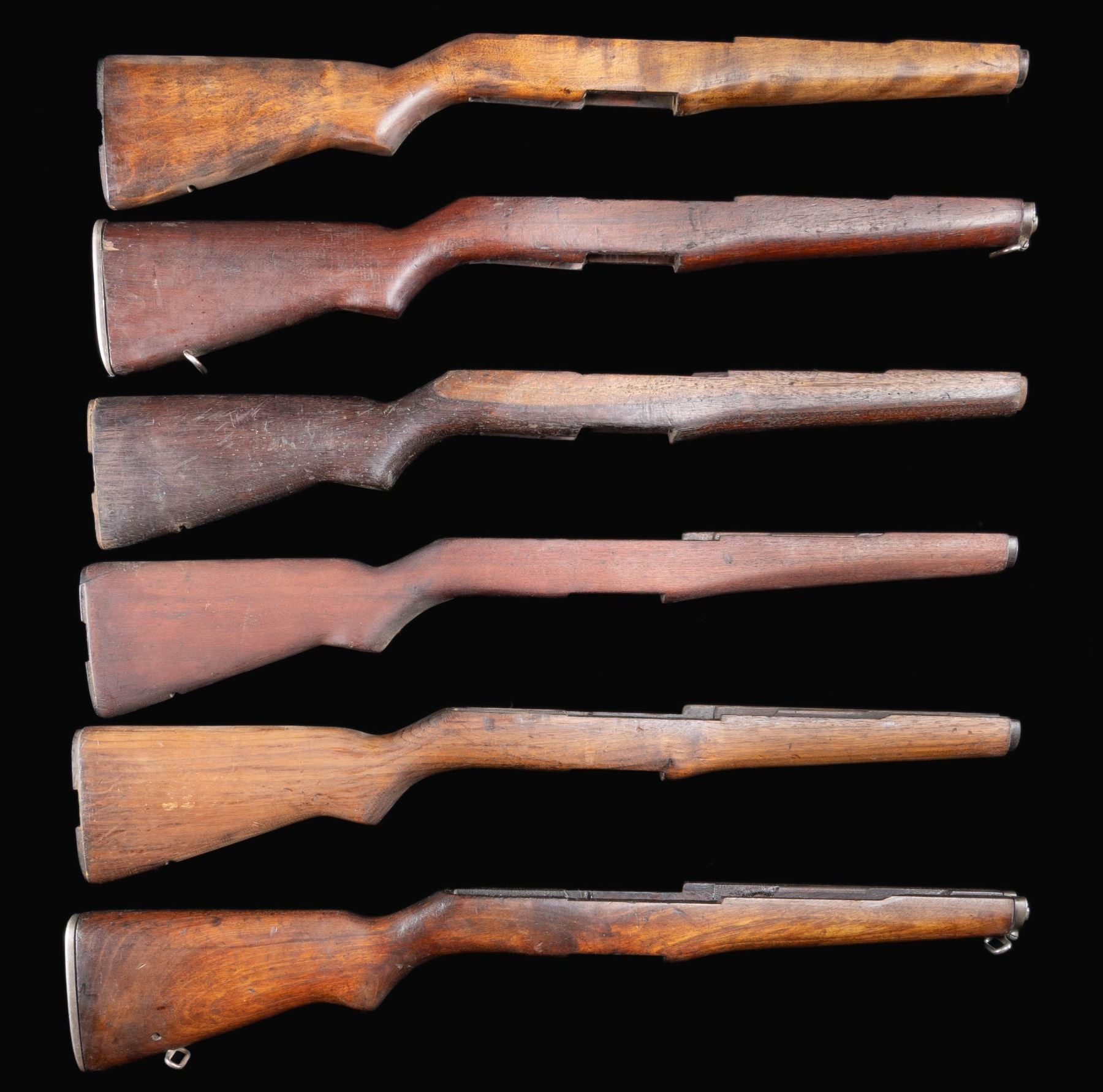 These buttstocks are nearly all walnut & unmarked. Many retain some of their original metal fittings, including ferrules, swivels & buttplates. Some of the buttplates are of a stamped replacement variety, made w/o traps. CONDITION: the stocks are well-worn from long service, having numerous handling marks, staining & small cracks. Metal parts retain little or no original finish. (02-24590-34/RW). NON-GUN. $800-1,100.