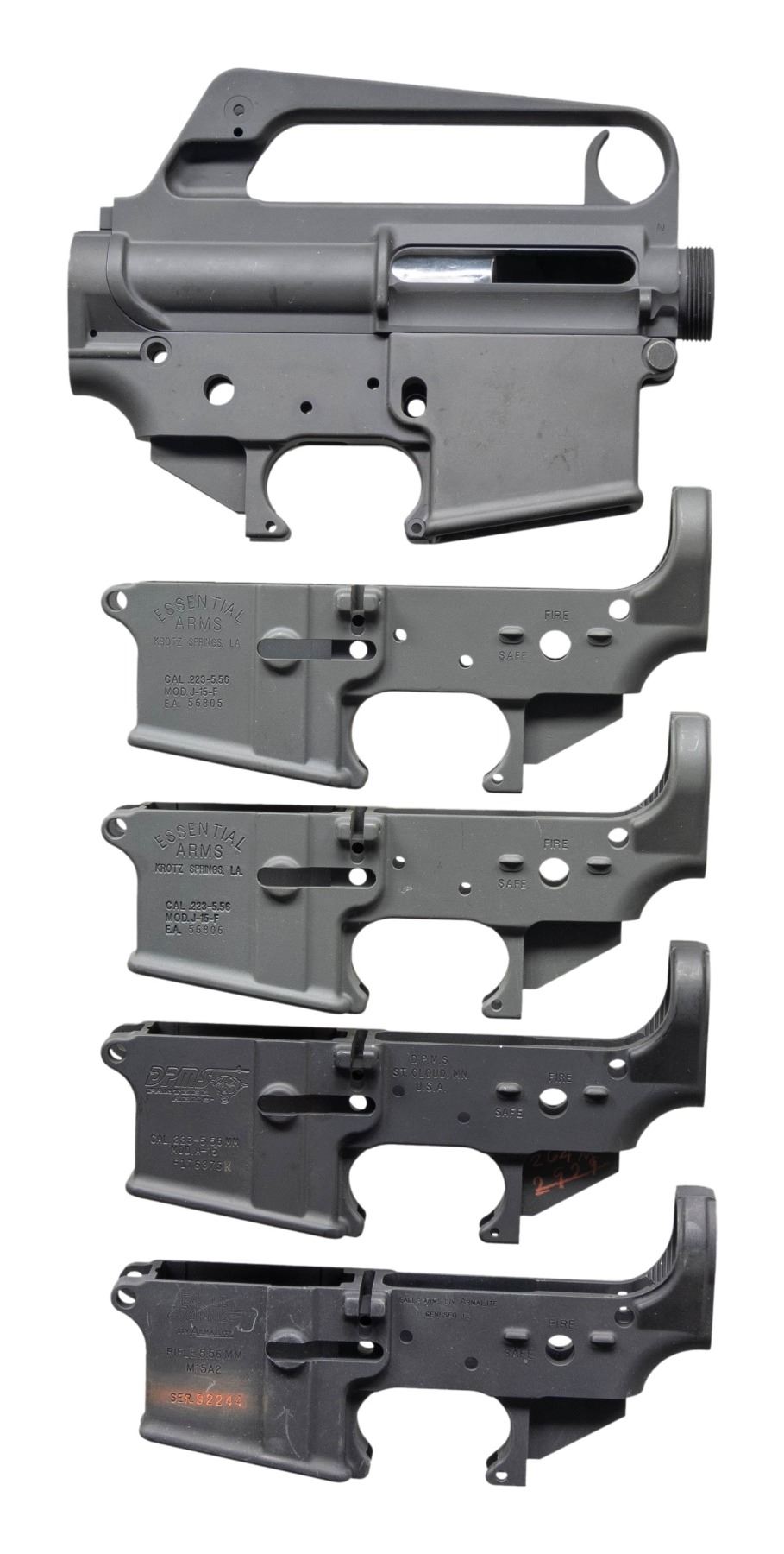 RECEIVERS. Cal. 223 / 5.56mm. Grouping of 5 unassembled lower receivers in the following configurations: