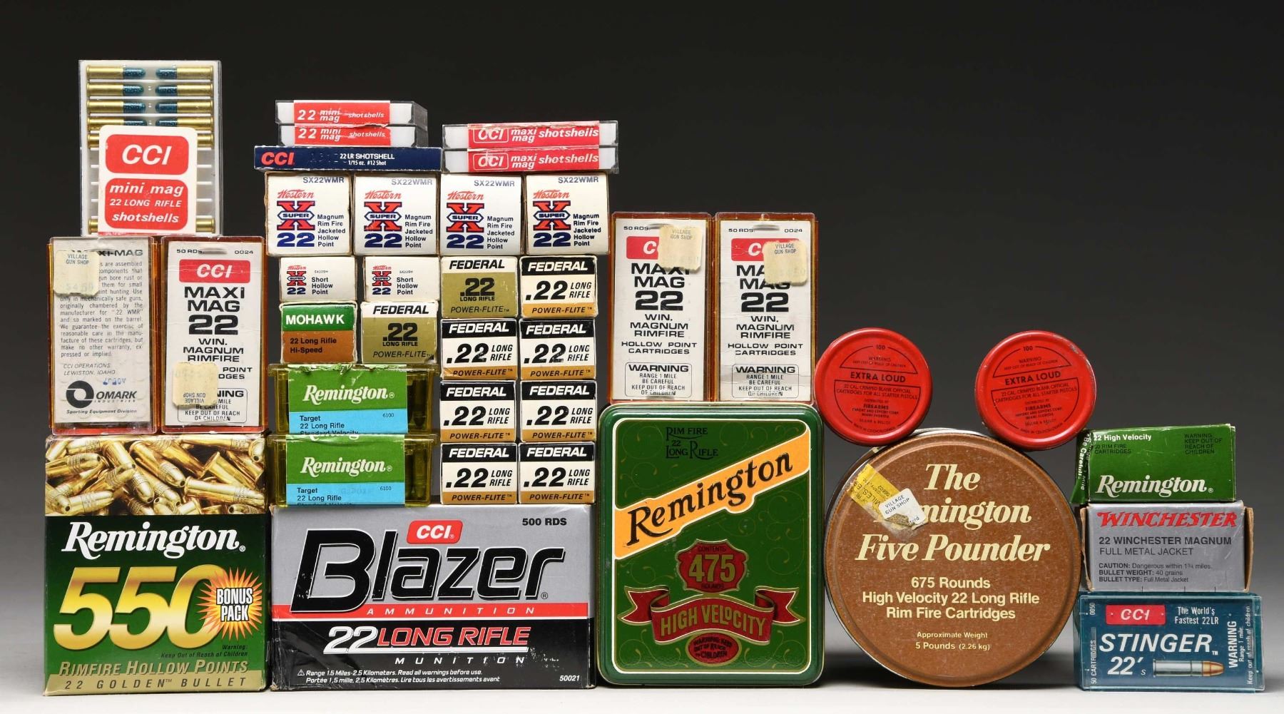 Lot contains hollow points. (22 crimped blanks for starter pistols.) No.1: SELLIER & BELLOT. Two tins of 100 rds. (200 total) (22 Short.) No.1: WESTERN SUPER-X. Two boxes of 50 rds., one partially full. / No.2: REMINGTON. One partial box of 50 rds., mostly full. (22 Long Rifle.) No.1: CCI BLAZER. One sealed brick of 500 rds. 40 grain bullet. (500 total) / No.2: FEDERAL POWER-FLITE. Nine boxes of 50 rds. High velocity lead bullet. (450 total) / No.3: REMINGTON HIGH VELOCITY. One commemorative tin of 475 rds., packed loose. / No.4: REMINGTON 5 POUNDER. One tin of 675 rds., approximately 1/4 remaining. / No.5: REMINGTON GOLD BULLET. One bulk pack of 550 rds. Hollow point. (550 total) / No.6: REMINGTON 22 TARGET STANDARD VELOCITY. Two boxes of 100 rds., one half empty. (150 total) / No.7: REMINGTON MOHAWK HIGH SPEED. One partial box of 50 rds., mostly full. / No.8: CCI STINGER. One partial box of 50 rds., 20 remaining. (20 total) / No.9: CCI MINI MAG SHOT SHELLS. Three boxes of 20 rds., one with 12 remaining. (52 total) / No.10: CCI SHOT SHELL. One tray of 20 rds. (20 total) (22 Magnum.) No.1: CCI MAXI MAG. Four boxes of 50 rds., one partial with 15 remaining. (165 total) / No.2: WESTERN SUPER-X. Four partial boxes of 50 rds., each mostly full. 40 grain jacketed hollow point. / No.3: WINCHESTER. One partial box of 50 rds., mostly full. 40 grain full metal jacket. / No.4: CCI MAXI MAG SHOT SHELLS. Two boxes of 20 rds., one partial with 14 remaining. (34 total) (02-24605-5/RW). AMMO. $100-200.