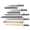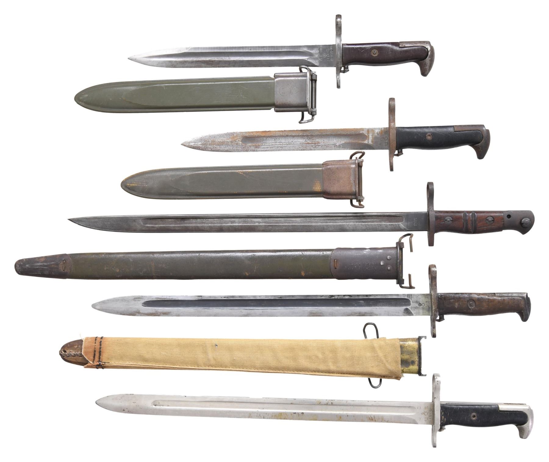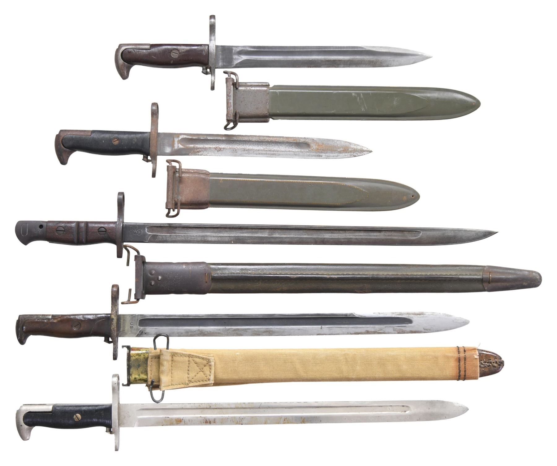 No.1: US Model 1917. 17" fullered blade. Blade is marked on left ricasso "1918 / encircled REMINGTON". Right ricasso marked w/ "flaming bomb / eagle head / 26 / U.S. / opposed arrows". Hardwood grips w/ two vertical grooves retained by two screws. Oil hole in pommel. Green leather scabbard w/ metal throat & tip. Scabbard marked "JEWELL-1918". CONDITION: sharpened blade has wear & loss of finish turning patina. Grips have moderate wear & handling marks. Balance of metal shows oxidation & patina. Scabbard has wear, scuffing & handling marks. Metal is oxidized. No.2: US Model 1905. 15 7/8" fullered blade. Marked on left ricasso "SA / flaming bomb / 1918". Right ricasso is marked "US / eagle head / serial number". Smooth walnut grips retained by single screw. Canvas covered rawhide scabbard. CONDITION: blade has traces of blue turning gray & has been sharpened. Balance of metal turning gray & patina. Grips are heavily worn w/ missing chips. Scabbard is in poor condition w/ partially detached canvas covering. Leather tip is not present. No.3: US Model 1942. 15 3/4" fullered blade. Blade is marked on left ricasso "U.C. / U. flaming bomb S. / 1942". Left ricasso has partial crossed cannons. Grooved plastic grips. Scabbard is not present. CONDITION: metal is plated over wear & grind marks w/ flaking finish. Grips are worn. No.4: US Model 1905-E1. 9 7/8" fullered blade. Bayonet has been shortened from a Model 1942 which allows the fuller to extend through the point. Left ricasso marked "AFH / flaming bomb US / 1942". Right ricasso marked "U.C.-MOD.". Grooved plastic grips. Green plastic scabbard w/ metal throat marked "US" & "flaming bomb". CONDITION: well-worn bayonet has been sharpened. Grips have extensive wear & handling marks. Scabbard is in good serviceable condition. No.5: US M1 Bayonet. 9 3/4" fullered blade. Blade marked on left ricasso "U.C. / flaming bomb U.S.". Grooved plastic grips. Green plastic scabbard w/ metal throat marked w/ "US" in "flaming bomb". CONDITION: bayonet shows extensive grind marks w/ dents on the back. Metal has oxidation & patina throughout. Scabbard is solid & serviceable. (02-24261-5/RW). NON-GUN. $150-250.
