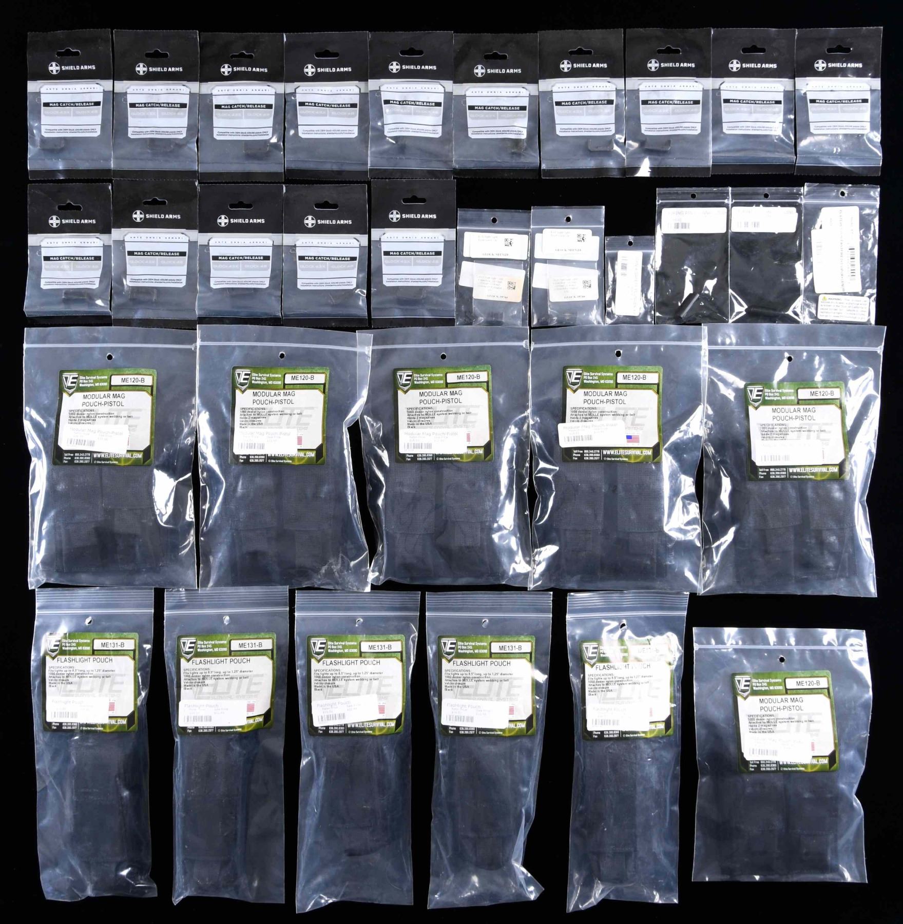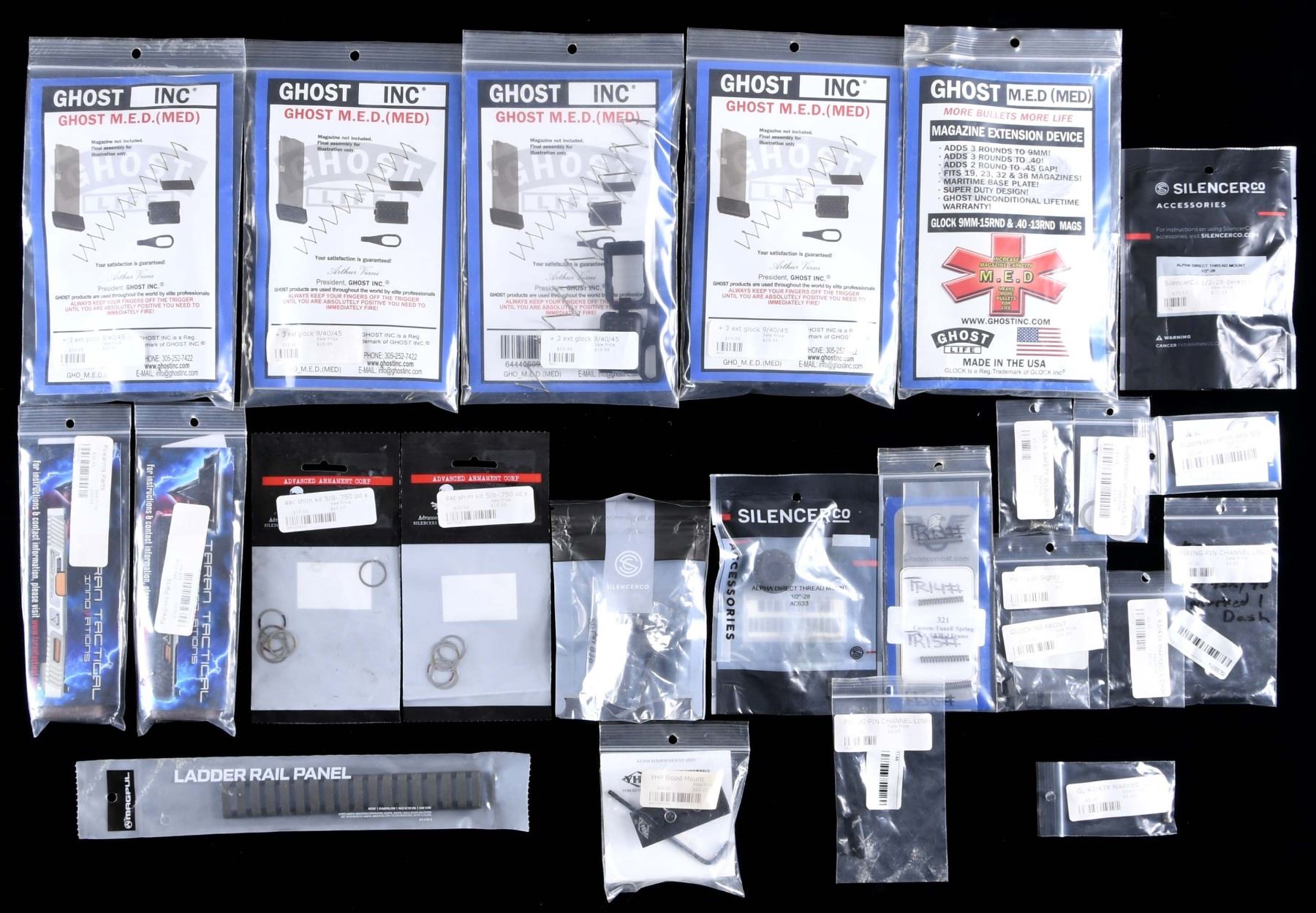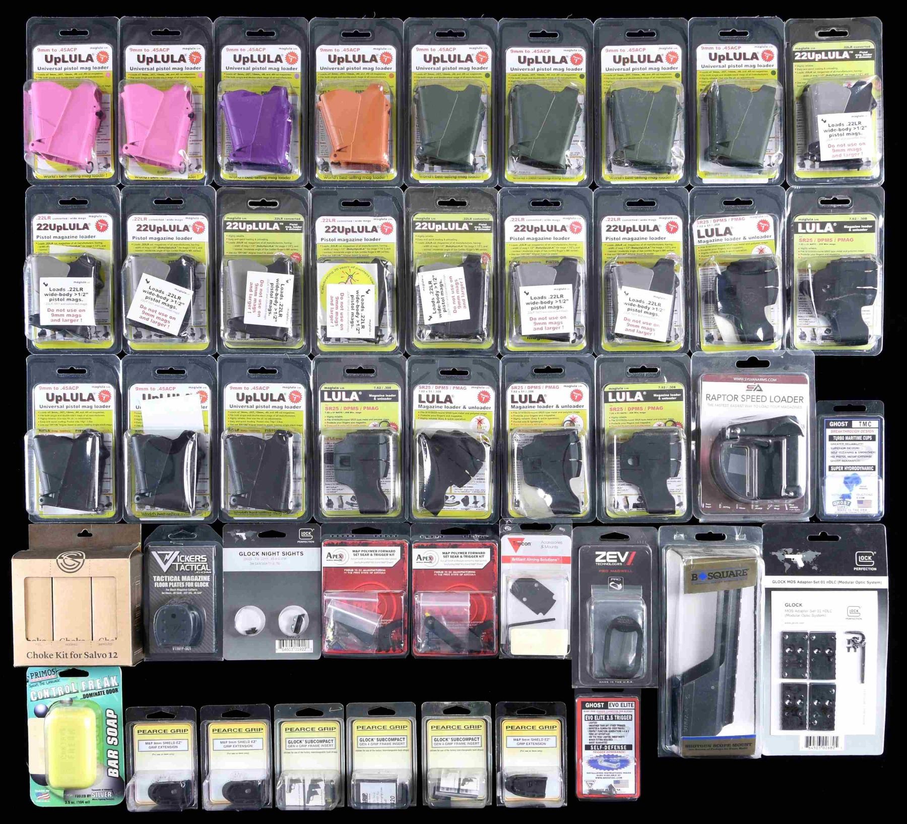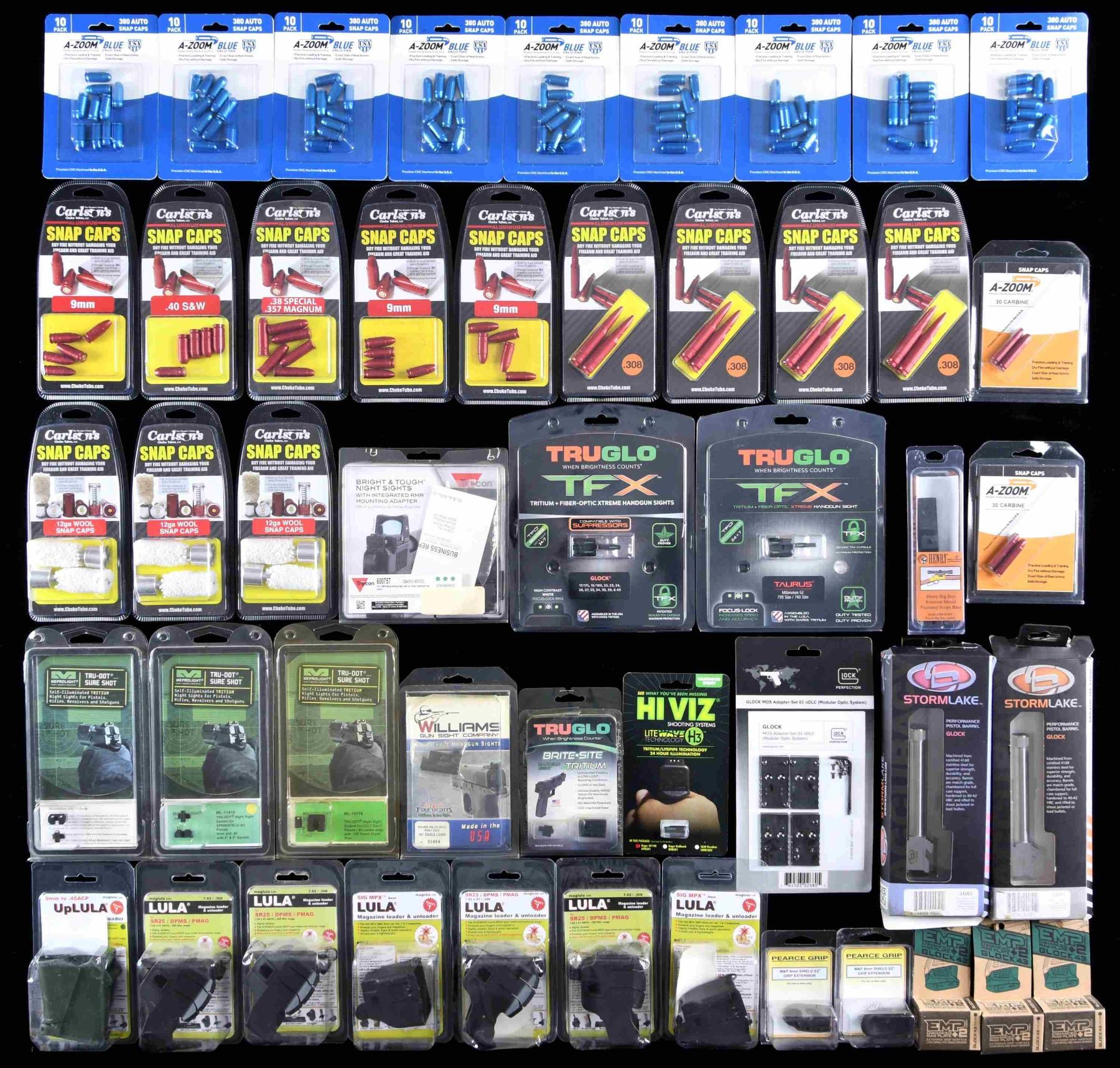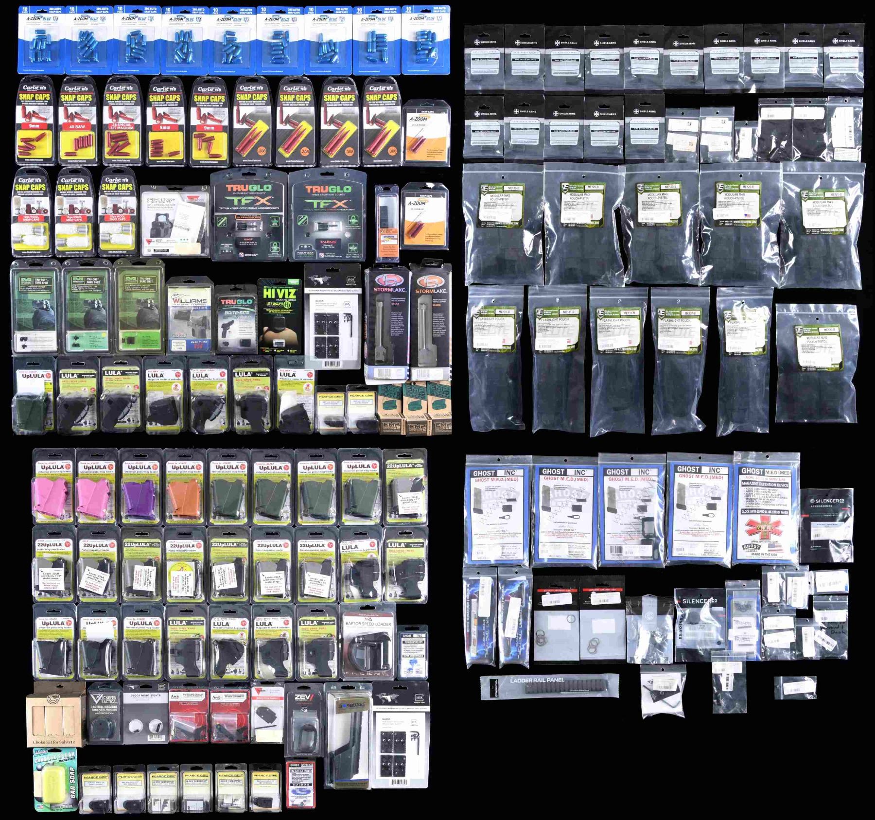 All items appear new in factory packaging. Counts carefully done but there may be an occasional numerical error. ELITE SURVIVAL SYTEMS: 5 ME131-B black nylon Flashlight Pouches. / 6 ME120-B black nylon Modular Mag Pouches - Pistol. / UpLULA: 12 loaders 9mm-45ACP (5 dark green, 3 black, 2 pink, 1 purple & 1 orange). / 8 loaders 22LR. / LULA: 9 SR25 loader & unloaders. / 2 Sig MPX loader & unloaders. / 1 Sylvan Arms Raptor Speed Loader, 380ACP-45ACP. / PEARCE GRIP: 5 S&W M&P Shield EZ grip extensions. / 3 Gkicj Subcompact GEN4 grip frame inserts. \ EMP: 3 Glock 43 Enhanced +2 mag plates. / TARAN TACTICAL: 2 Glock +3 base pad kits in Coyote Bronze. / GHOST INC.: 5 Medium Base Extensions (+3 rds. & +2 for GAP45). / 2 Glock Evo Elite 3.5 triggers. / 2 TMC (Turbo maritime Cups). / SILENCER CO.: 2 Alpha Direct 1/2"-28 Thread Mounts. / 1 ASR 30 cal. Muzzle Brake, 9/16"-24 AC1276. / 1 AC828 Mossberg Choke Mount Kit. / 2 Apex Tactical Specialties M&P Polymer Forward Set Sear & Trigger Kit. / 1 Vickers Tactical 5 pack of Glock floor plates. / 1 ZEV Technologies Pro Magwell MW.K-STD-PRO-AL-B. / 2 ADVANCED ARMAMENT CORP. shim kits. / 15 SHIELD ARMS Glock 43X mag. latches. / 9 A-ZOOM 10 packs of blue 380ACP snap caps. / CARLSON'S SNAP CAPS: 3 packs of 5 in 9mm. / 1 pack of 5 in 40 S&W. / 1 pack of 6 in 38 Spl.-357 Mag. / 2 packs of 2 in 30 Carbine. / 4 packs of 2 in .308. / 3 packs of 2 in 12 Ga. with wool mops. / 2 STORM LAKE 416R stainless Glock 17 barrels in 9mm having 1/2"-28 threaded muzzles with knurled thread protectors. / 1 B-SQUARE Shotgun Scope Mount for Remington Model 870 in 20 Ga. / TRU-GLO: 1 Tritium fiber optic sight set for most Glocks. / 1 Tritium fiber optic sight set for Taurus Millennium G2 as 709 and 740 slims. / 1 Brite-Site TG231N3 Novak LoMount for Officer's and Commanders. / 1 HI-VIZ Lite Wave H3 Ruger GP100 front sight. / MEPROLIGHT: 2 Tru-Dot Sure Shot sight sets for Springfield XD's. / 1 Tru-Dot Sure Shot sight set for Colt Governments with .125" front sight tenon. / GLOCK: 3 night sight sets with #NF17G24 and 39744. / 1 #39929-6.9 for various models. / 2 MOS 4 pack adapter plate sets #01 nDLC. / TRIJICON: 1 Bright & Tough Night Sight set with integrated RMR mounting adapter. / 1 RMR Mounting Kit for Glock MOS Models. / 1 Heckler & Koch Plate #5 for VPOR, Viper, Venom or Fastfire2+3. / 1 Williams Fire Sights for post 2015 Ruger MK-III's with bull barrels. / 2 GEN4 Glock Safety Plungers. / 2 Glock 43-43X safety plungers. / 4 black plastic Glock firing pin channel liners. / YHM (Yankee Hill Machine): 1 Bipod Mount. / 2 5/8" suppressor shim sets. / 1 Wilson Combat 4 pack of S&W J frame #321 Custom Tune Springs. / 1 MAGPUL Ladder Rail Panel. / 1 Henry Big Boy Picatinny Scope Base. / 1 PRIMOS Hunting Control Freak bar of soap. (02-23801/NW). $800-1200.