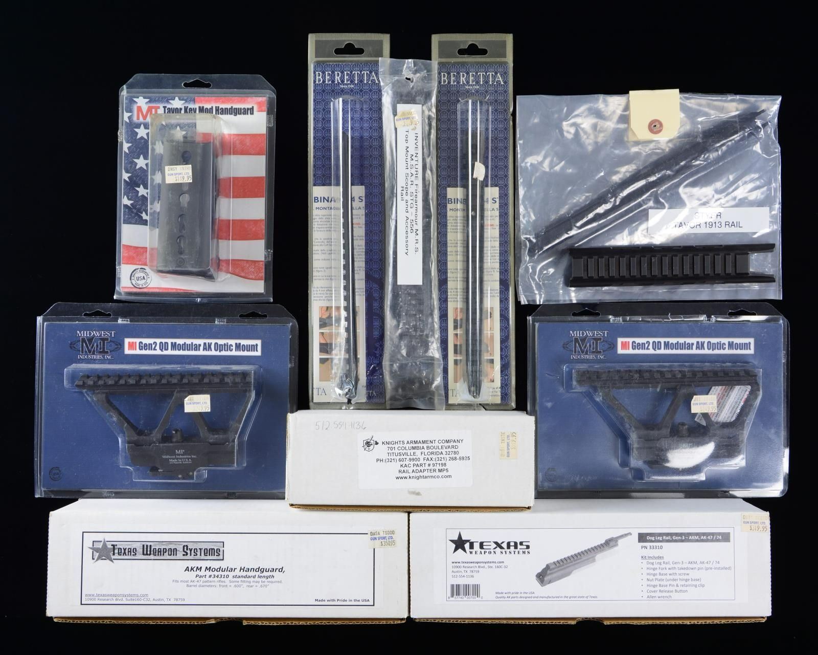 Lot includes the following: 1) 1 Texas Weapon Systems Dog Leg Rail. Part # 33310. 2) 1 Texas Weapon Systems AKM Modular Handguard. Part # 34310. 3) 2 Midwest Industries Gen 2 QD Modular AK Optic Mount. Part # MI-AKSMG2-R. 4) 1 Midwest Industries Tavor MOD Handguard. Part # MI-TKH. 5) 1 Knights Armament Co. MP5 Rail Adapter. Part # 97198. 6) 2 Beretta CX4 Storm Top Picatinny Rail. Part # E00268. 7) 1 Steyr Tavor 1913 Rail. 11". 8) 1 Inventure M.S.A.R. STG-556 Top Mount Scope Rail. Part # MRS-TM. CONDITION: All parts appear to be new, in factory retail packaging. PROVENANCE: The Collection of Gun Sport Ltd owned by Jon R. Thomas. (02-20847-5/JZ) $800-1,200.