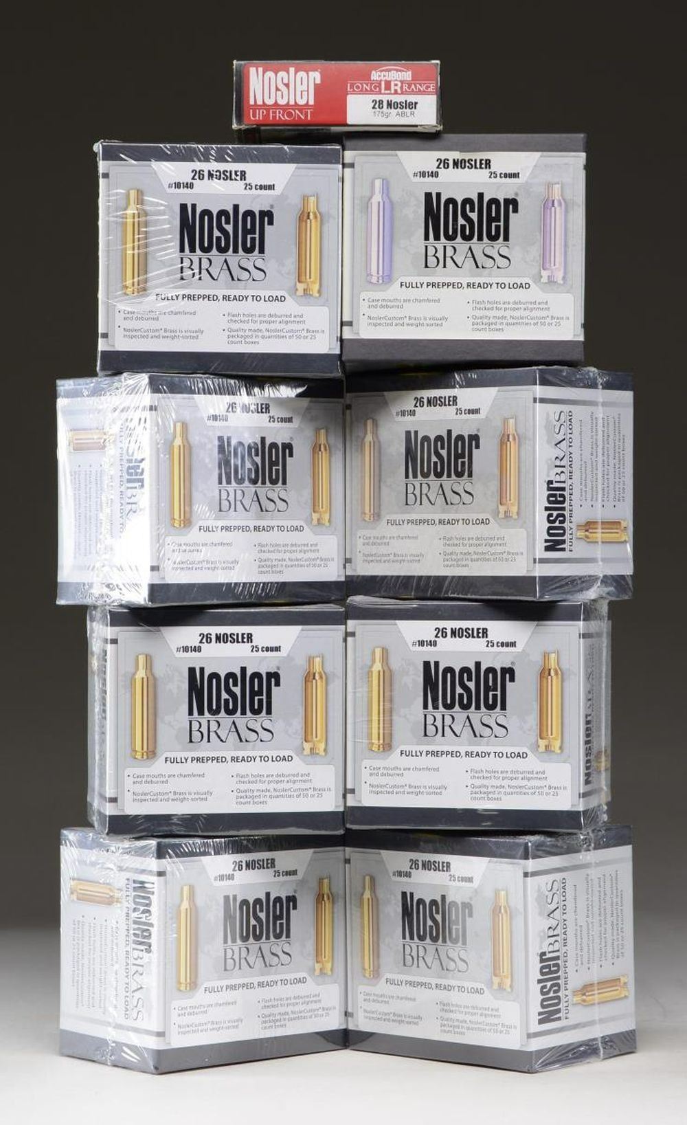 Lot includes 8 boxes (200 pieces) Nosler Brass, fully prepped, ready to load. 26 Nosler, & 1 box (20 pieces) of 28 Nosler fired brass in the factory box as originally shipped. CONDITION: 7 boxes are unopened & still wrapped in cellophane. PROVENANCE: The Collection of Gun Sport Ltd owned by Jon R. Thomas. (02-20854-2/JZ) $600-800.