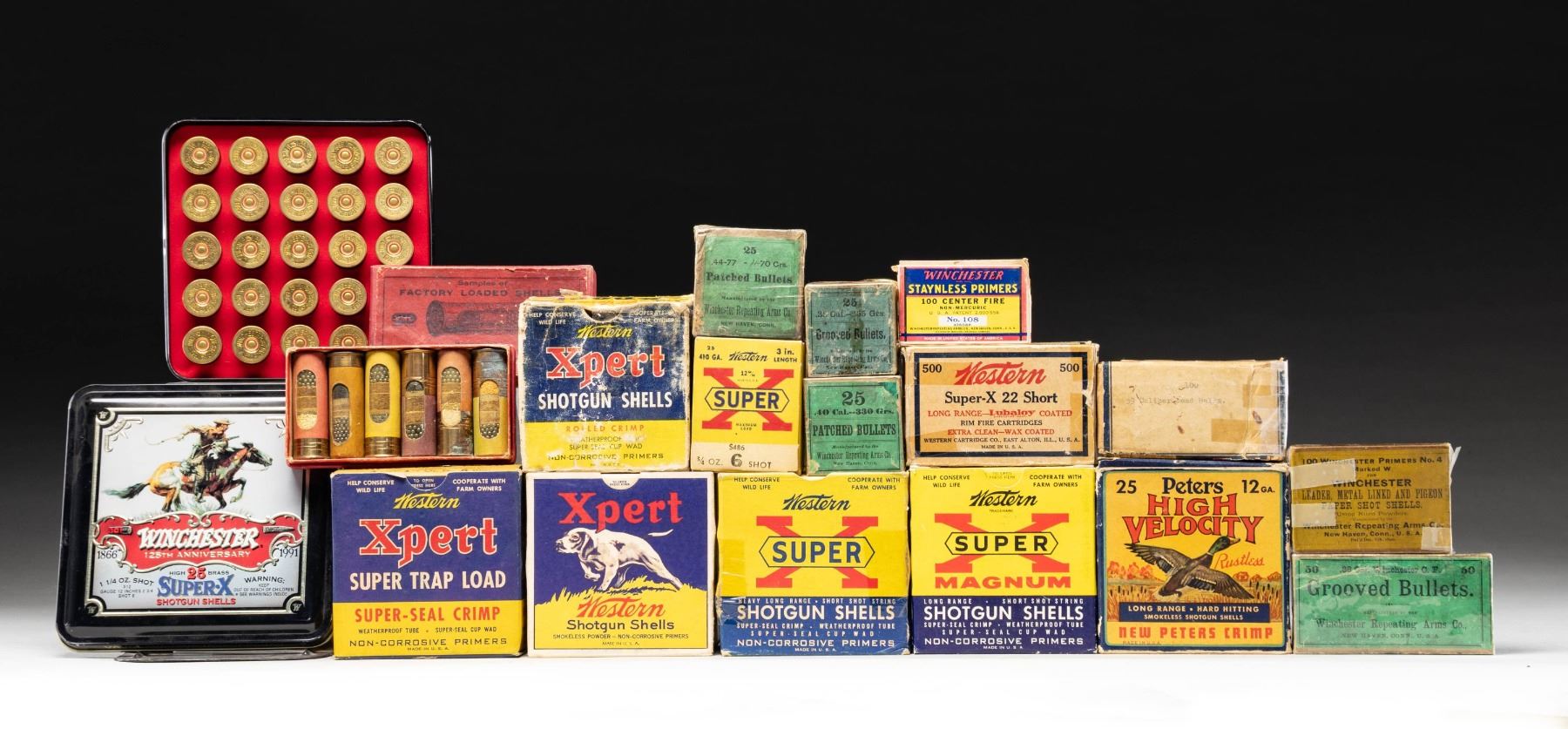 HAND-LOADING COMPONENTS. (Union Metallic Cartridge Company) Window Shells. The six sample paper shot shells loaded by UMC are in a red two-piece box. Box markings on top include "SAMPLES OF FACTORY LOADED SHELLS" and shows a UMC arrow pictured. The shells are cut away at the sides and have a clear window showing a view of the components. Two of the shells are headstamped "Nitro Club", two are "Arrow", one is "Trap" and one other is "New Club". Box has handling wear, scuffing and staining, but remains solid and legible. Shot shells in good condition, except for two which have oxidation issues on the brass head. / 12 GAUGE: (Winchester) 125th Anniversary Tin containing 25 SuperX plastic 2 3/4" shot shells loaded with No.6 shot. Tin has horse and rider logo. / (Western) Expert Super Trap Load. 2 3/4" no.8 shot. 25 rounds. / (Western) Expert U.S. PROPERTY. 2 3/4" 00 buckshot. One box of 25 rounds. / (Western) SuperX Magnum. 2 3/4" no.4 shot. One box of 25 rounds. / (Western) SuperX. 3" no.6 shot. One box of 25 rounds. / (Peters) High Velocity. 2 3/4" no.7 1/2 shot. One box of 25 rounds. / 16 GAUGE: (Western) Expert 2 9/16" shells. No.6 shot. 25 round box, 23 remaining. / 410 GAUGE: (Western) SuperX 3". No.6 shot. 25 round box. / 22 SHORT: (Western) SuperX Long Range Lubaloy. One blue and white brick of 500 rounds. / 44/77: (Winchester) 470 Grain Patched Bullets. Plain box with green labeling. One box of 25 rounds. Box has wear and staining with legible marking. / 40 CALIBER: (Winchester) Patched Bullets. 330 Grain. One box of 25 rounds. Plain box with green labeling. Box has staining and wear. Markings are legible. / 38 CALIBER: (Winchester) Grooved bullets. One box of 50 rounds. Plain box with green labeling. Box has wear and staining with legible markings. / (Winchester) Grooved bullets. 255 Grain. One box of 25 rounds. Plain box with blue labeling. Box has wear and staining with generally legible marking. / PRIMERS: (Winchester) No.4 for Nitro powders for Leader, metal lined and pigeon paper shot shells. Tan box with yellow labeling. One box of 100 primers. / STAINLESS PRIMERS: (Winchester) Non-Mercuric. Tray of 100 primers. Red, blue and yellow labeling with wear and partly missing end flap. / Group also contains: partial box of 100 lead balls marked only with "39 caliber lead balls". CONDITION: as stated above. PROVENANCE: The Esteemed Norm Greenberg Collection. (02-24841-16/RW). AMMO. $300-500.