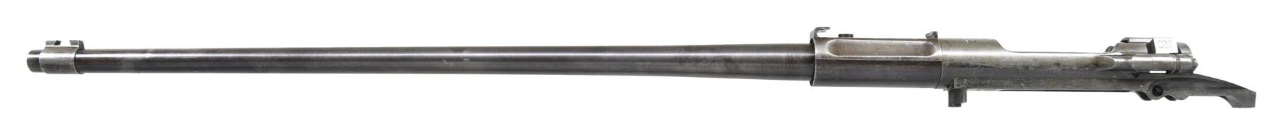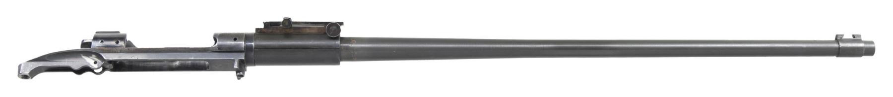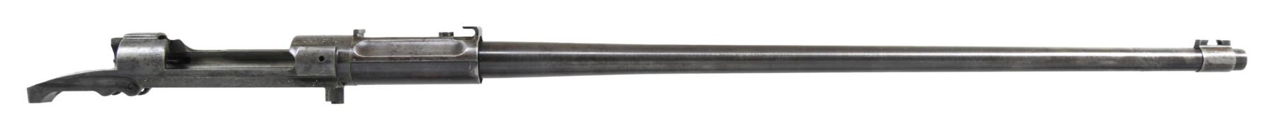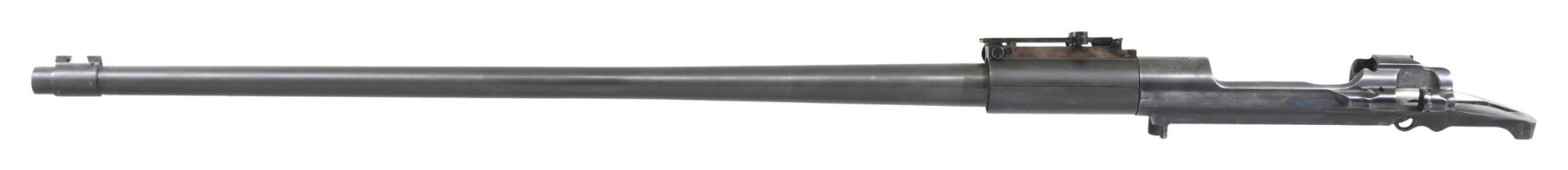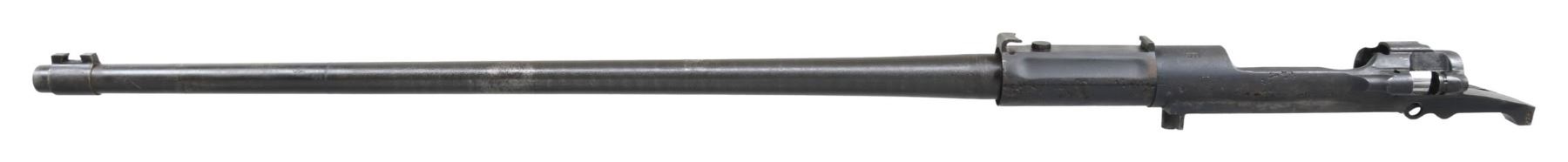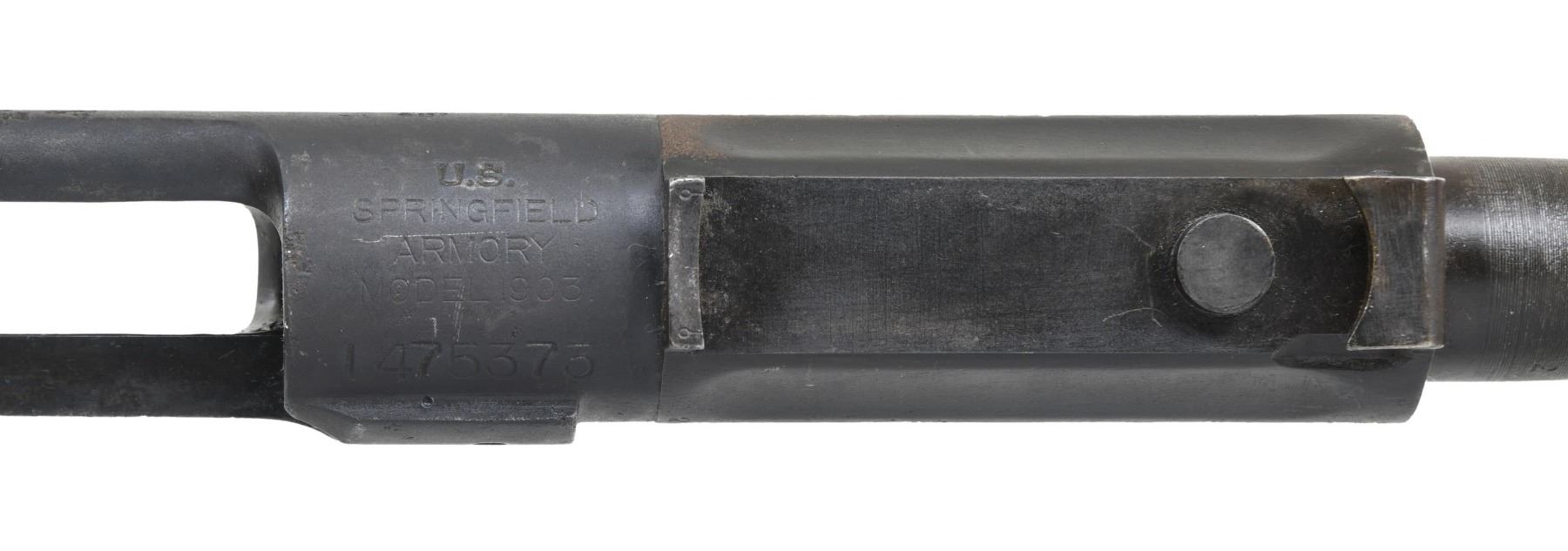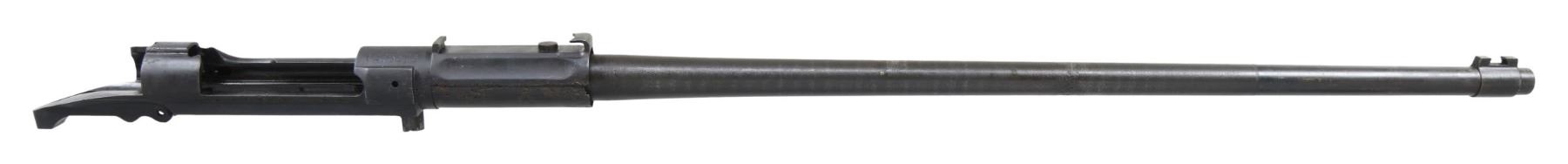 BARRELED RECEIVERS. No.1: Cal. 30-06. S# 507846. Bbl. 24". Marked behind front sight "SA / flaming bomb / 3-12". Bbl. includes rear sight base & front sight fixed base. Receiver manufactured in 1912 includes the cutoff assembly. CONDITION: moderately worn metal retains traces of its original blue finish turning overall gray. Shiny bore w/ lightly worn lands. (25-2917/RW). No.2: Cal. 30-06. S# 1475373. Bbl. 24". Marked behind front sight "SA / flaming bomb / 2-33". Bbl. includes rear sight base & front sight fixed base. Receiver includes no additional parts. CONDITION: heavily worn bbl. & receiver has notable oxidation & pitting. Pitting is primarily below the wood line. Bbl. has well-worn arsenal rework Parkerization. Heavily worn dark oxidized bore. (25-2920/RW). No.3: Cal. 30-06. S# 1265244. Bbl. 24". Marked "HS / flaming bomb / 9 44". Bbl. includes rear sight base w/o lightening cuts. Ladder rear sight w/o volley notch. Fixed front sight base is present. Receiver contains no additional parts. Receiver manufactured 1924. CONDITION: receiver has been reblued & has two added tapped holes on the right side of the bridge for sight mounting. Bbl. retains most of its dark Parkerized original finish. Very good shiny bore. (25-2974/RW). ALL MODERNS. $300-500.