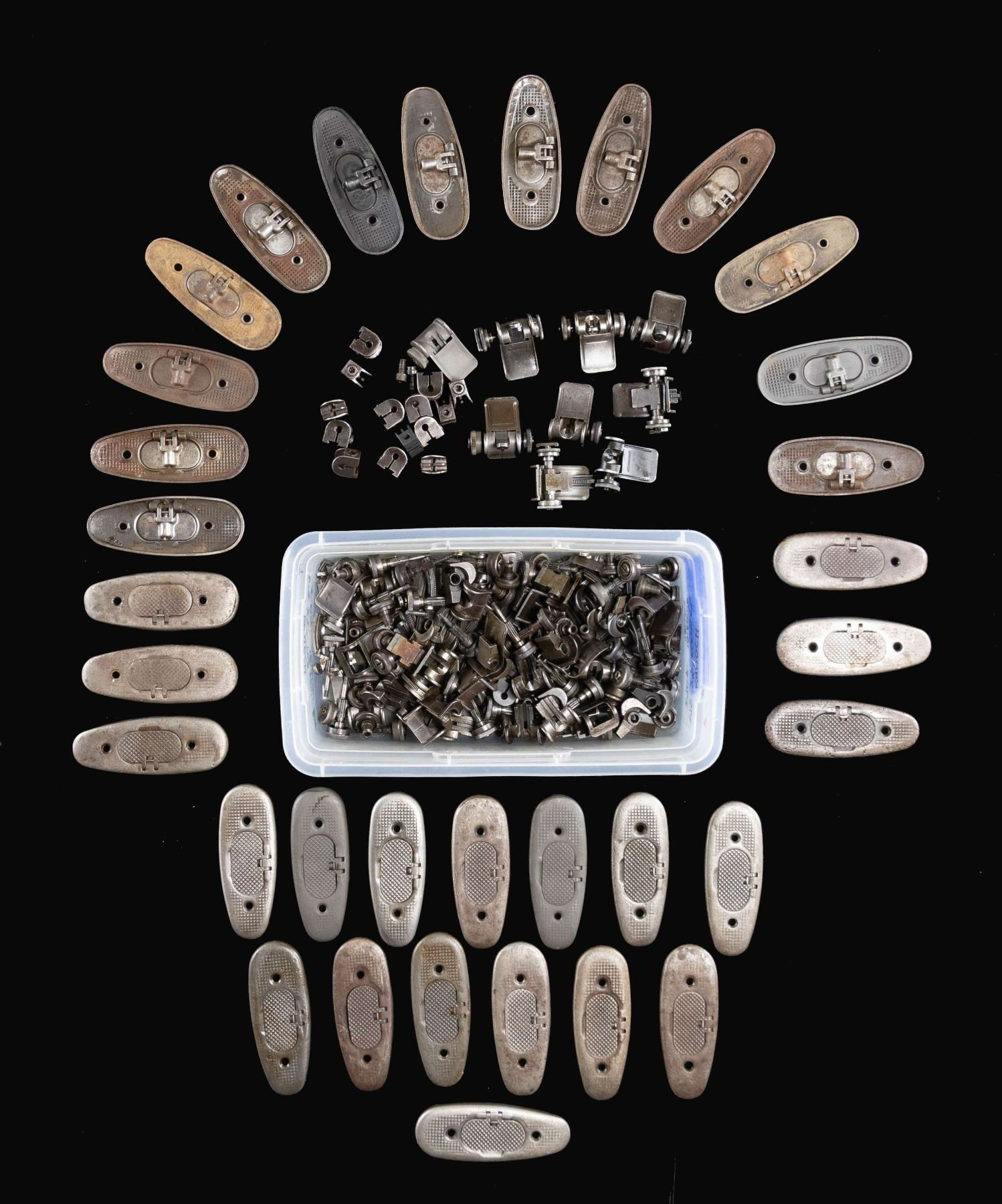 SIGHT PARTS. Lot includes numerous front and rear sight parts. The rear sights include both locking bar & T105E1 types. Parts include elevation, windage knobs, movable sight bases, sight apertures & spring covers. 14 front sights, most w/ retaining screws. CONDITION: most sight parts are worn & may have considerable loss of finish, but most appear serviceable. (02-24590-24/RW). NON-GUN. $500-700.