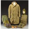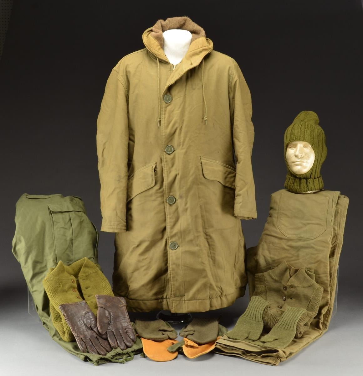 6) GROUP ALSO INCLUDES: 1 Pair of leather faced "trigger finger" mittens & 2 pairs of green wool liners in good serviceable condition. 1 Pair of brown leather dress gloves in well worn condition. 1 Green wool Balaclava full head mask in good serviceable condition w/ scattered sm. insect damage. (02-15916/RW). $800-1,100.