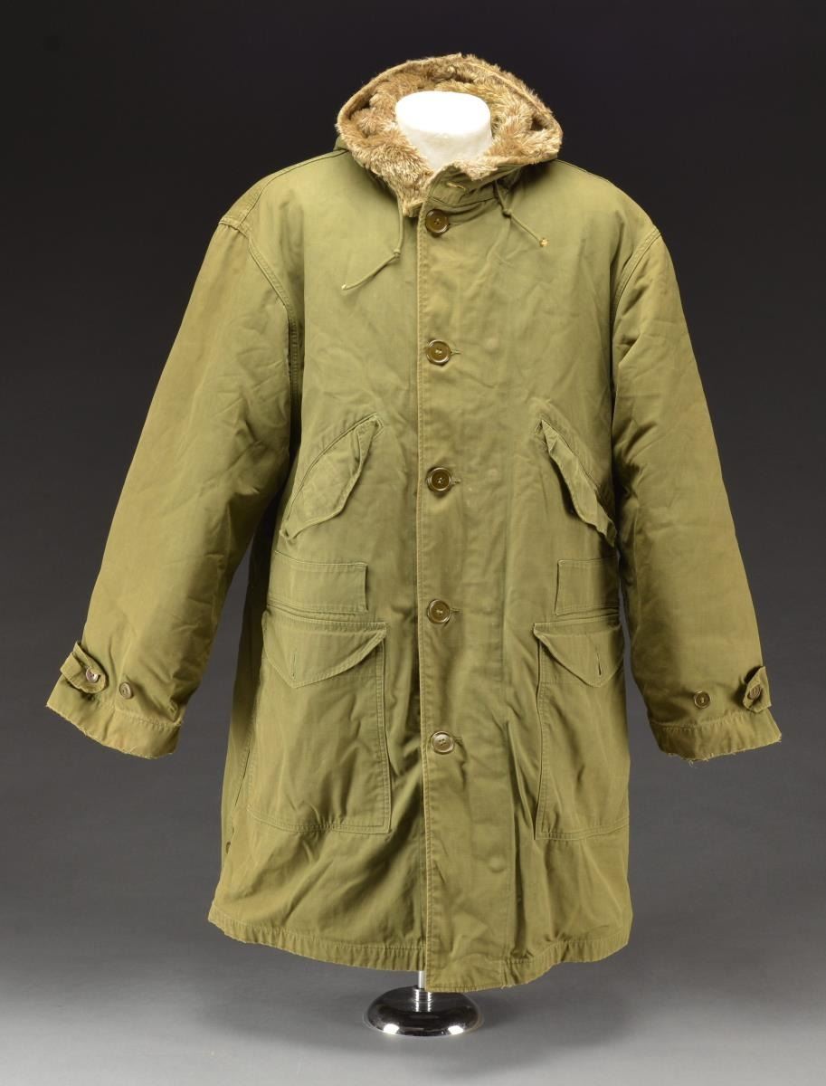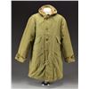 2) COLD WEATHER COAT. Green cotton coat w/ integral pile lined hood. Coat has snap-in pile liner. Button & zipper closure. 1 Lg. cargo pocket & 1 slash type pocket on each side. Coat is unmarked except for size tag (Large). CONDITION: coat has moderate wear, staining & fading. Notable wear around cuffs.