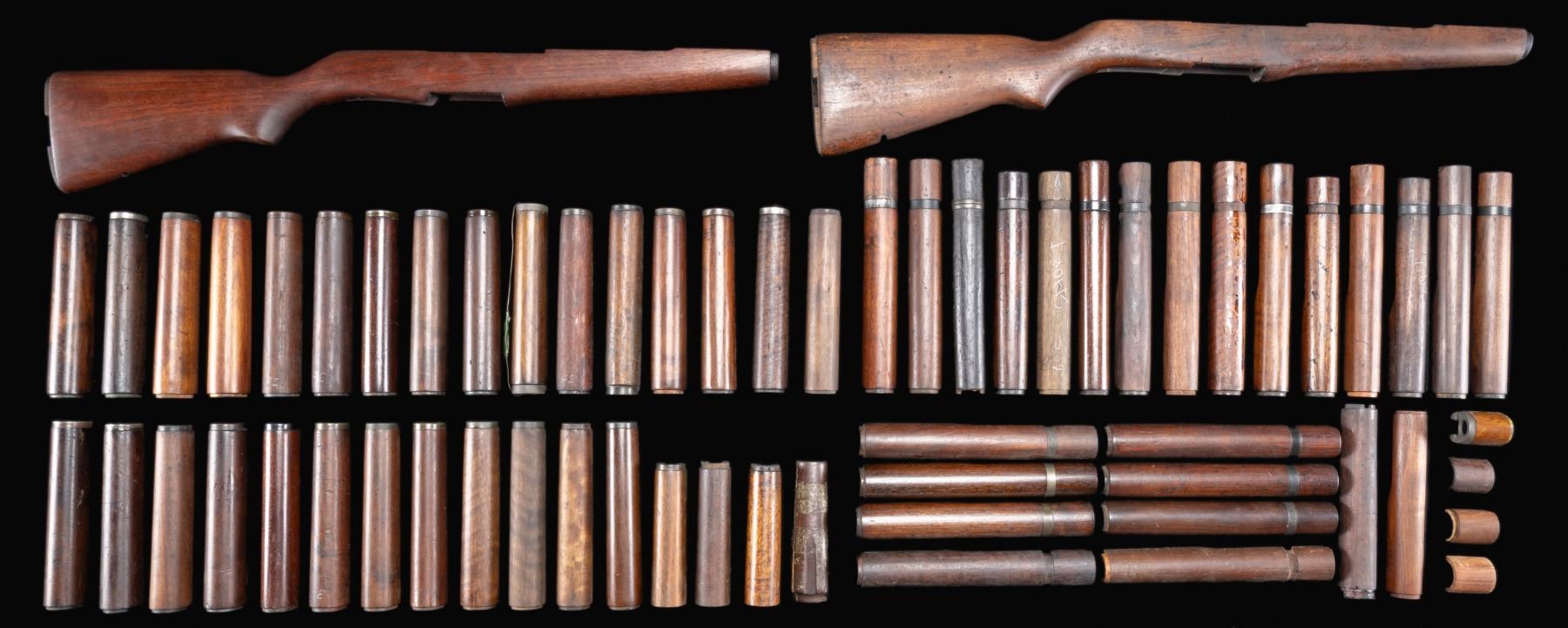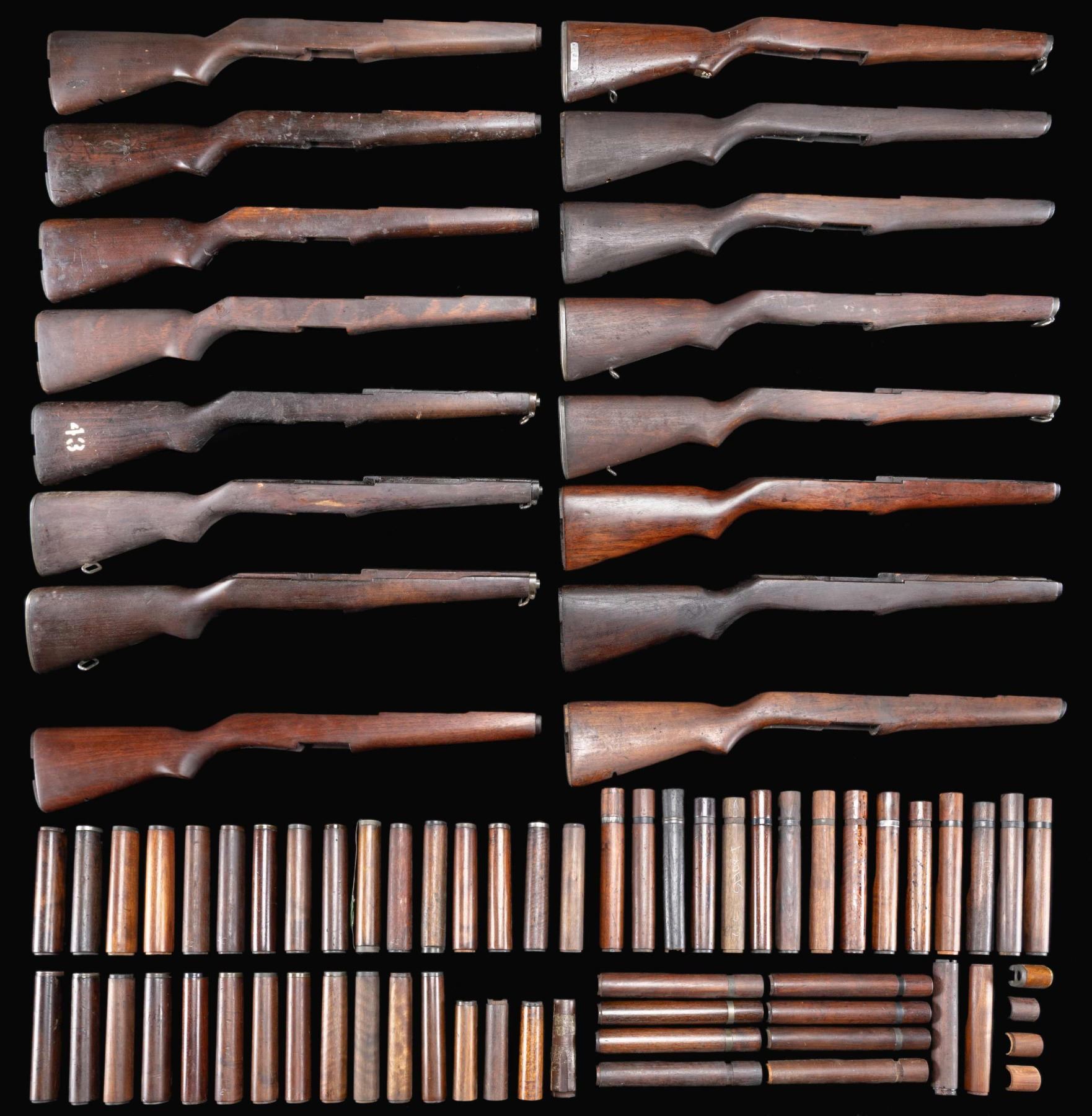 HANDGUARDS AND FRONT HANDGUARDS. 16 buttstocks, 22 rear handguards & 27 front handguards. Stocks & handguards are predominantly from well-used rifles, many will include some or all of their metal parts. Stocks have mostly arsenal rework finishes & may retain traces of their original markings. Many of the rear handguards have retaining clips. The front handguards may retain their ferrules & heat shields. Small quantity of cut & modified handguards included. CONDITION: stocks & handguards range from fair & well-used to very good w/ the wear, staining & handling expected from vintage rifles. (02-24590-39/RW). NON-GUN. $800-1,200.