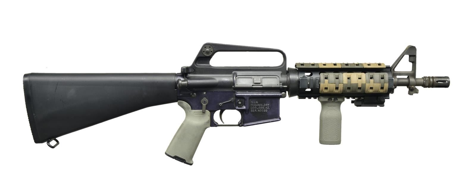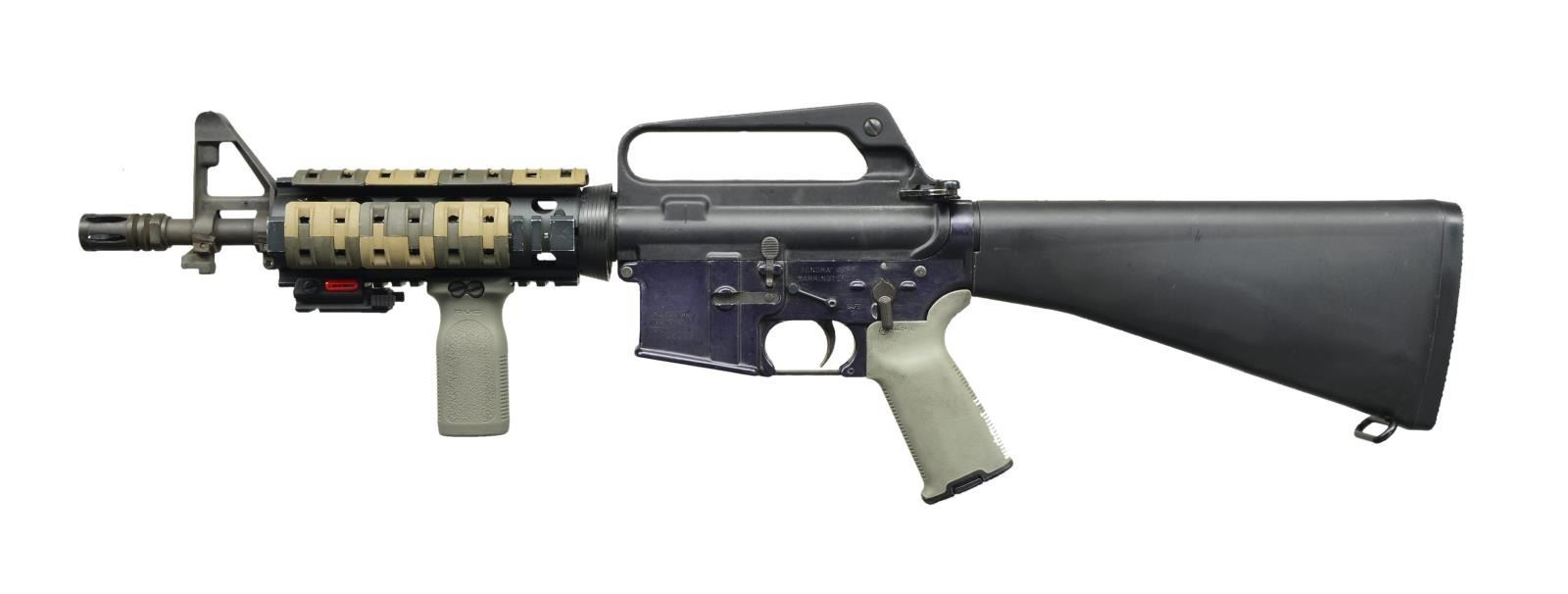 Cal. 5.56x45mm. S# N0025 Bbl. 10". Select fire short-barreled variant of the iconic M16. Built on a Sendra XM-15E2 receiver, converted & registered by G.U.N. Technology of Coolidge, AZ. Threaded barrel terminated w/ A1 flash hider. Traditional protected post front sight / gas block / bayonet lug. 6.5" quad rail front handguard secured w/ tapered delta ring. Currently sporting rail covers as well as a LaserMax red laser & short MagPul MOE vertical grip. Carry handle w/ protected peep rear sight. Round forward assist w/ dust cover. Sendra XM15E2 lower receiver converted & registered by G.U.N. Technology. Ambidextrous safety / selector. Anti-walk pins. Full length A2 buttstock w/ rear storage compartment. Green MAGPUL MOE pistol grip. CONDITION: finish is complete & consistent. Laser works intermittently. Bore is bright w/ worn rifling. Fire control mechanism appears to function correctly when cycled by hand. NATIONAL FIREARMS ACT MG REQUIRING BATF TRANSFER BEFORE TAKING POSSESSION. FULLY TRANSFERABLE. (03-1599/JZ). MODERN, CLASS III. $16,000-20,000.