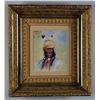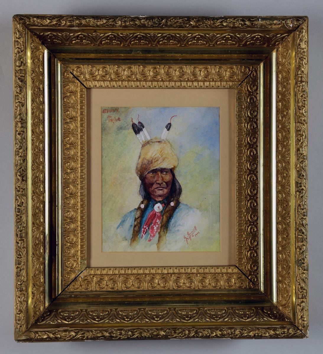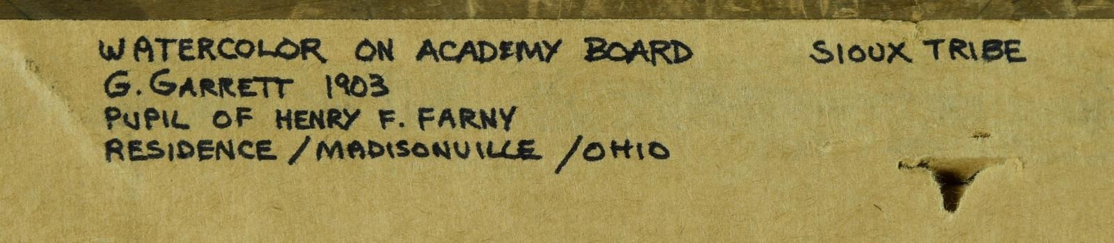 "SIOUX TRIBE". Circa 1903. Watercolor on academy board features a full bust portrait of a Sioux Chief with feathered fur hat, braided hair, red bandana, and blue shirt. Titled upper left, signed and dated "G. Garrett" lower right. Housed in a period gold gilt deep molded frame with gesso decoration, matted under glass. Garrett studied under Farney as an artist. According to family members almost none of his works have been sold. The family continues to retain his works to this day. SIZE: overall 20" x 18 1/2", sight 9" x 7 3/4". CONDITION: watercolor is in original, very good condition overall. Frame with slight losses around edges, otherwise good. (05-877/TG). $2,000-5,000.