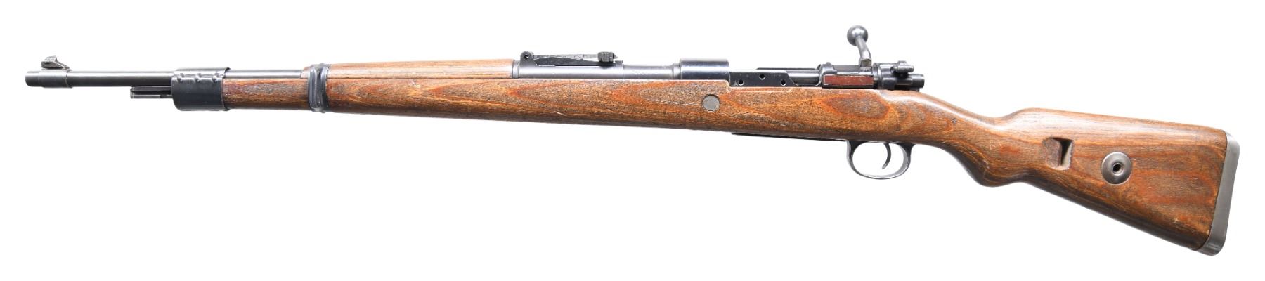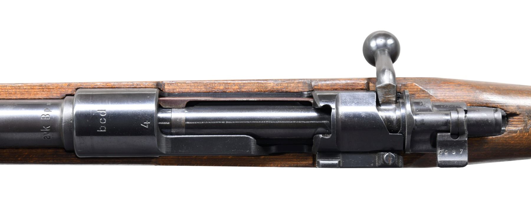 SNIPER RIFLE. Cal. 8x57 (8mm Mauser). S# 14692. Bbl. 23 1/2". Blade front sight without hood. Tangent rear sight graduated to 2000m. All visible parts are unnumbered or mismatched with bolt being scrubbed. Rifle has correct thick sidewall with three holes & was likely an unfinished long side rail example. Bolt has standard K98k safety not sniper "Key" safety. Receiver top marked "bcd 4" for Gustloff Werke. Front of trigger guard has "GERMANY" import marking. Locking screws are missing. Reblued finish. Laminated stock set with left side sling provisions. No cleaning rod present. CONDITION: stock set shows a long laminate split on underside of butt, a couple other laminate cracks, some abrasions around butt, scattered dings & handling marks. Metal retains 90% commercial reblue with some blued over pitting, edge wear, fading & light oxidation. Action functions properly when hand cycled. Worn pitted poor bore. (25-490/MJC). CURIO. $1200-1800.