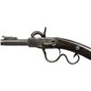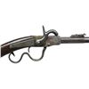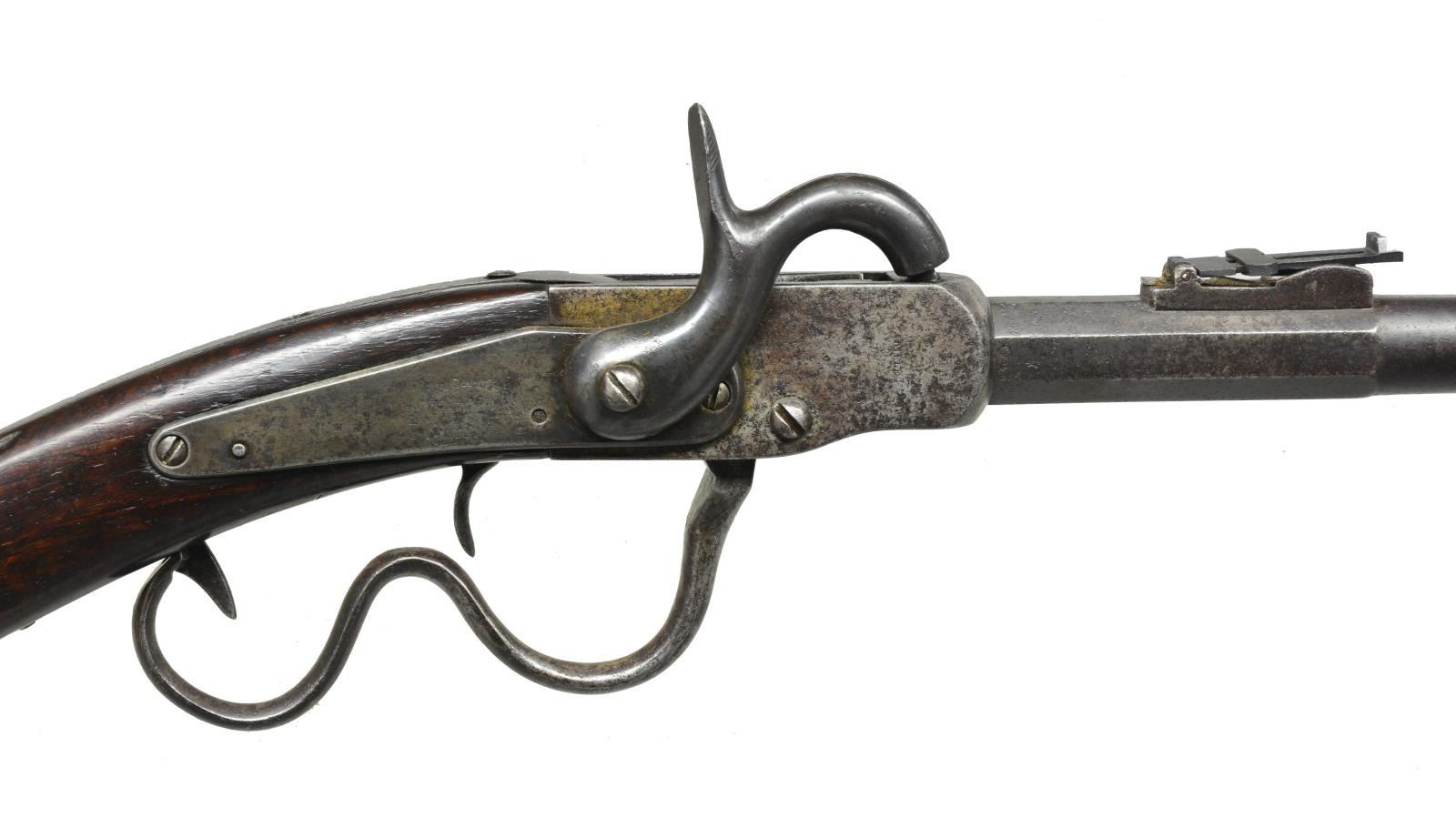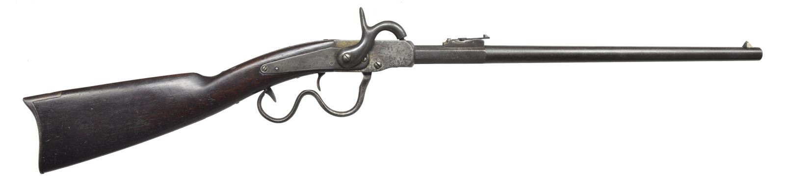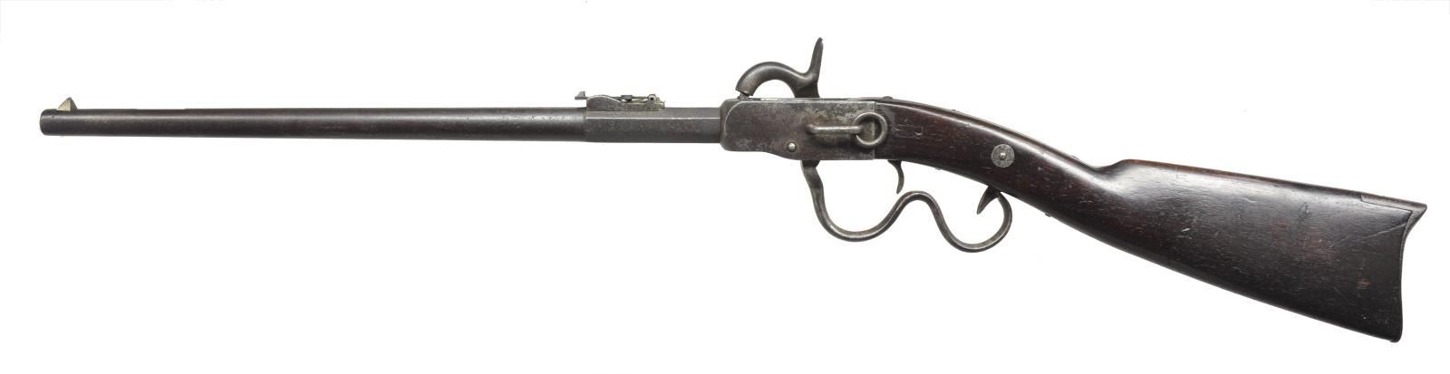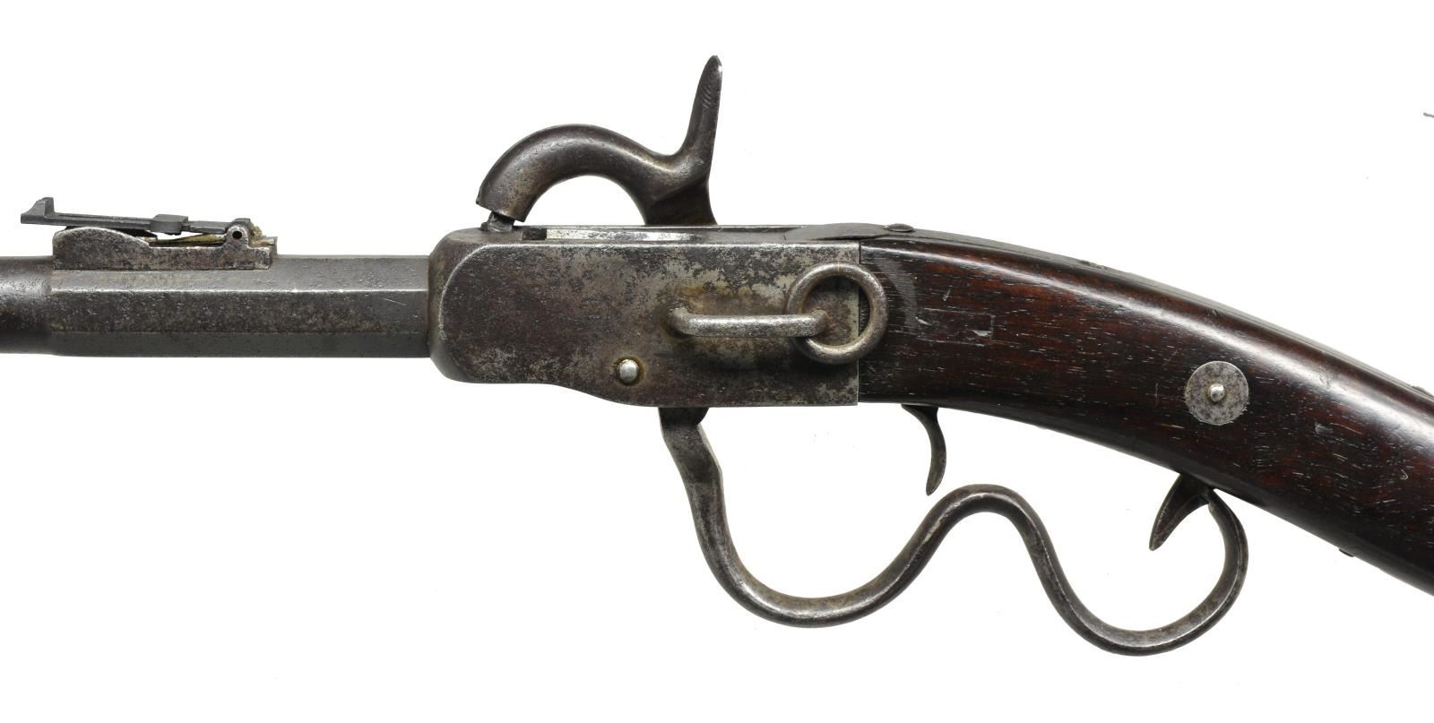 Cal. 52. S# 1638. Bbl. 20" rnd. w/ oct. shank. Blade front sight & graduated leaf rear sight. Breech loading percussion action operated by curved serpentine lever giving it the "Grapevine" nickname. Left side of action has saddle ring & bar. Walnut stock w/ steel buttplate. Total of 8,200 mfg. 1863-1864. CONDITION: metal has faded brown appearance w/ scattered pitting. Stock has age darkened appearance showing scratches & marks. Functioning action. Bore retains strong rifling. (01-19107/DS). ANTIQUE. $1,500-2,000.