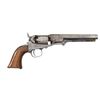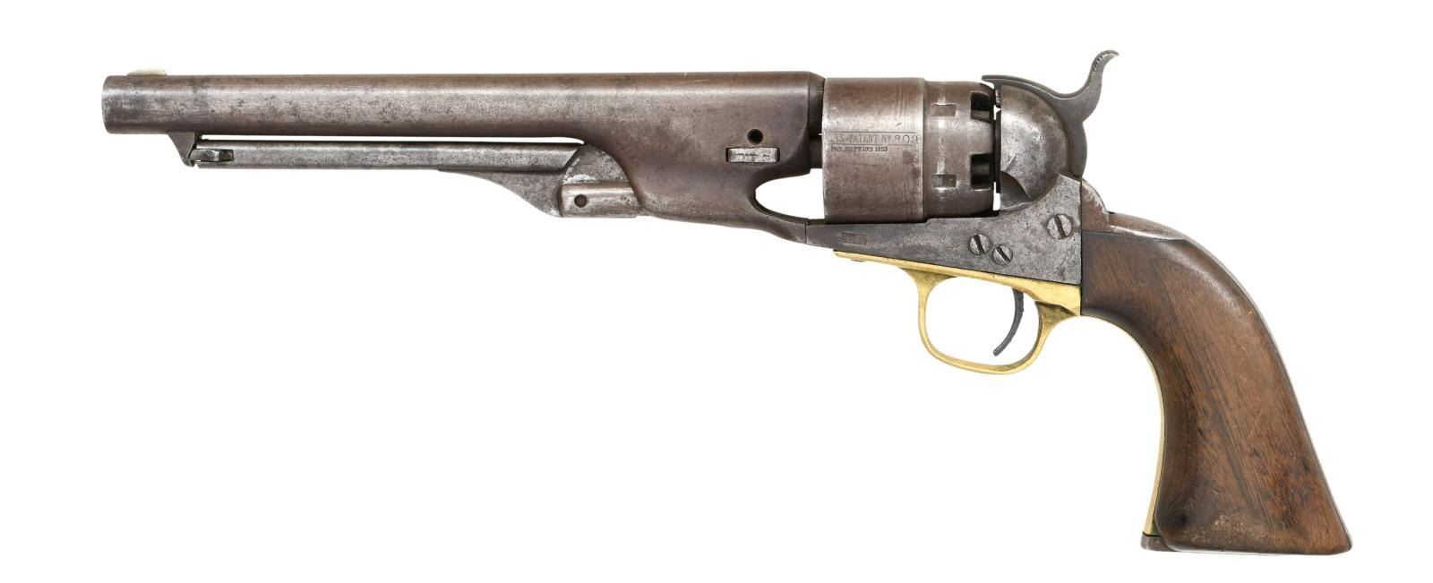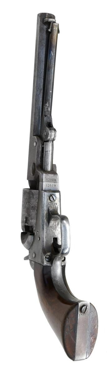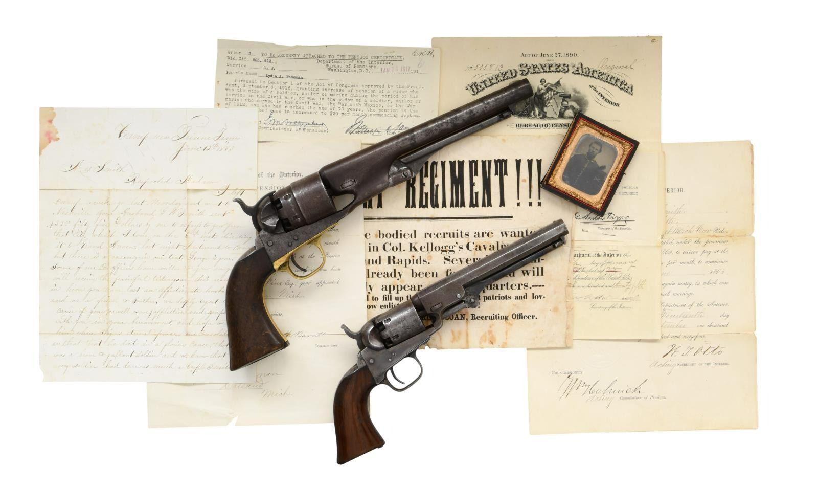 FRANKLIN, TN 1863 ARCHIVE. This lot consists of two Colt pistols, small recruiting broadside, ambrotype of Smith in uniform, letter written to his widow by a member of his company just after his death stating "…that he died in a glorious cause, that he was a brave and gallant soldier….". Also included in lot are various pension papers for his widow Lydia. 1. Ninth plate Ruby ambrotype of 26 year old G W Smith wearing his cavalry shell jacket with shoulder scales, holding his Hardee hat with crossed saber insignia and "2" over "D". CONDITION: Very good overall, good detail, Insignia very crisp. Buttons, Jeff Davis hat pin, crossed saber insignia, uniform piping, and shoulder scales are gilded. Images held by 1/2 case. 2. Recruiting broadside, 10.5" x 7.5" "Col. Kellogg's Cavalry Regiment" CONDITION: good overall, reductions on edges, soiled, stained. 3. Colt model 1860 army revolver, S# 68025 (44cal), standard configuration of military issue, one line New York address. We are not sure how an army issued revolver was retained by his widow, but that is the story. The revolver is personalized by cutting bottom of grips for a lanyard. CONDITION: fair to good overall, markings good, serial numbers all matching, wedge was not removed but is broken or replaced, metal overall uncleaned with gray/brown patina, mechanics are good, good rifled bore. 4. Colt London model 1849 pocket model, S# 10629 (31cal), 6" barrel. This revolver was made in 1856 In standard configuration with two line London address. CONDITION: very good overall, traces of blue, case colors, & silver, retains most of its original varnish on grips. The loading arm pivot is broken. Mechanically fine with good crisp bore. 5. Letter written June 12th 1863 from Triune TN to George's widow a week after he was killed by Chester E. Shrader, Co. D, 2nd Michigan Cavalry, George's unit. CONDITION: complete, easily discerned, cracked at folds. 6. 4 pension documents for Lydia A. Smith, George's widow. George is buried at Stones River National Cemetery, Murfreesboro, TN, grave # 3139. (01-23963/JS). ANTIQUE. $3,000-4,000.